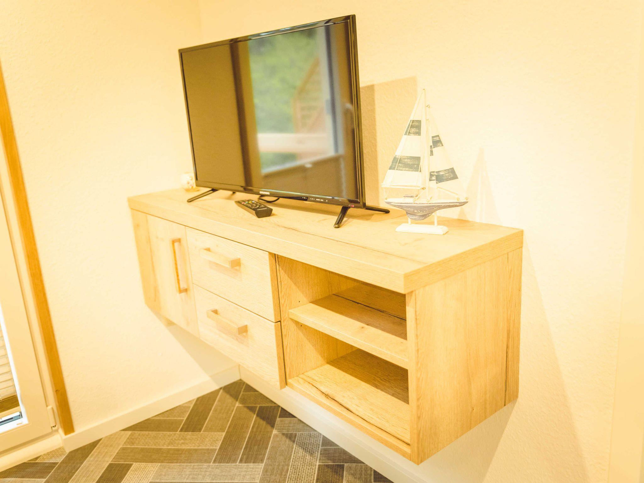 gut ausgestattete Pantryküche mit Herd, Wasserkocher, Toaster, Gläser, Geschirr, Besteck, Kaffeemaschine, Kühlschrank, Fernseher, Radio, Kinderreisebett & Hochstuhl