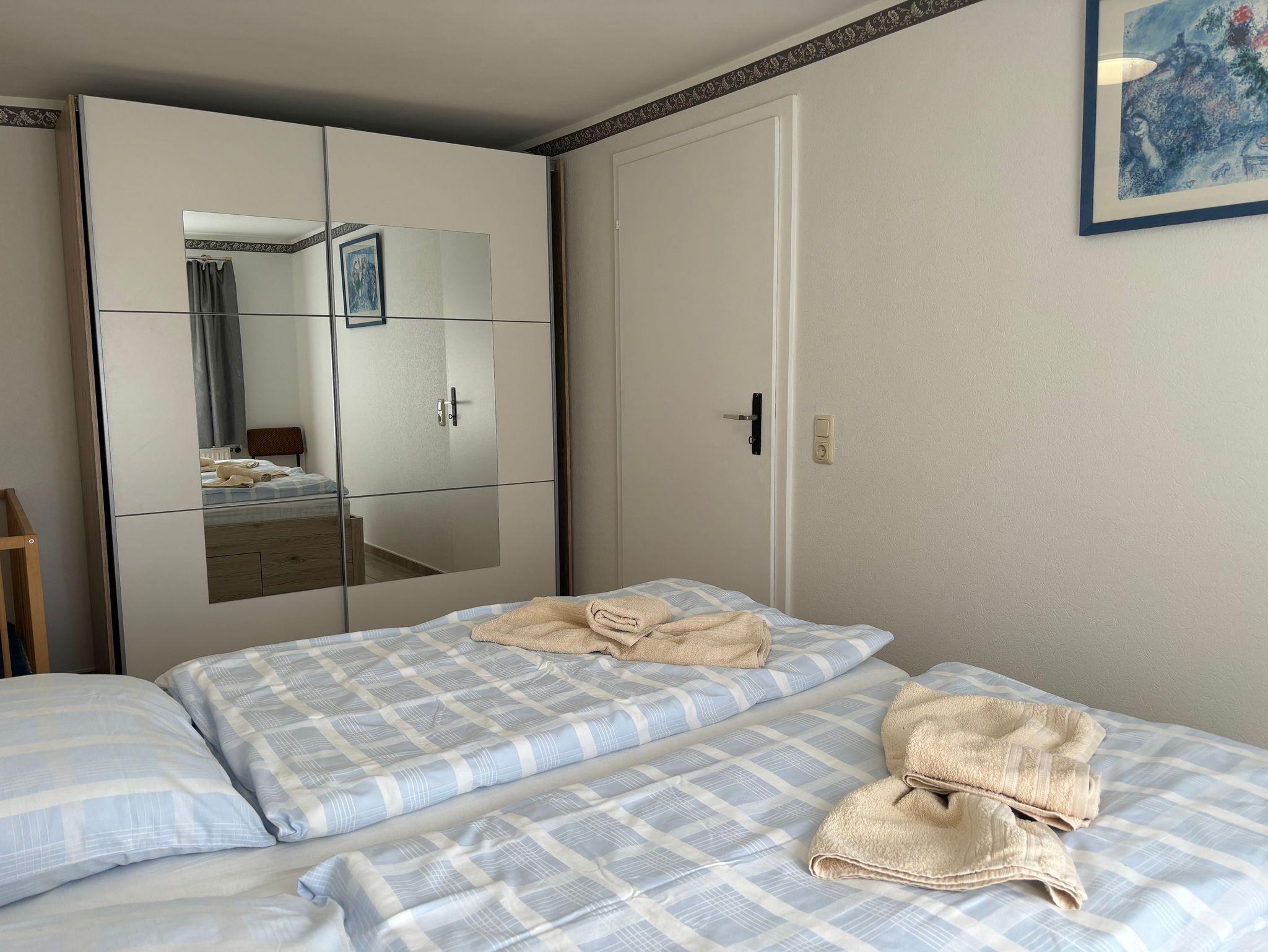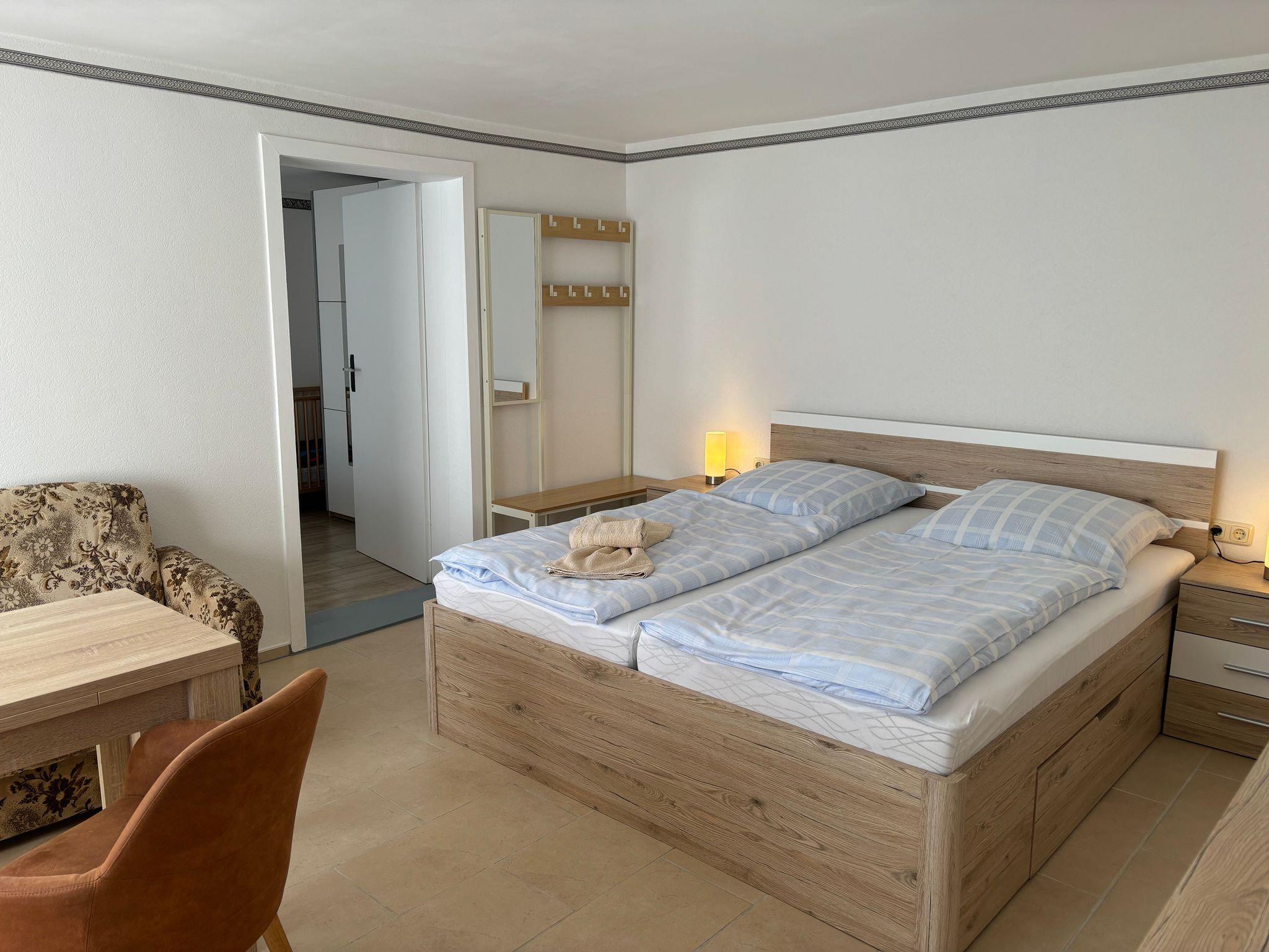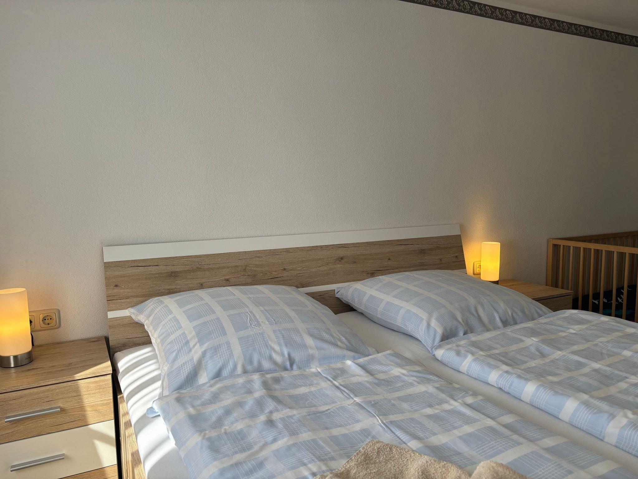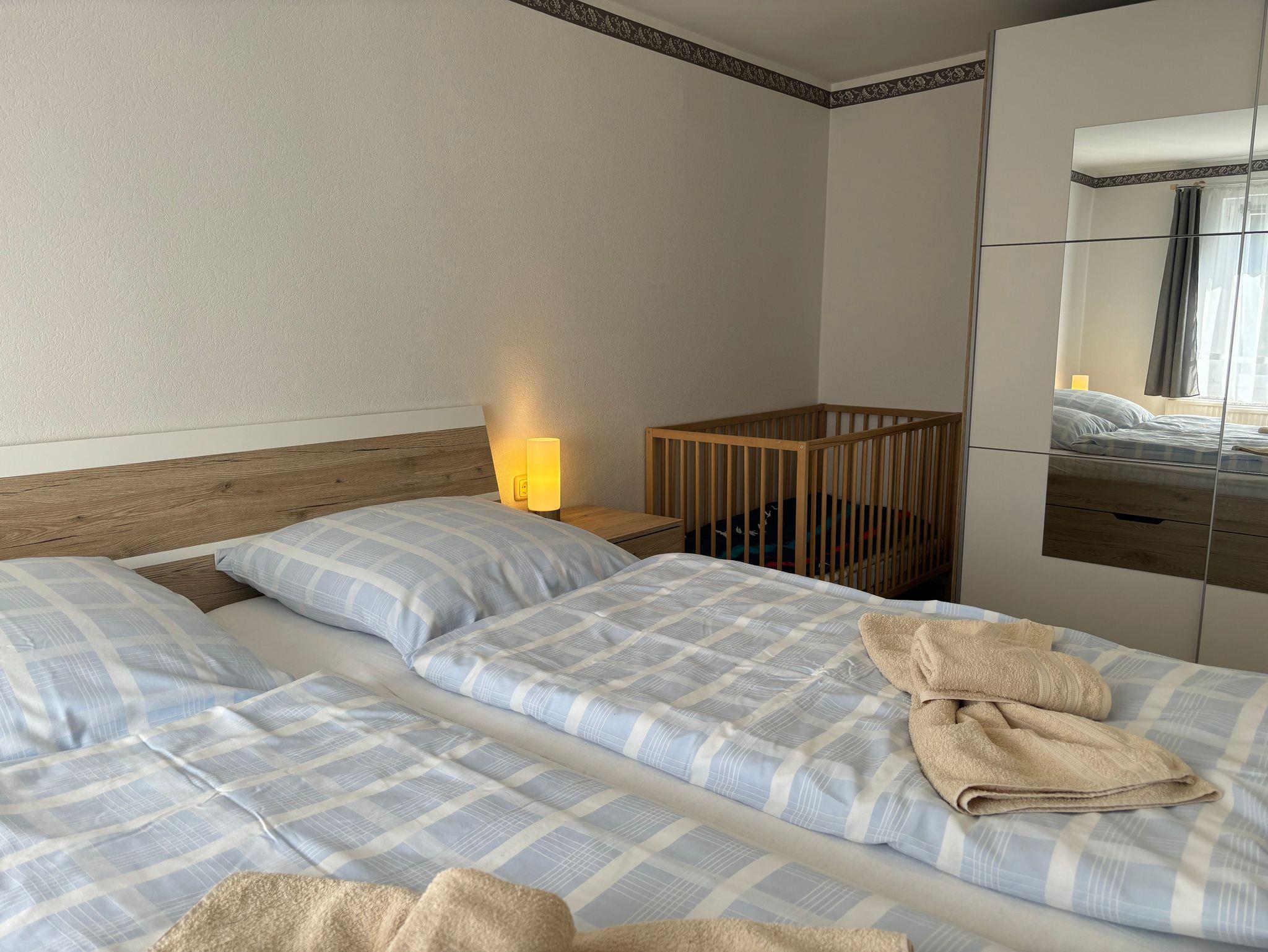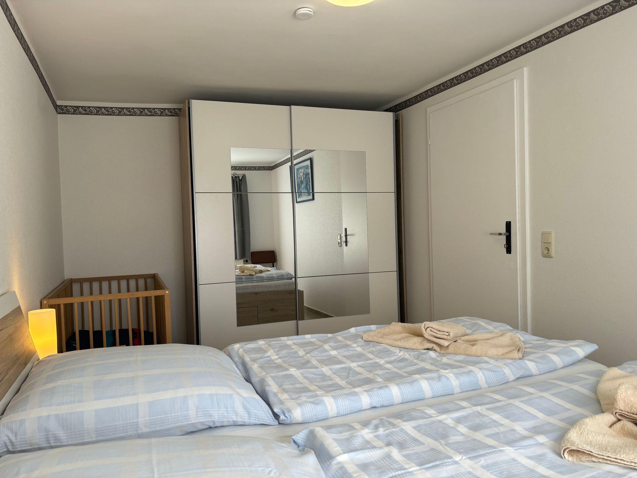 Das Schlafzimmer ist mit einem gemütlichen Doppelbett, Babybett und Kleiderschrank ausgestattet.