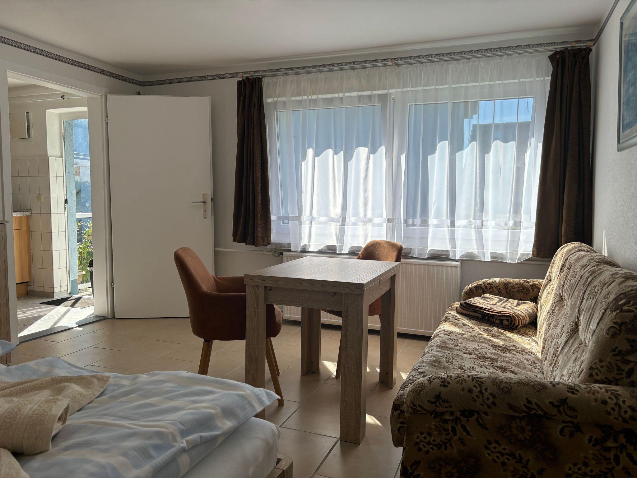 Der Bungalow befindet sich auf dem Grundstück der Vermieter und verfügt über ein Schlafzimmer, sowie über einen kombinierten Wohn- und Schlafraum.