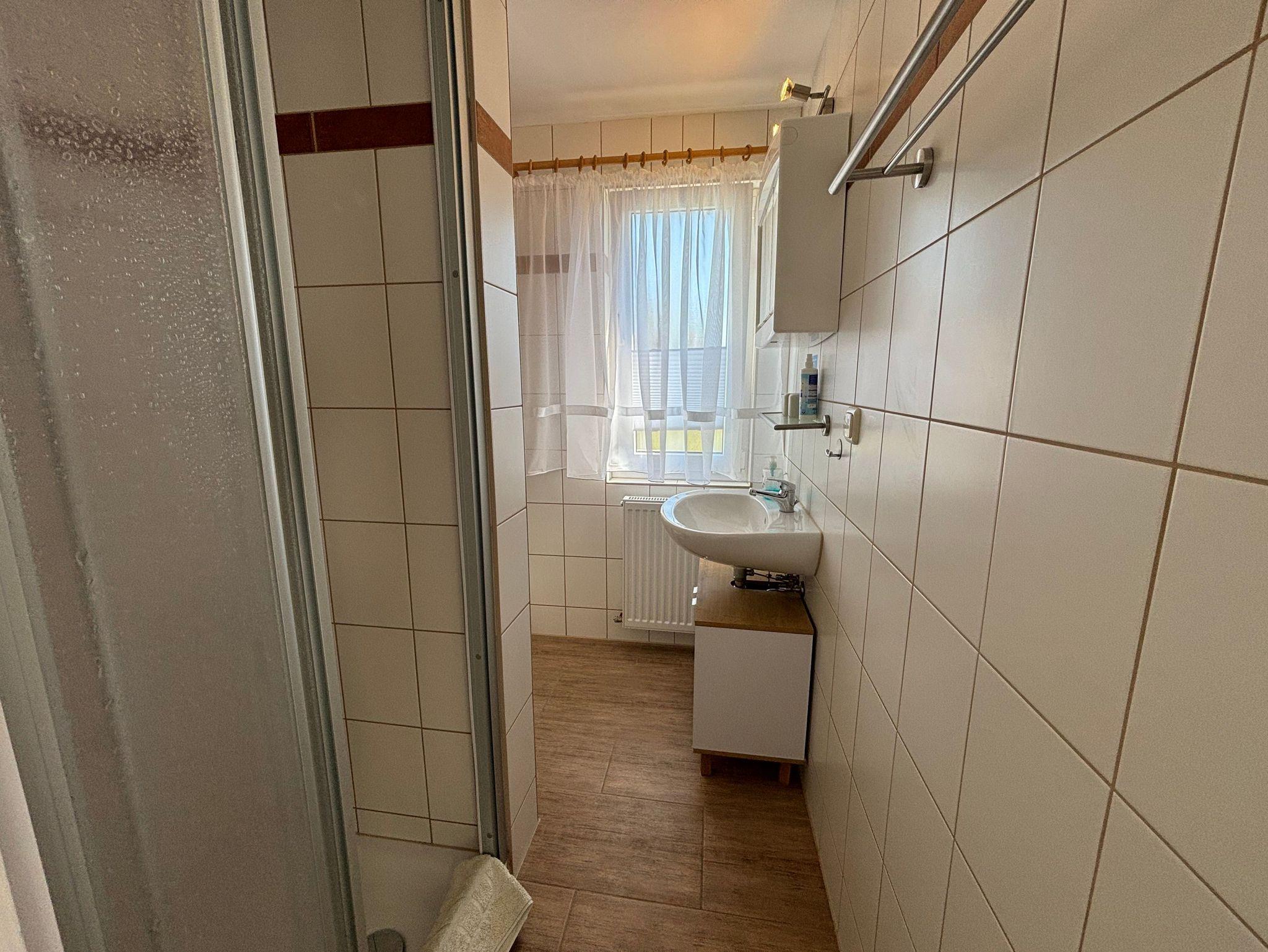 Das Badezimmer verfügt über eine ebenerdige Dusche.