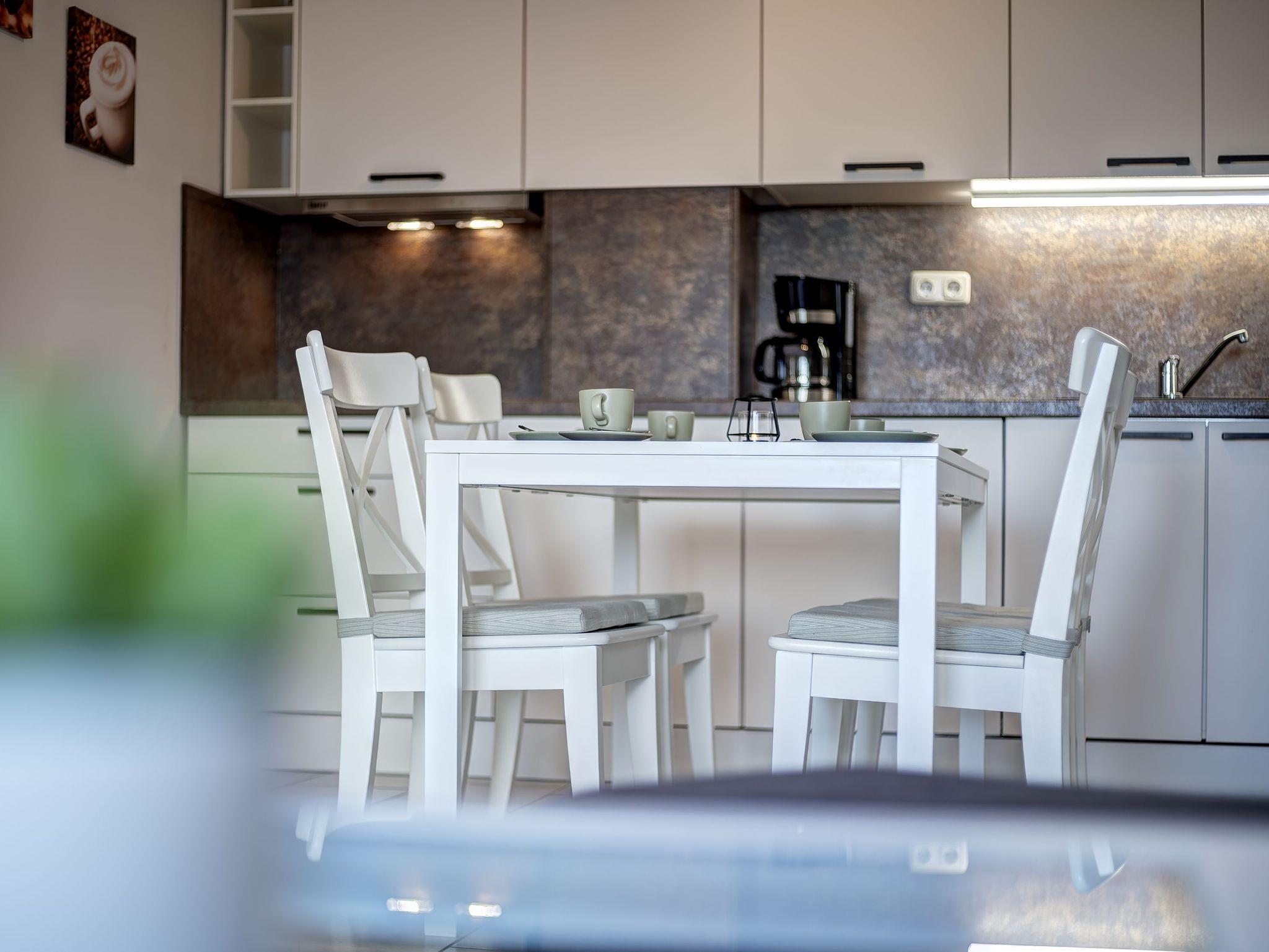 Im jeweils großzügigen Wohn-/Esszimmer finden Sie eine gemütliche Couchecke und einen schönen Essbereich. Die komplett ausgestattete Einbauküche verfügt über Spülmaschine, Induktionskochfeld mit Dunstabzugshaube, Kühlschrank mit Gefrierfach, Kaffeemaschine, Toaster und Wasserkocher.
