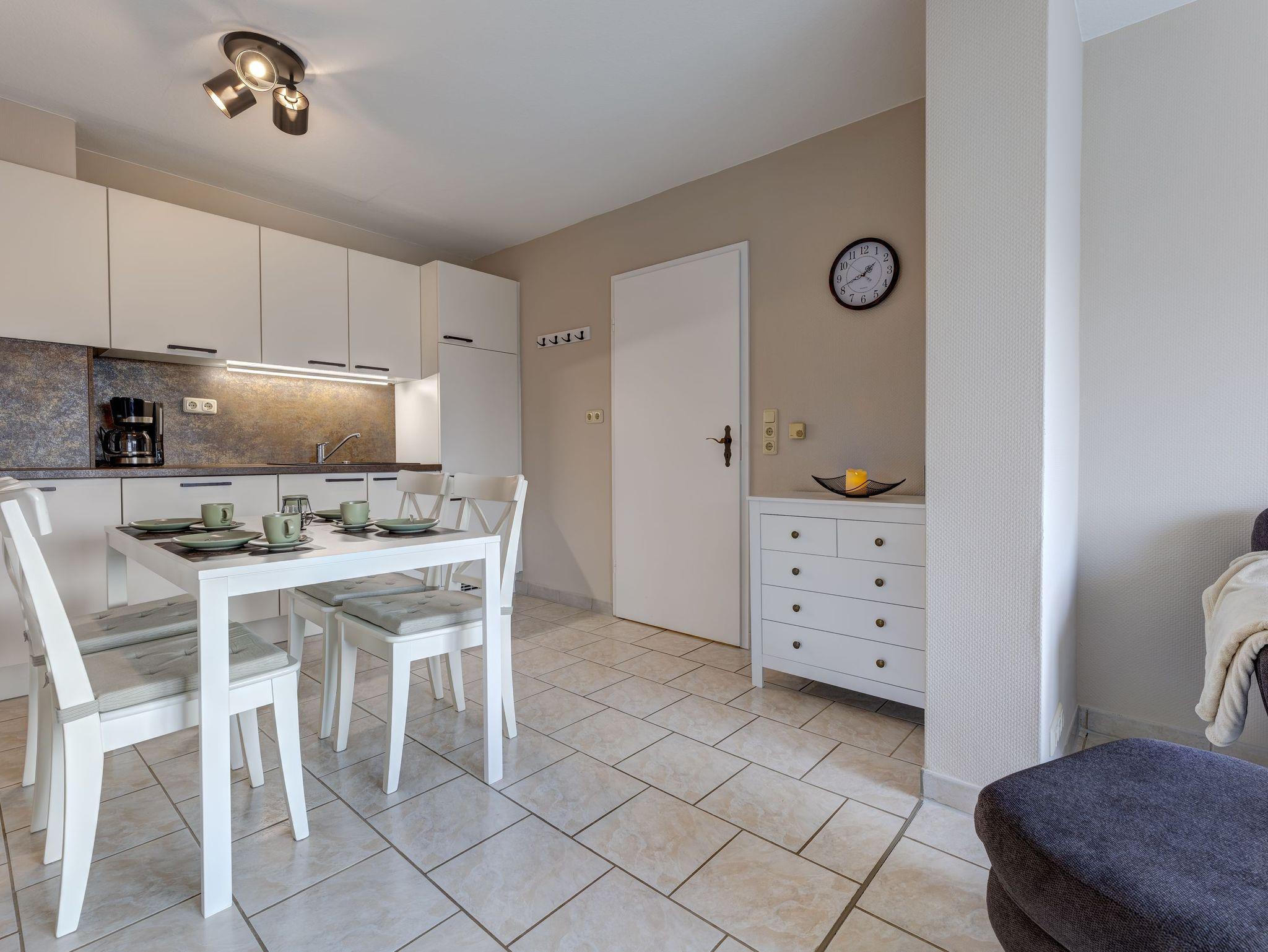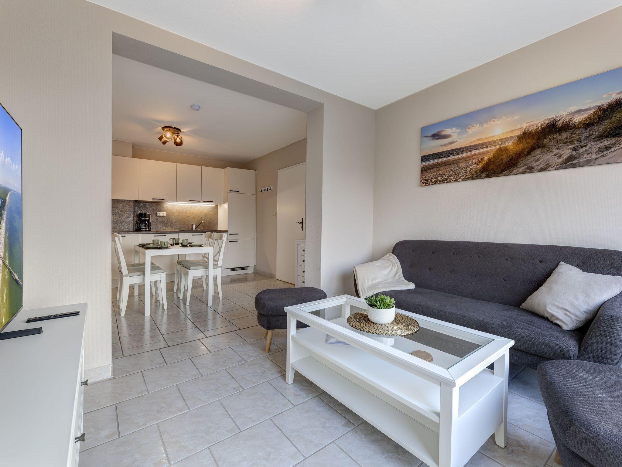 Sie verfügt über Fußbodenheizung, ein kombiniertes Wohnesszimmer mit offener Küche, ein Schlafzimmer mit Doppelbett und Einzelbett sowie einem Duschbad.