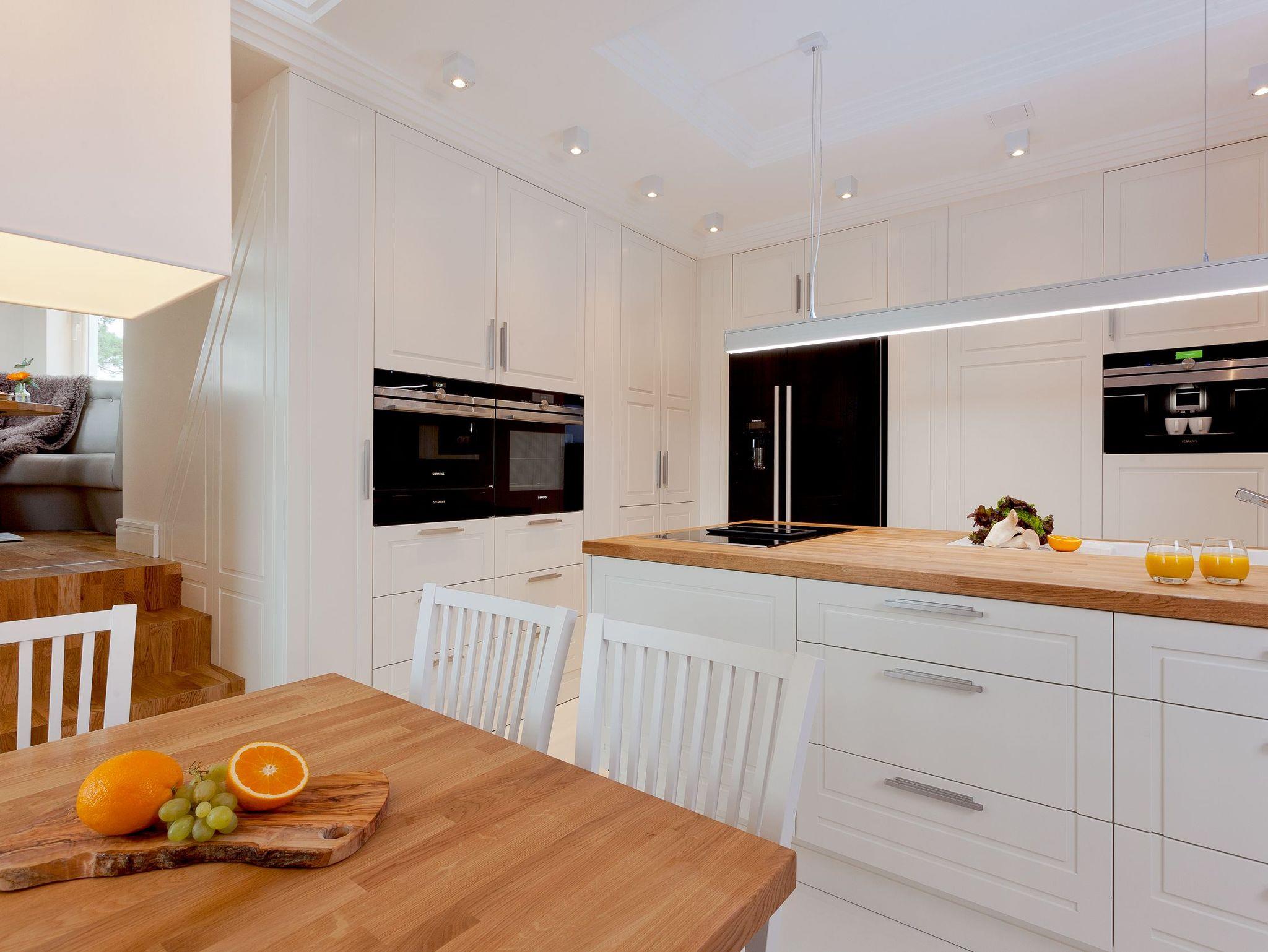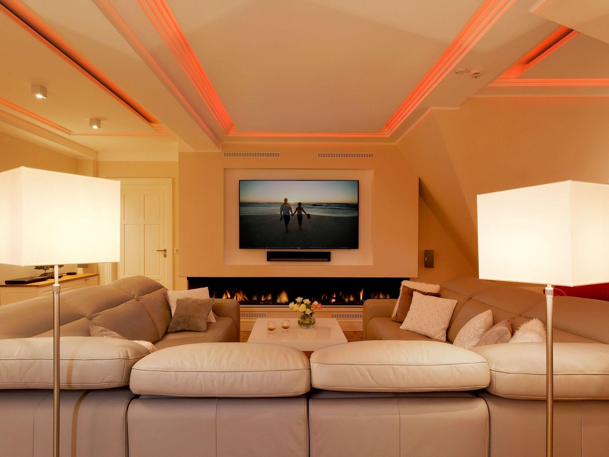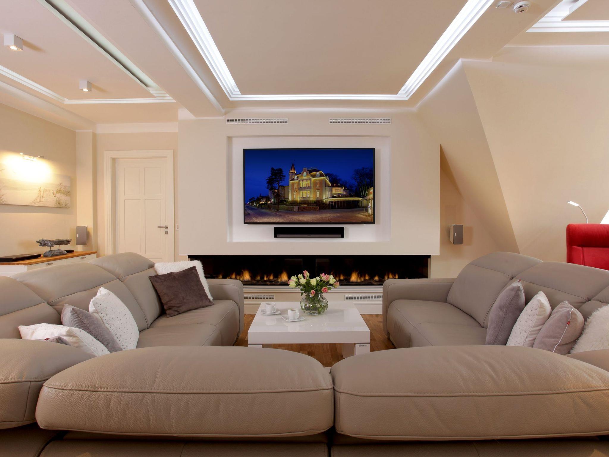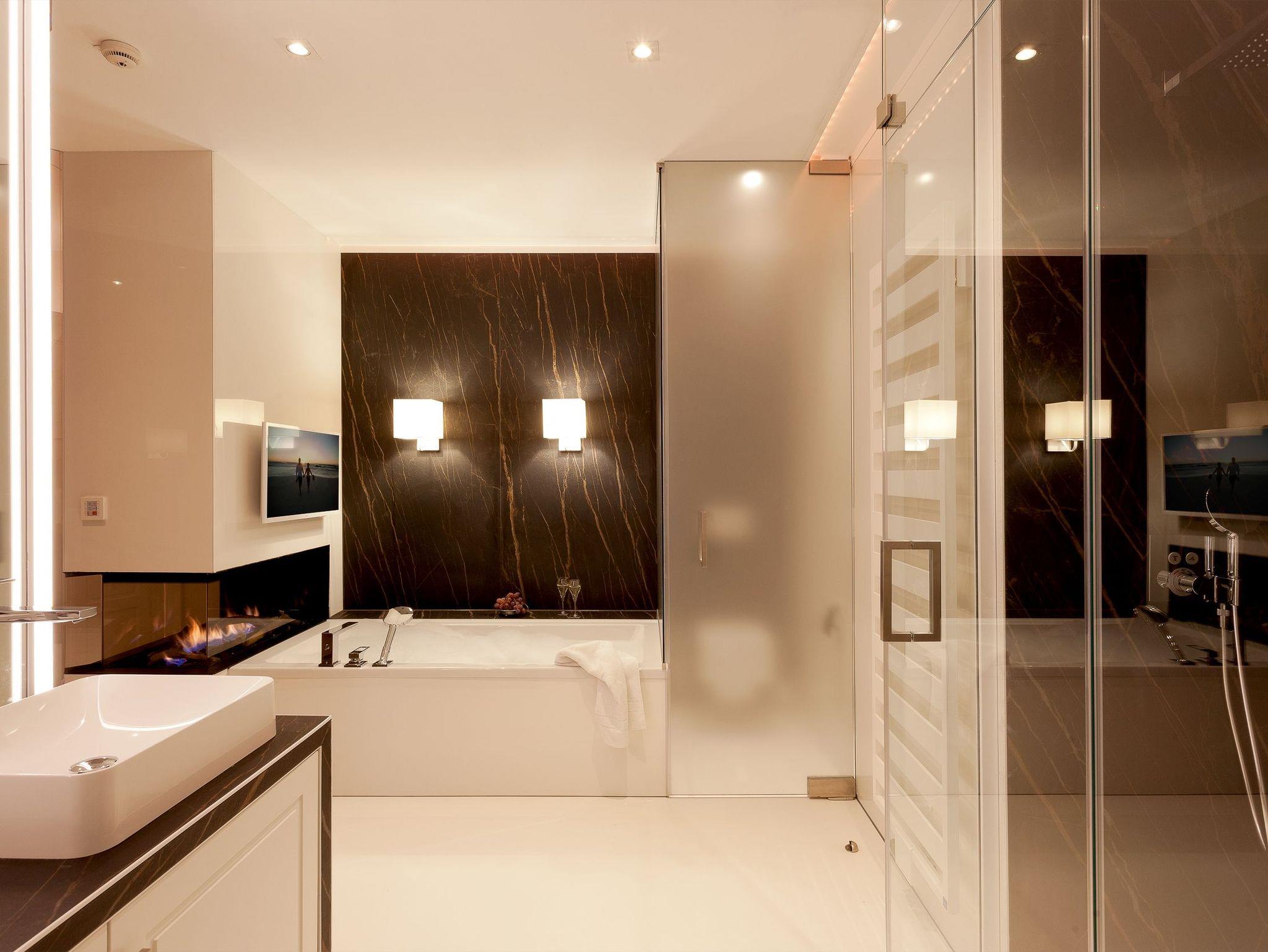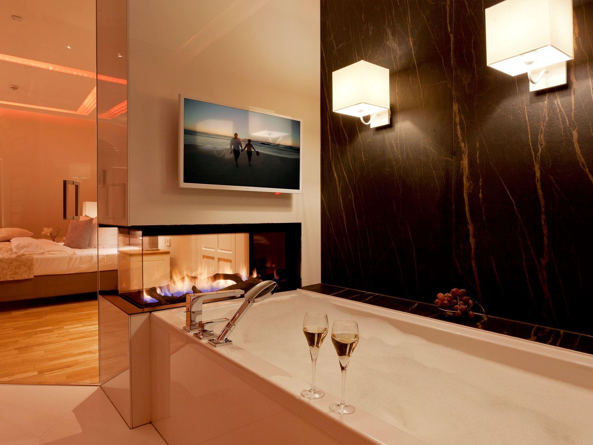 Die Suite verfügt über raffinierte Stuckelemente soweit das Auge reicht sowie über ein einzigartiges Lichtspiel. So lässt sich per Knopfdruck die Lichtszene Ihrer Wahl einstellen. Der Wohnbereich ist mit einem XXL-Relaxsofa, einem großen Flat-TV sowie einem gigantischen Gaskamin ausgestattet. Die integrierte Küchenzeile lässt mit Kaffeevollautomat, amerikanischem Kühlschrank (inkl. Eiswürfelspender), Induktionskochfeld mit eingelassener Abluft, [nbsp]Backofen, Mikrowelle, Geschirrspüler und Esstisch für 8 Personen keine Wünsche offen.