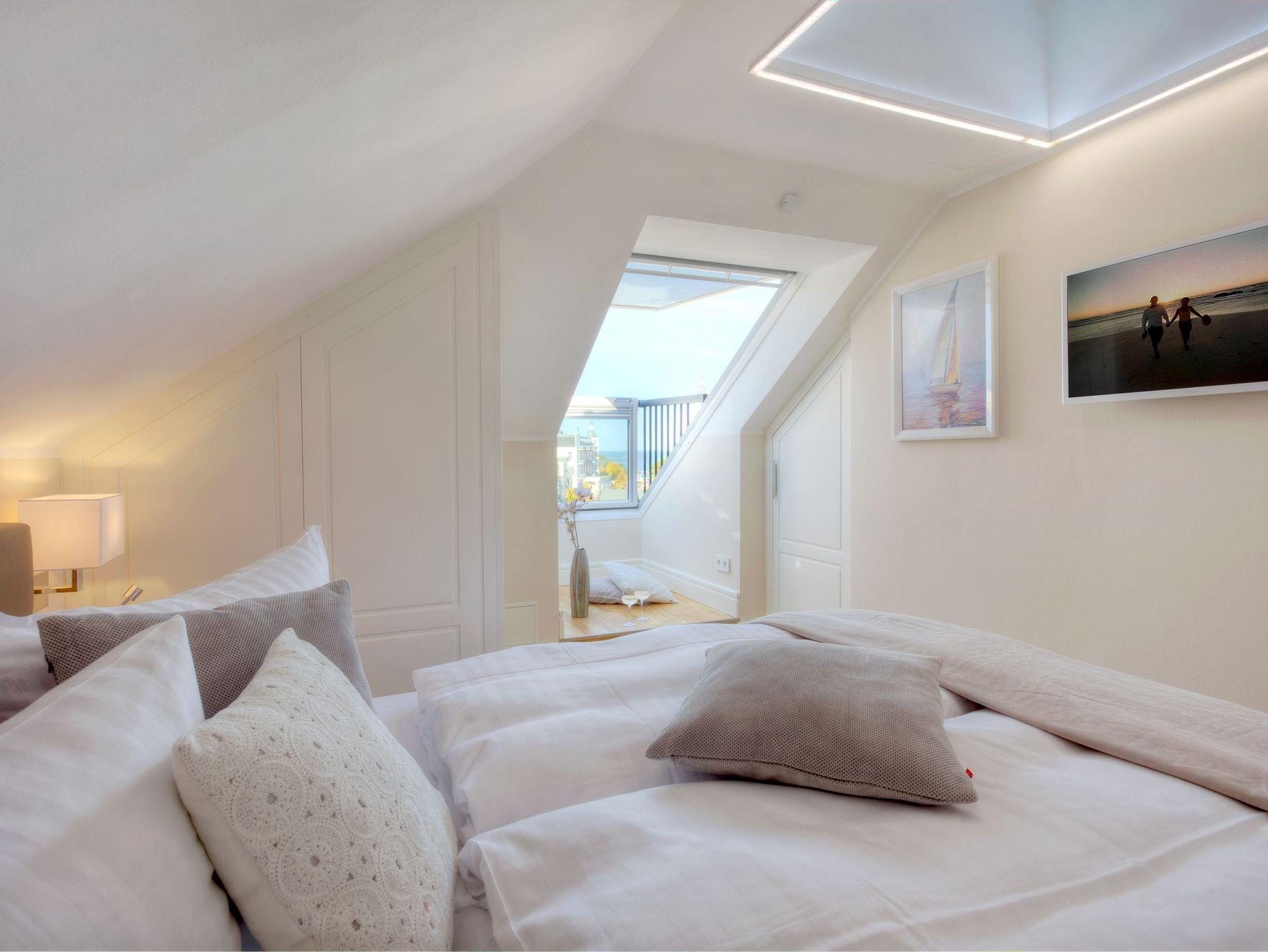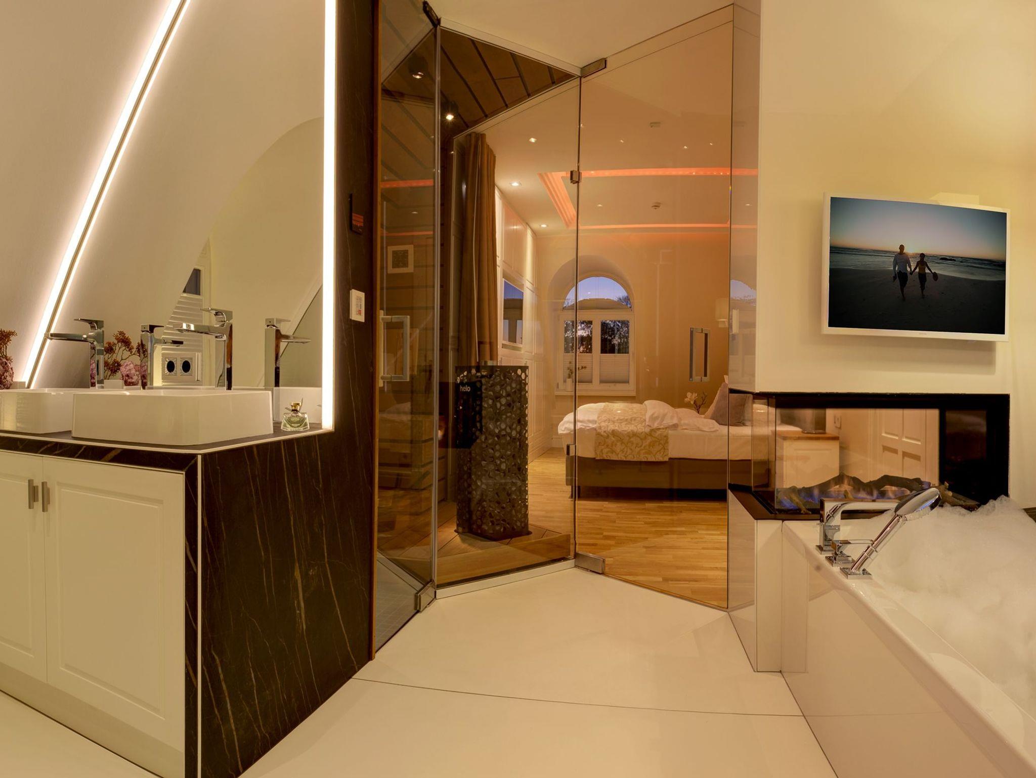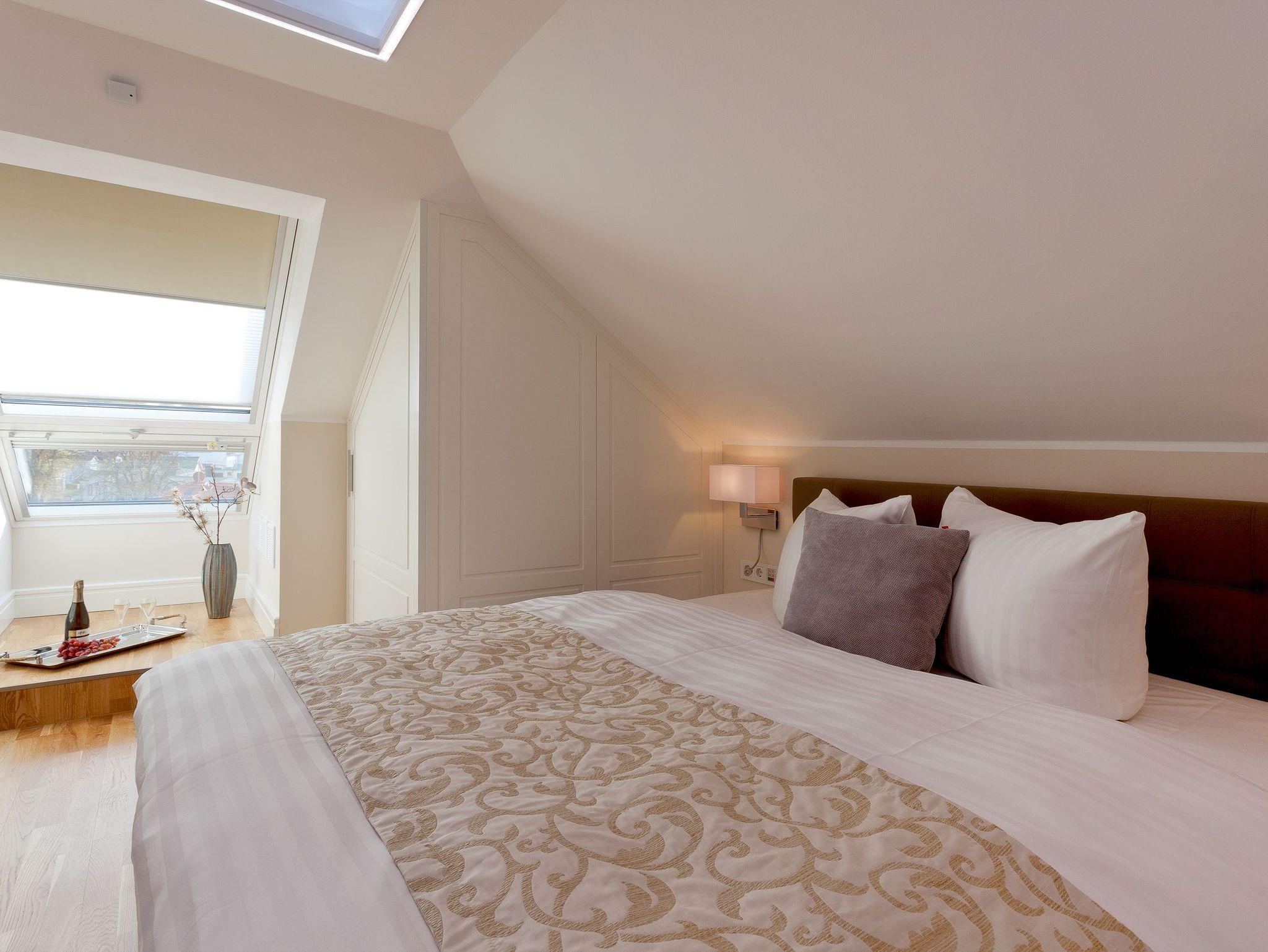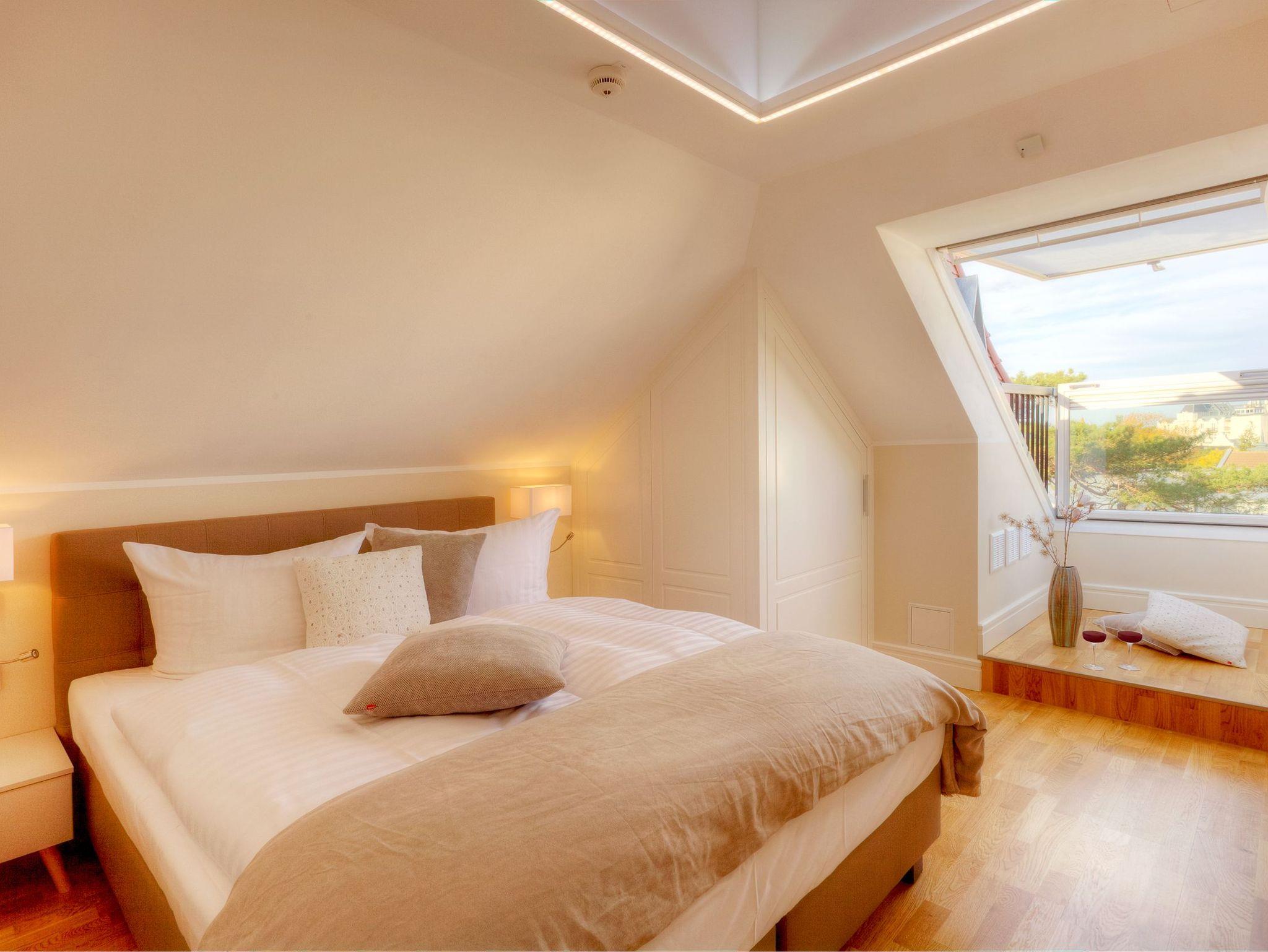 Luxuriöse Präsidentensuite in der Villa Gruner auf Usedom mit Dachterrasse, Sauna und Whirlpool für unvergesslichen Komfort.