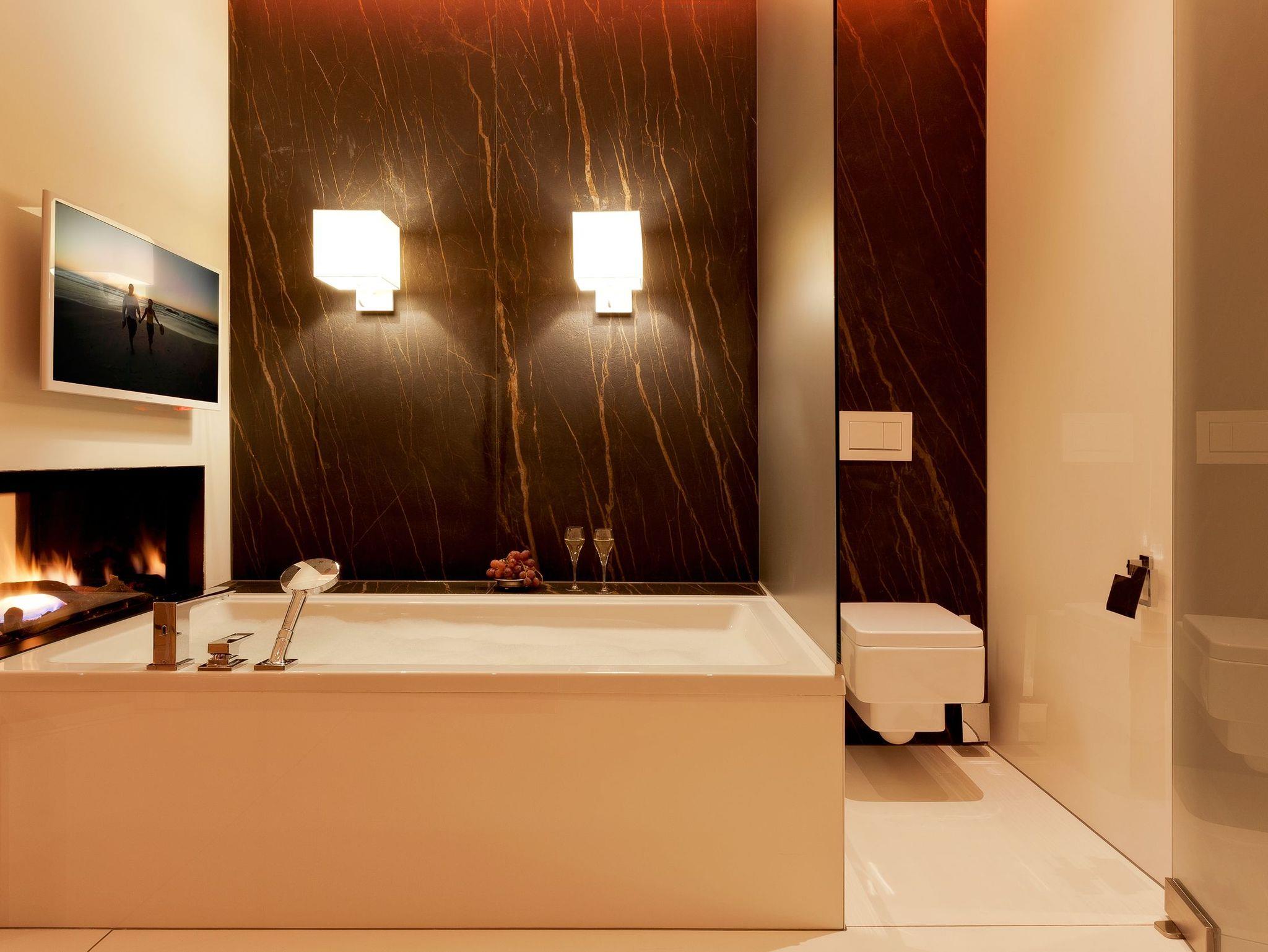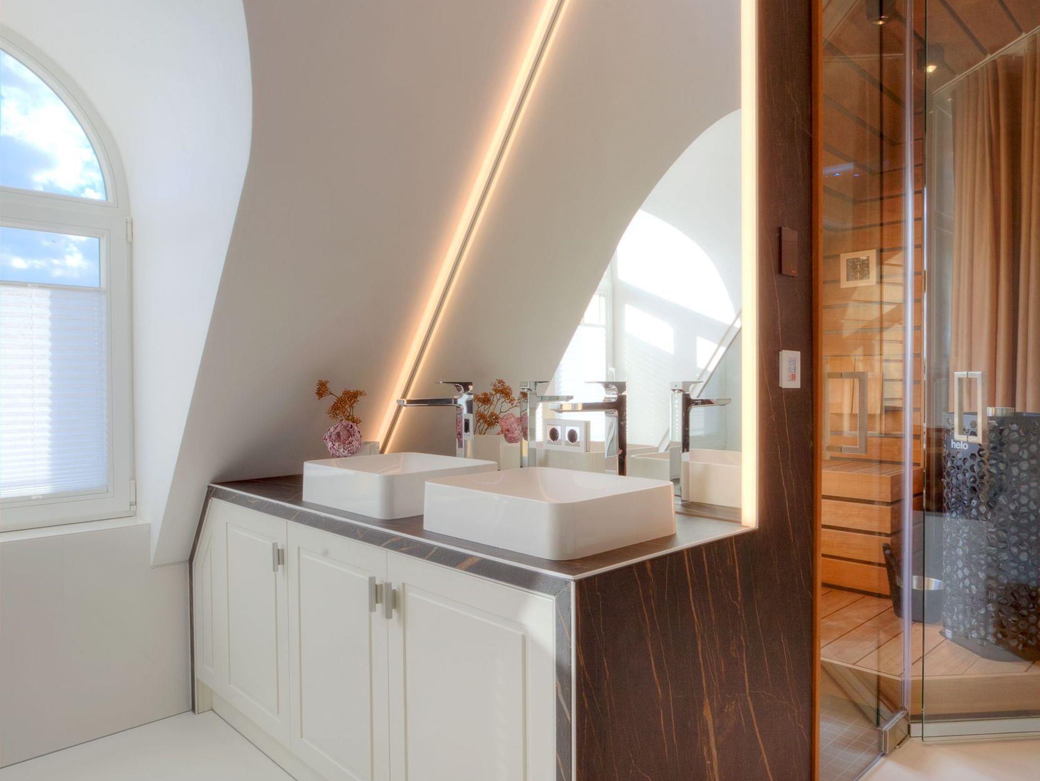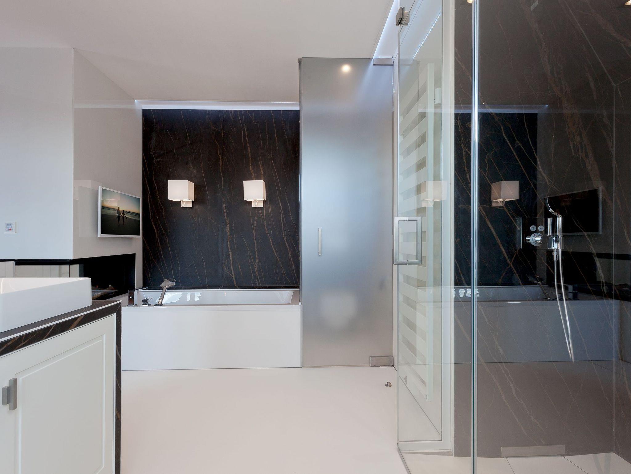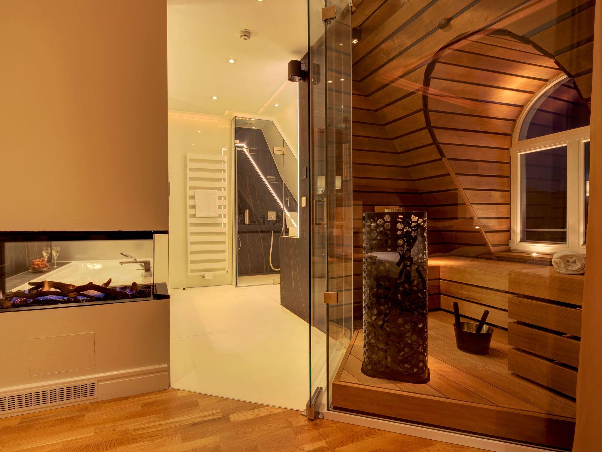 Das erste von vier Schlafzimmern mit Master-Bathroom ist ein Meisterwerk unseres Stylistenteams: Es wartet nicht nur mit einem der vier hochwertigen Boxspringbetten (200x200 cm) auf, sondern überzeugt ebenso mit einem Gaskamin und einer finnischen Sauna. In der Badewanne genießen Sie entweder das Flammenspiel des Gaskamins oder die TV Serie Ihrer Wahl. Komplettiert wird das Badezimmer mit einem Doppelwaschtisch, einer ebenerdigen Dusche sowie einem abgetrennten WC. Die Aufbettung für ein Kind ist im Schlafzimmer im Babyreisebett (max. 3 Jahre) möglich.