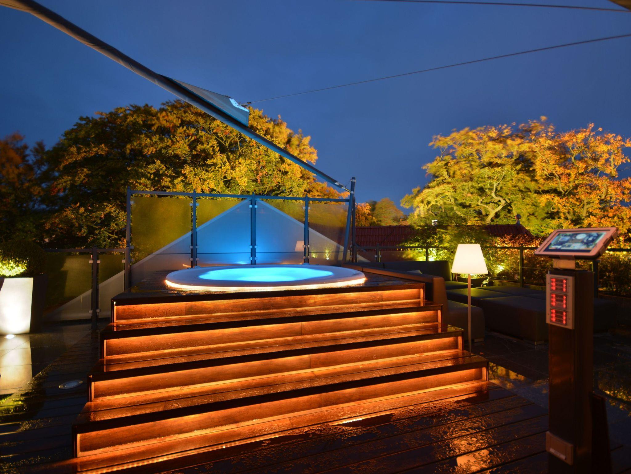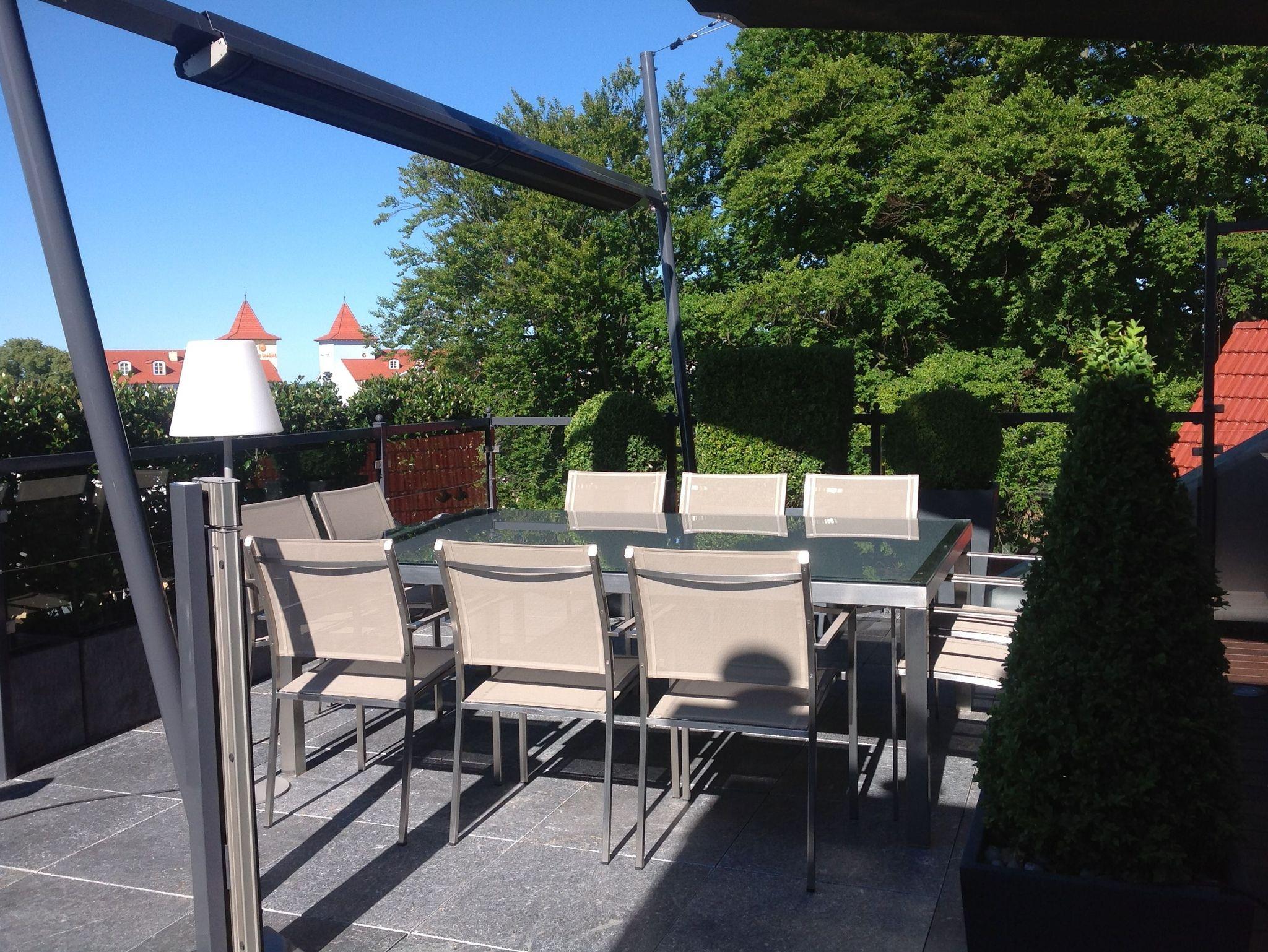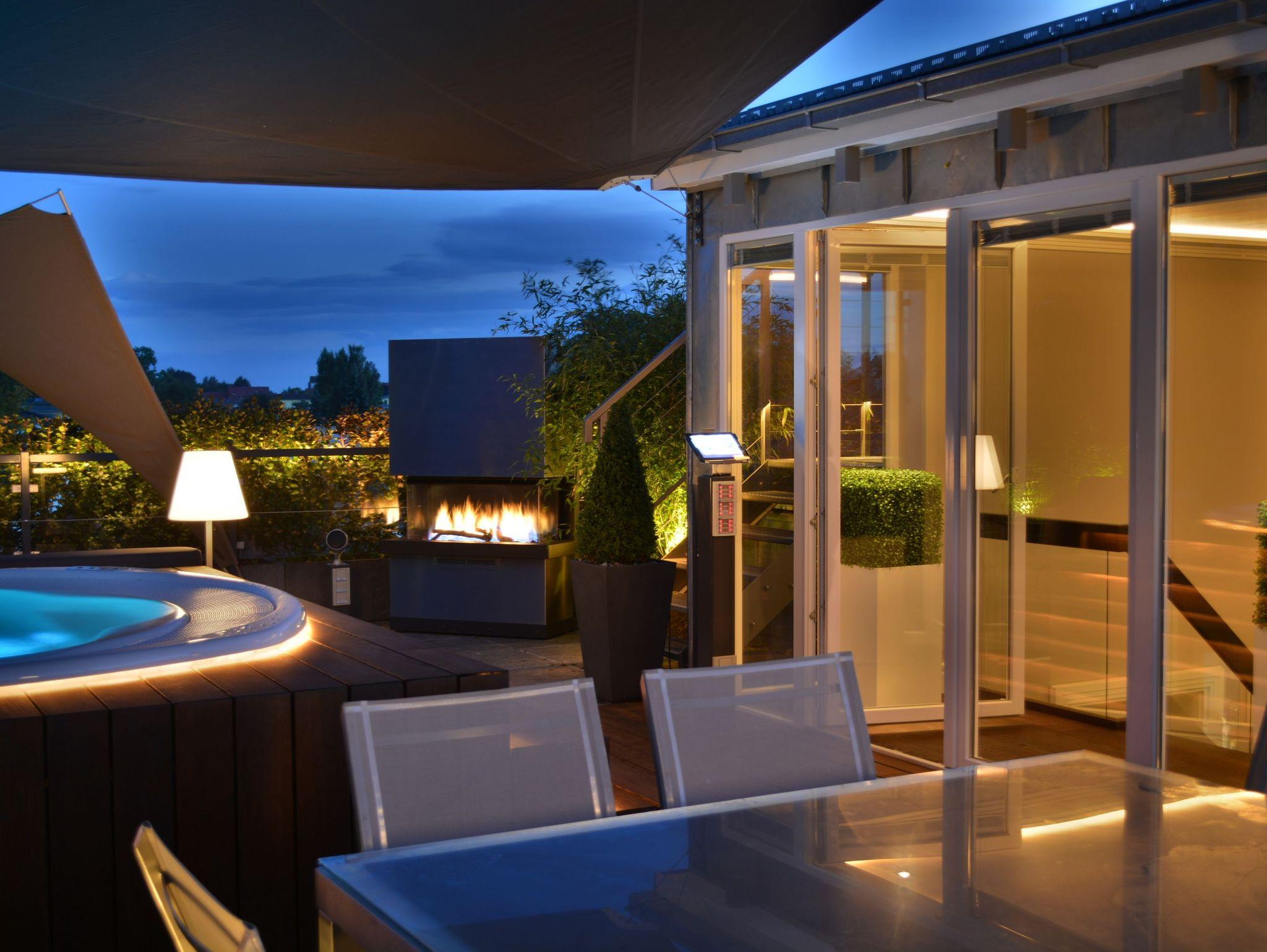 Highlight der Suite ist die atemberaubende Dachterrasse mit Ostseeblick. Erleben Sie Wohnen unter freiem Himmel mit einem ganzjährig beheiztem Whirlpool. Die Dachterrasse verfügt zudem über einen beheizten Esstisch für 8 Personen und einer XXL Sitzecke mit großem Sonnensegel. Eine Außendusche und die Nutzung der Outdoor-Küche ergänzen vom Frühjahr bis zum Herbst den Komfort.