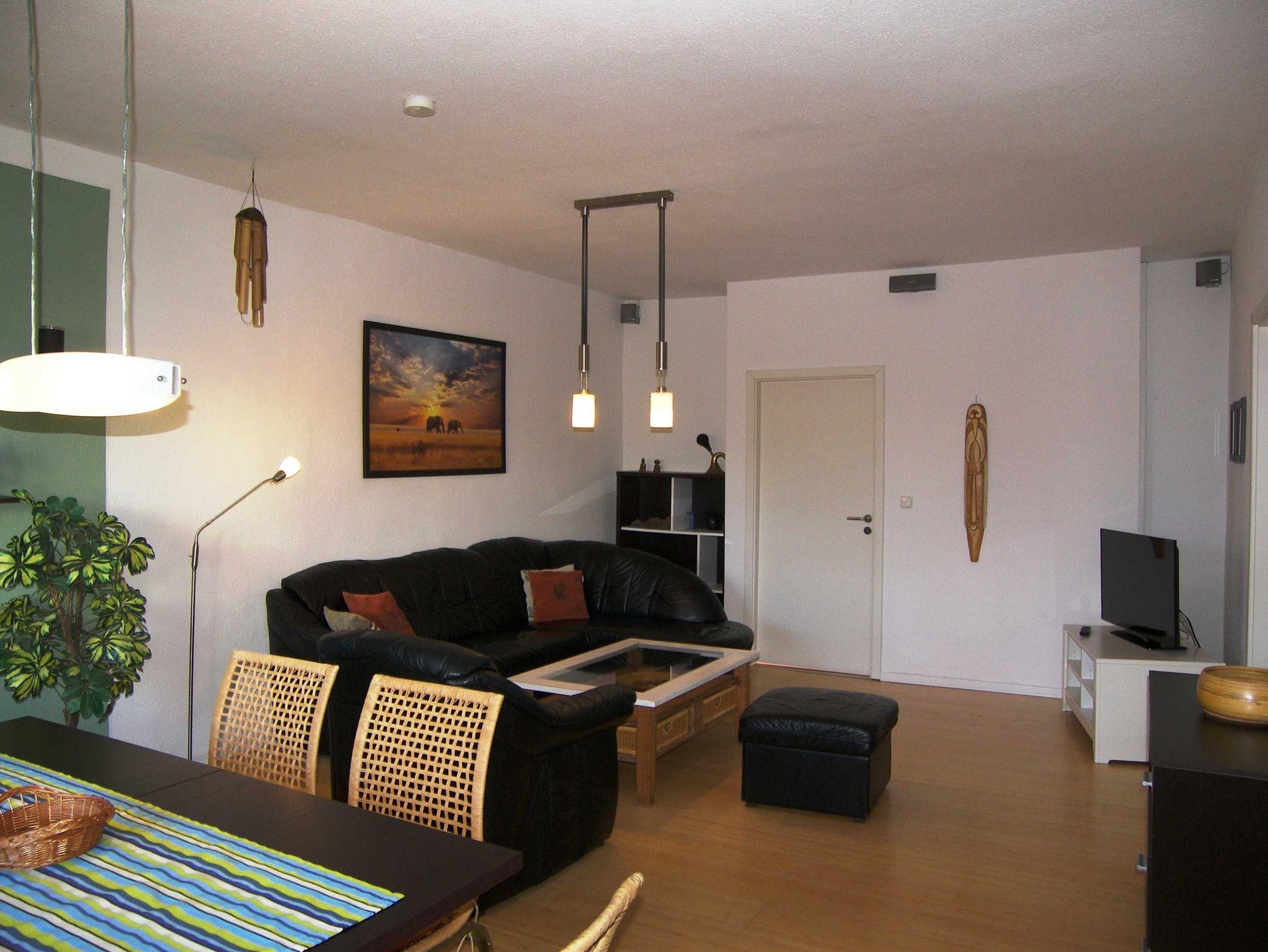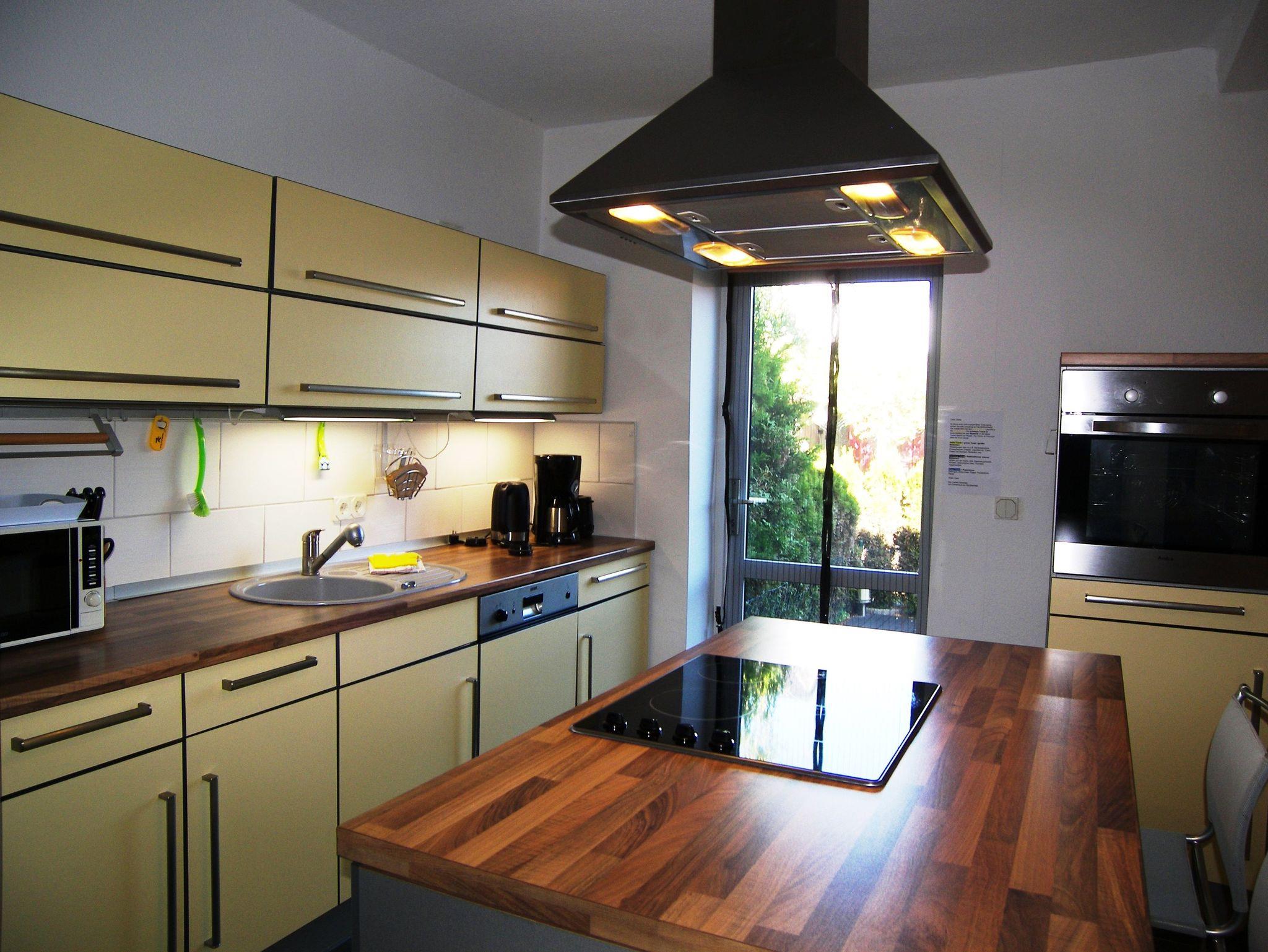 Großzügige Ferienwohnung (DHH) mit 2 Schlafzimmern, großem Wohnzimmer mit Essbereich, offener Küche, Terrasse und Bad mit Badewanne. Die Wohnung ist komplett mit Laminat und Fliesen ausgestattet. Ein Schlafzimmer (ca. 15m²) hat neben einem großen Kleiderschrank ein Doppelbett 1,80x2m und Platz für ein Kinderreisebett. Im zweiten Schlafzimmer (ca. 20m²) gibt es vier Schlafmöglichkeiten: ein Doppelbett 1,80x2m, ein Hochbett 0,90x2m, eine separate Schlafcouch max. 1,30x1,80m, sowie einen kleinen Kleiderschrank. Außerdem steht hier ein Kindergitterbett 70x140. Der Essbereich ist in das Wohnzimmer integriert und bietet Platz bis 6 Personen. Die angrenzende Küche hat eine Kochinsel mit 4 Platten Ceranfeld, einen Backofen mit Grill, eine Mikrowelle, einen großen Kühlschrank (Side by Side) mit Gefrierschrank und eine Spülmaschine. Eine große Terrasse lädt zum Frühstücken ein. Bettwäsche und Handtücher bekommen Sie gegen eine Gebühr vor Ort, wenn Sie das wünschen. Zwei überdachte Parkplätze (Doppelcarport) sind am Haus vorhanden (für normale PKW bis VW-Bus Größe ohne Dachbox ö.Ä.).