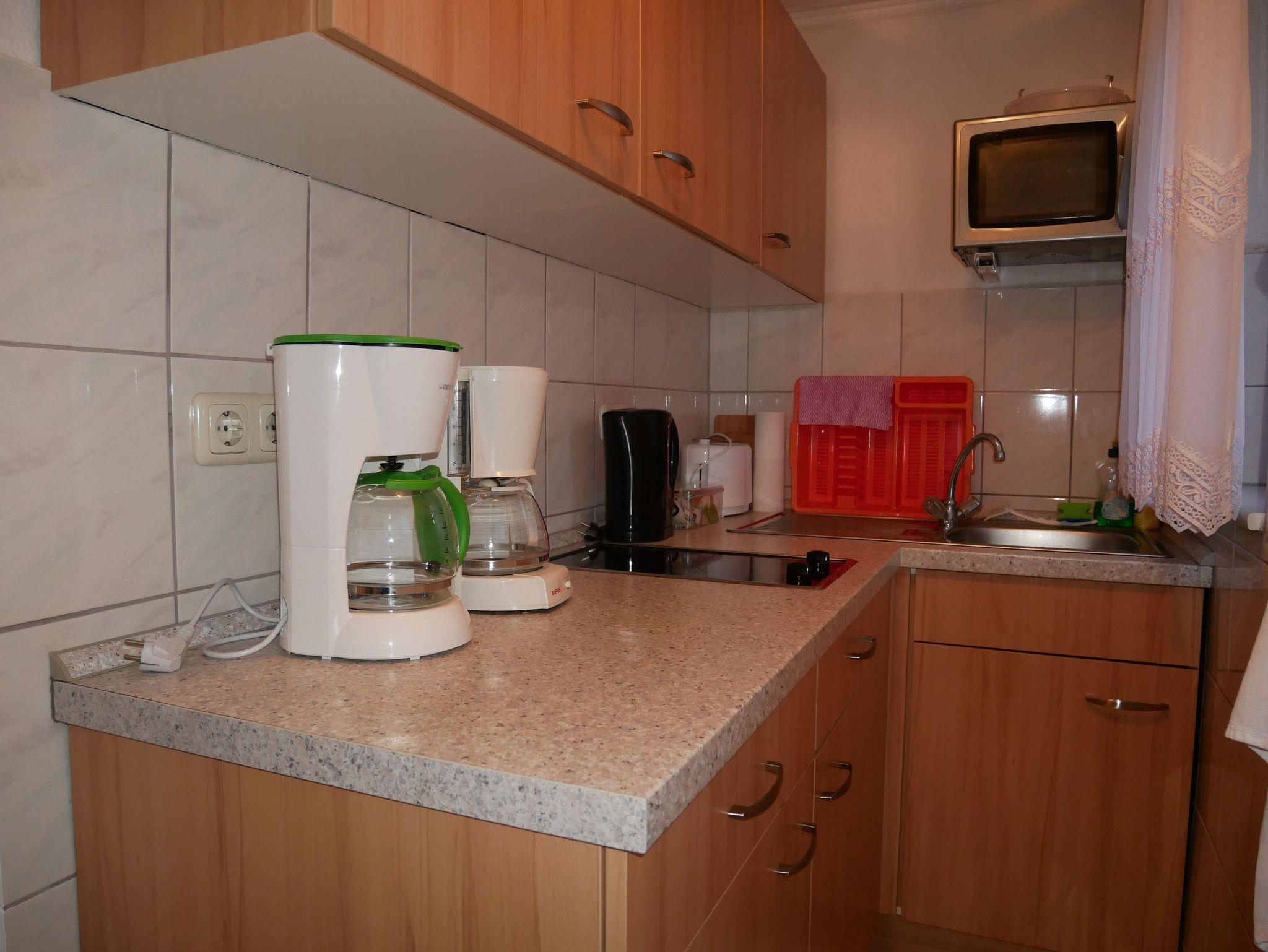 Dort finden Sie auch eine Küche zur gemeinschaftlichen Nutzung. Die Küche ist ausgestattet mit 2-Platten-Herd, Kühlschrank mit Gefrierfach, Toaster, Wasserkocher und Kaffeemaschine.
