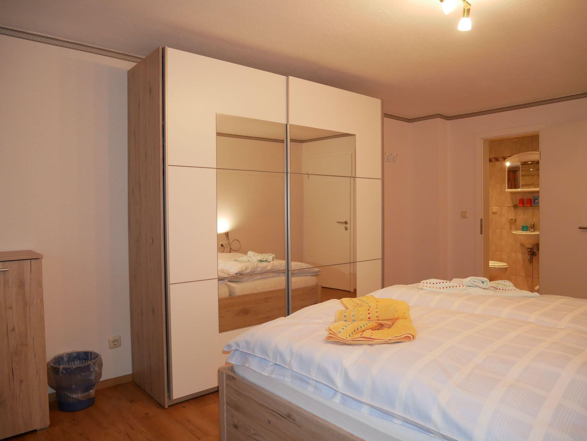 Es ist ausgestattet mit einem Doppelbett (1,80m x 2,00m), großen Kleiderschrank, Sitzbereich mit einem Tisch und zwei Sesseln, sowie mit einem Flachbildfernseher.