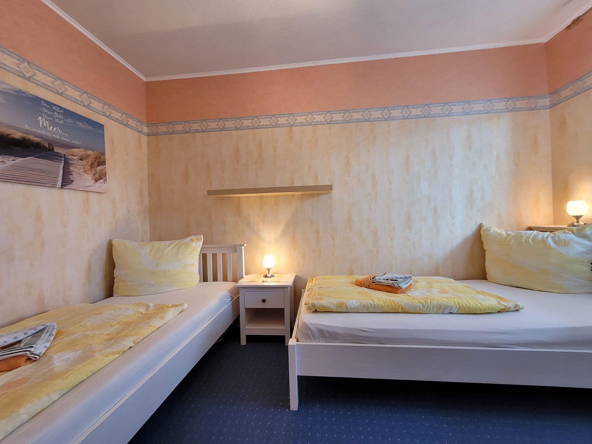 Unser Ferienhaus liegt ca.15 Geh-Minuten vom Strand entfernt in einer ruhigen Wohnlage. Die komplett eingerichtete Ferienwohnung mit Wohnzimmer, zwei Schlafzimmer mit einem Doppelbett und einmal zwei Einzelbetten, Küchenzeile, Dusche, WC, Flur und großem Balkon/Terrasse würde für Sie bereitstehen. Zur Ausstattung gehören weiter Radio, Fernseher, einmalig Bettwäsche und Handtücher. In der Küchenzeile sind Mikrowelle, Kaffeemaschine und Toaster, Eier-und Wasserkocher sowie ein 2-Platten-Kocher, Kühlschrank und Geschirr vorhanden. Eine Aufbettung ist im Wohnzimmer nach Absprache auf dem ausziehbarem Sofa möglich.