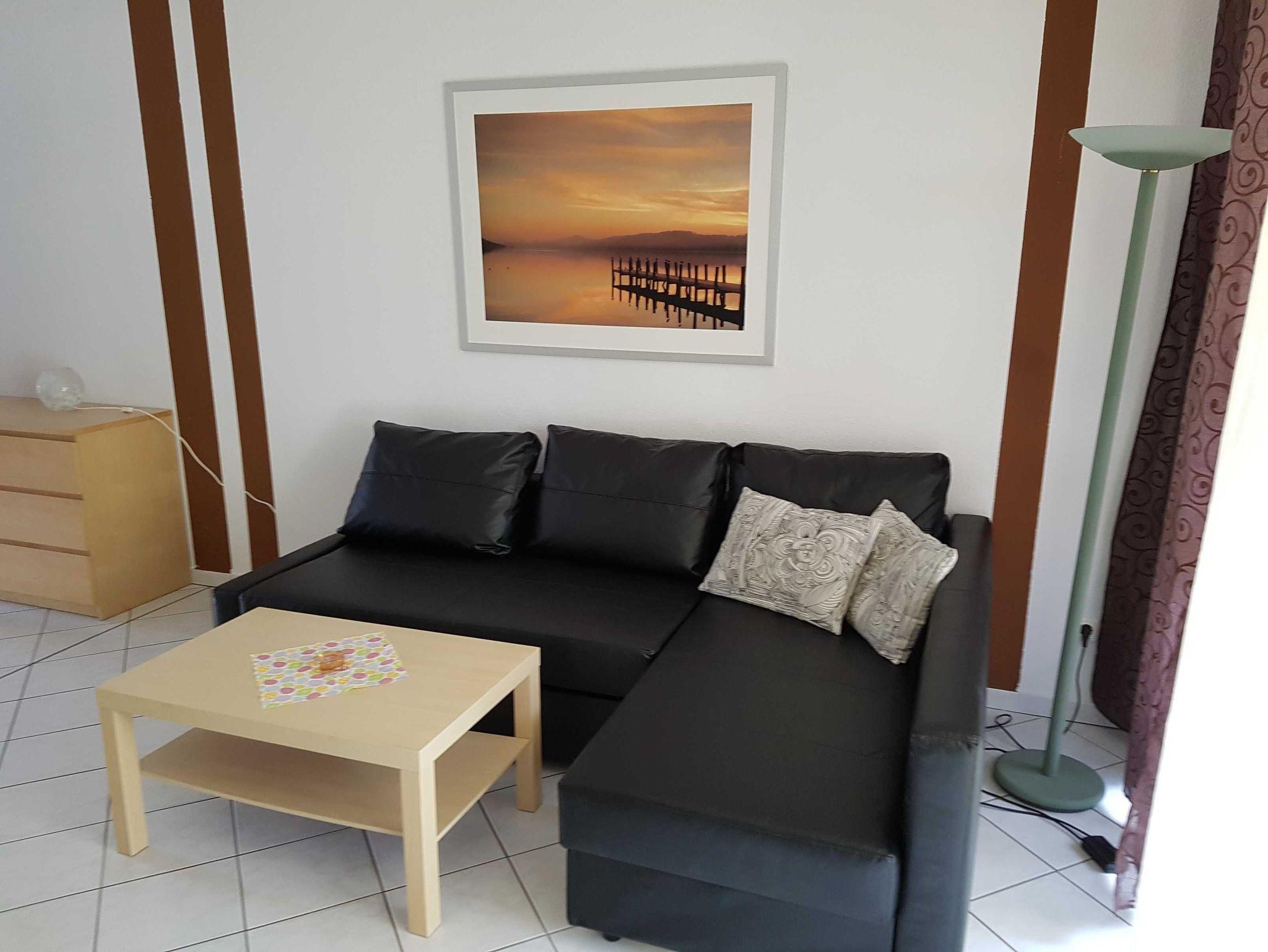 1 Wohnzimmer mit Ess- und Küchenbereich mit Schlafcouch.Jetzt auch mit Geschirrspüler