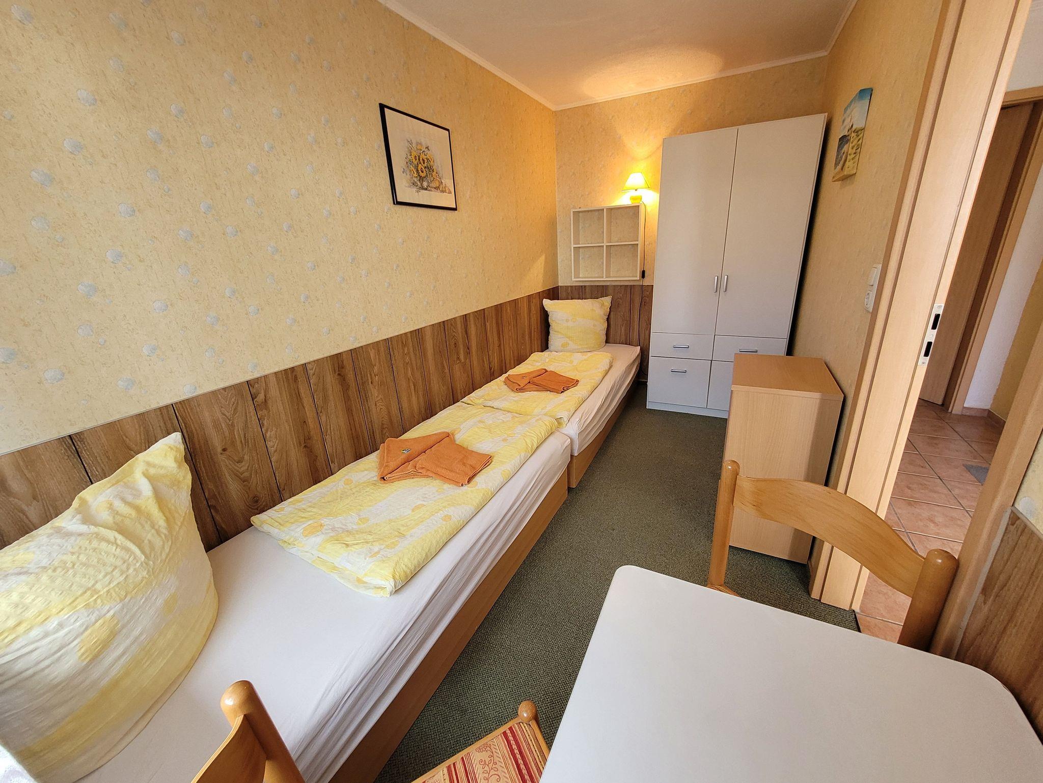 Die komplett eingerichtete Ferienwohnung mit Wohnzimmer, zwei Schlafzimmern mit einem Doppelbett und einmal zwei Liegen, Küchenzeile, Dusche, WC, Flur und großer Terrasse ca.15 Meter neben der Wohnung würde für Sie bereitstehen. Zur Ausstattung gehören weiter Radio, Fernseher, einmalig Bettwäsche und Handtücher. In der Küchenzeile sind Mikrowelle, Kaffeemaschine und Toaster, Eier-und Wasserkocher sowie ein 2-Platten-Kocher, Kühlschrank und Geschirr vorhanden. Eine Aufbettung ist im Wohnzimmer nach Absprache auf dem ausziehbarem Sofa möglich.