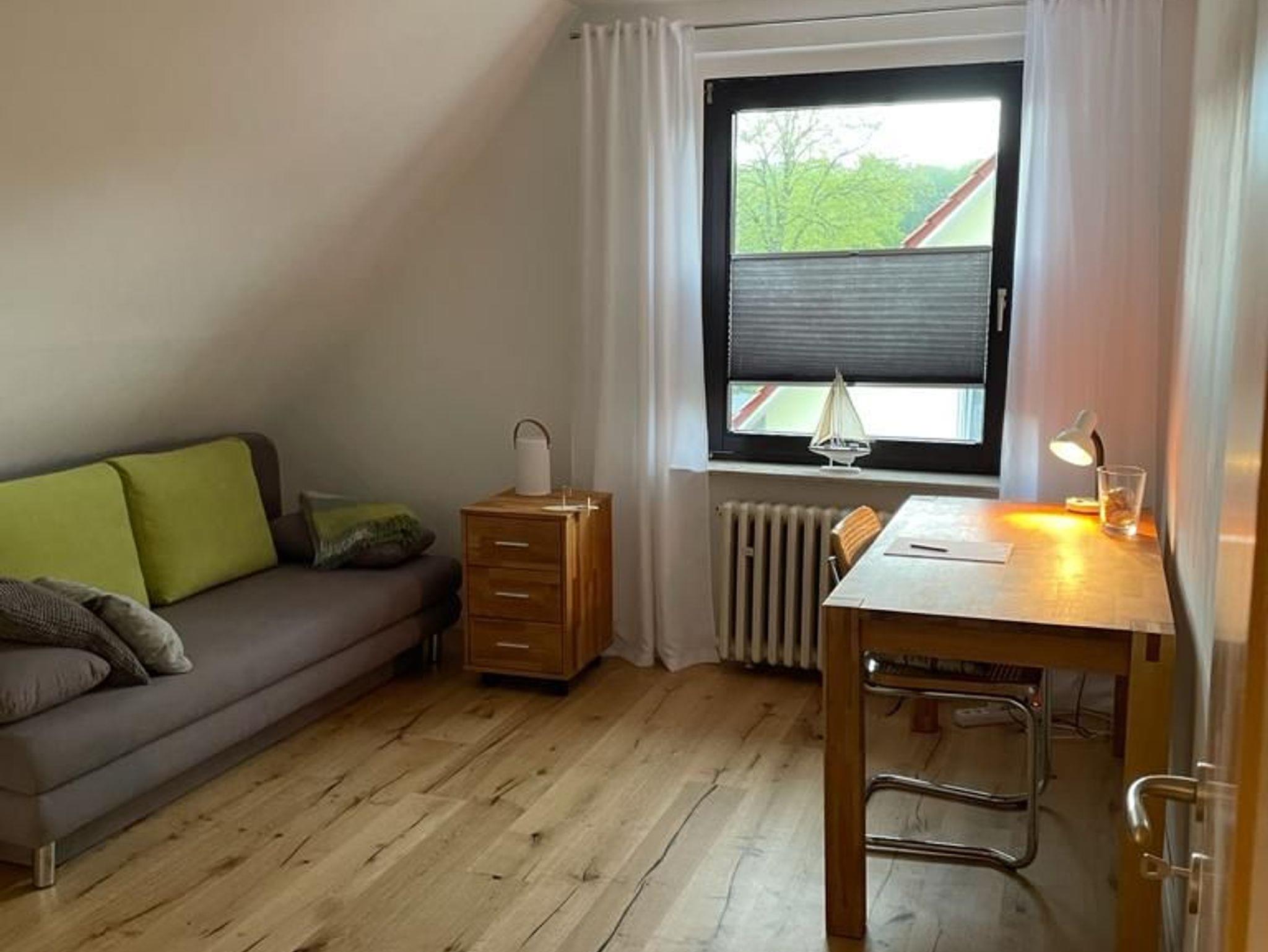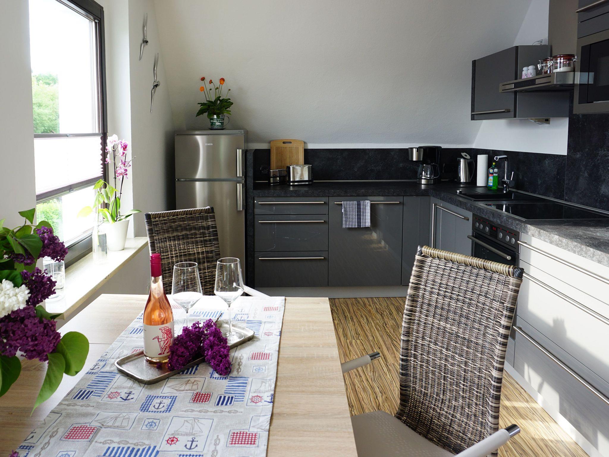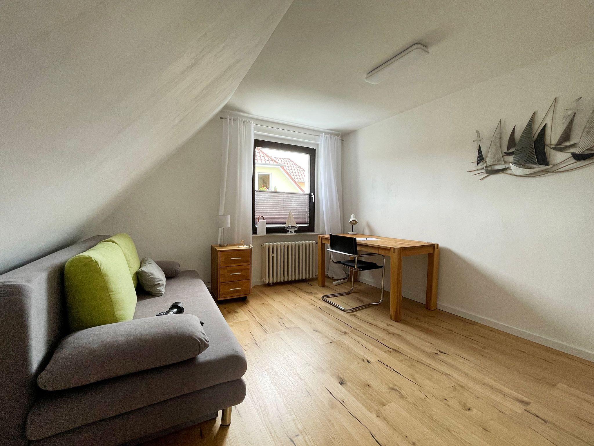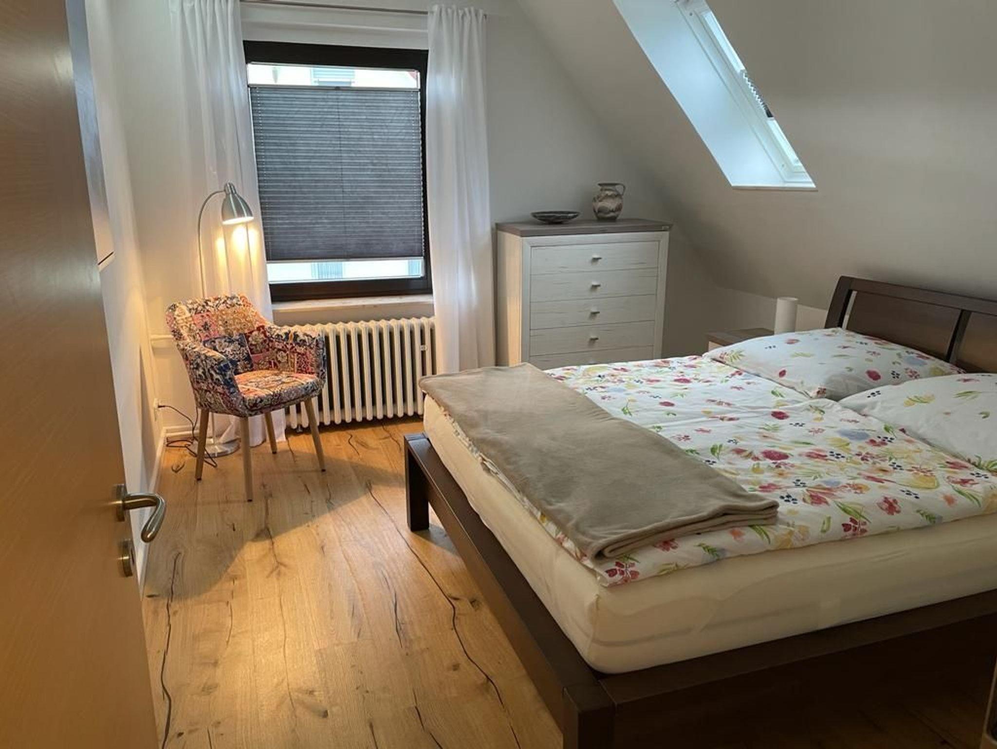 Die Ferienwohnung erstreckt sich über das gesamte erste OG. Das heißt, Sie können bei Bedarf den gesamten Tag den Sonnenschein genießen. Der offene Wohn- und Küchenbereich ist in Richtung Süden/Südwest gelegen. Die Wohnung ist also hell und freundlich, Sonnenschutzeinrichtungen sind vorhanden.