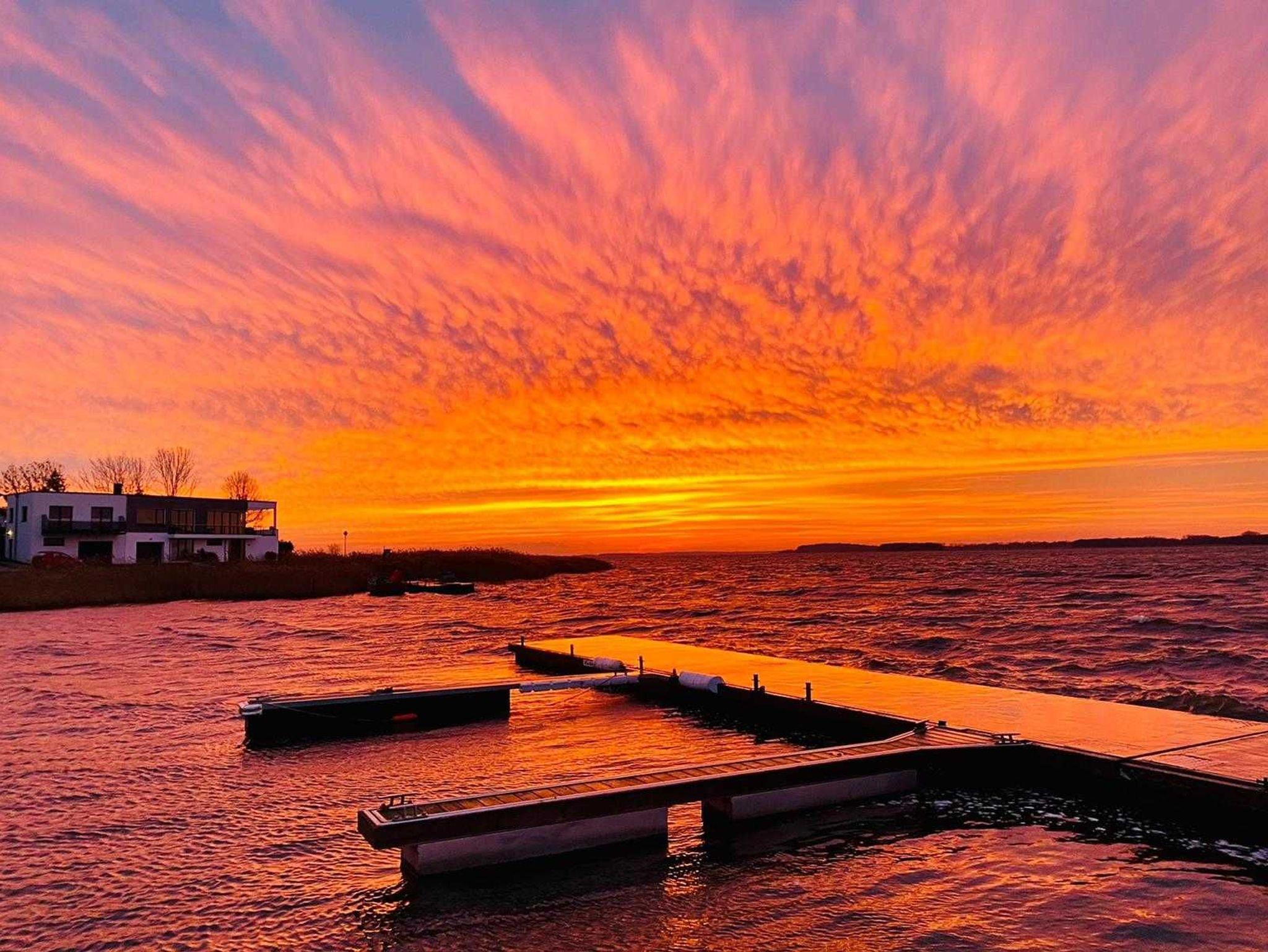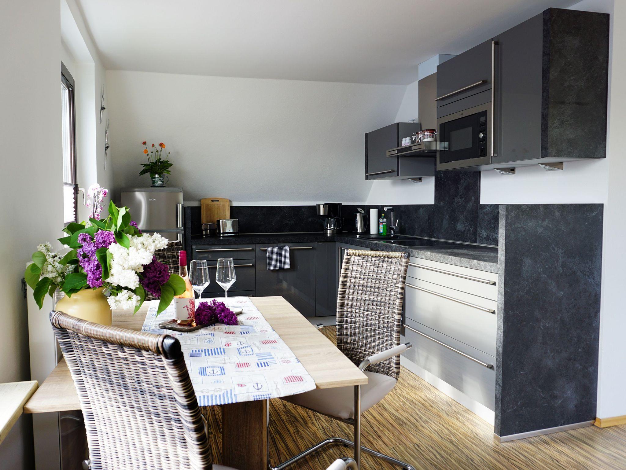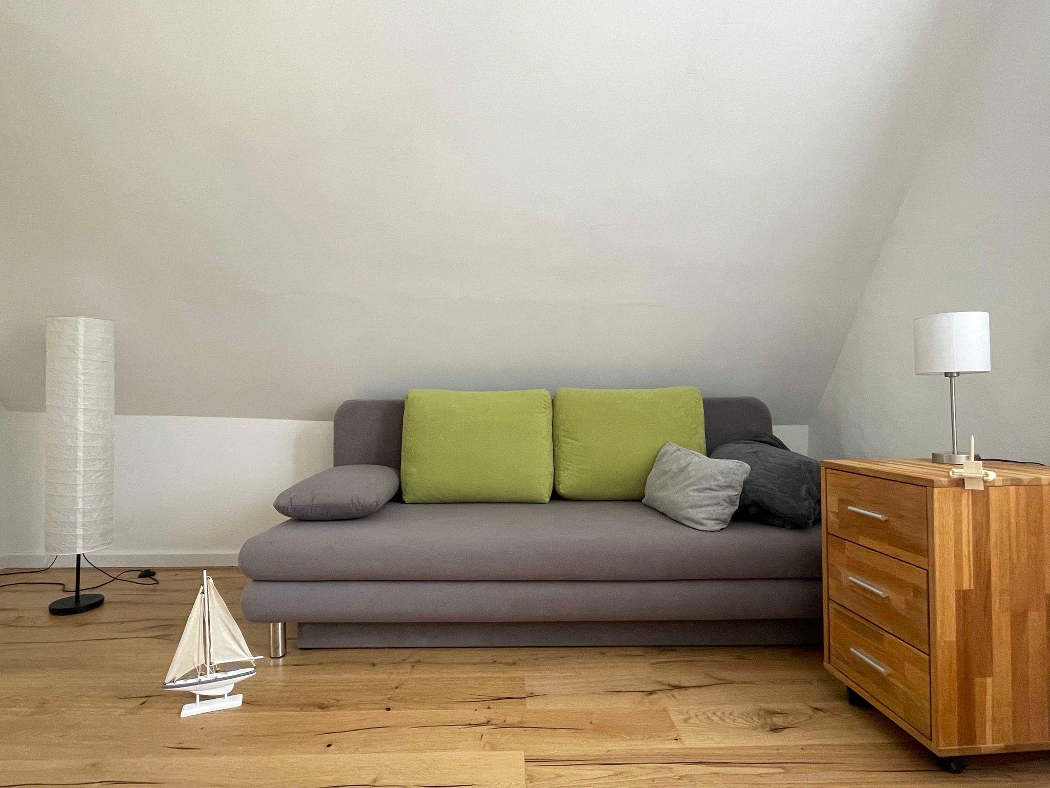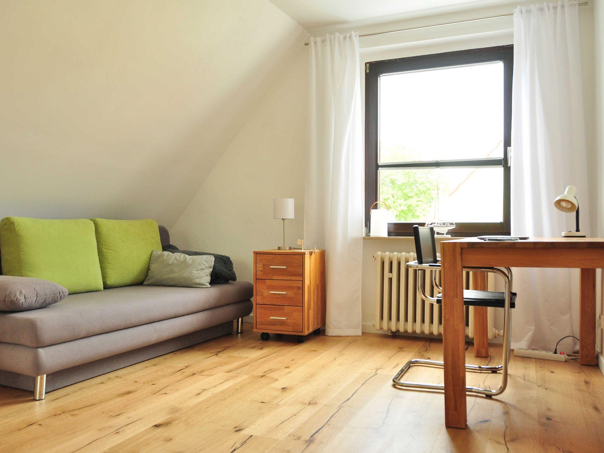 Die Ferienwohnung erstreckt sich über das gesamte erste OG. Das heißt, Sie können bei Bedarf den gesamten Tag den Sonnenschein genießen. Der offene Wohn- und Küchenbereich ist in Richtung Süden/Südwest gelegen. Die Wohnung ist also hell und freundlich, Sonnenschutzeinrichtungen sind vorhanden.