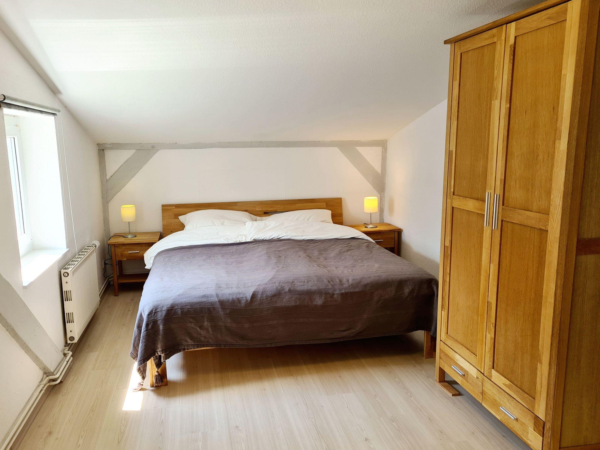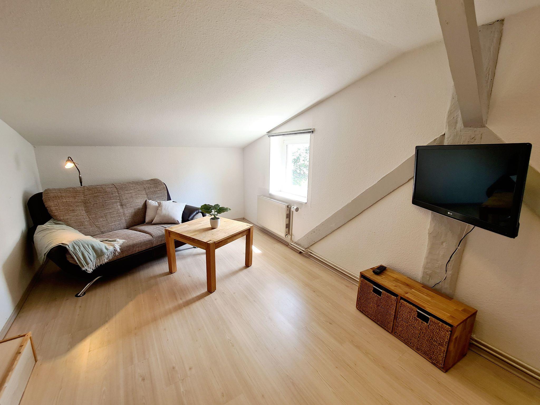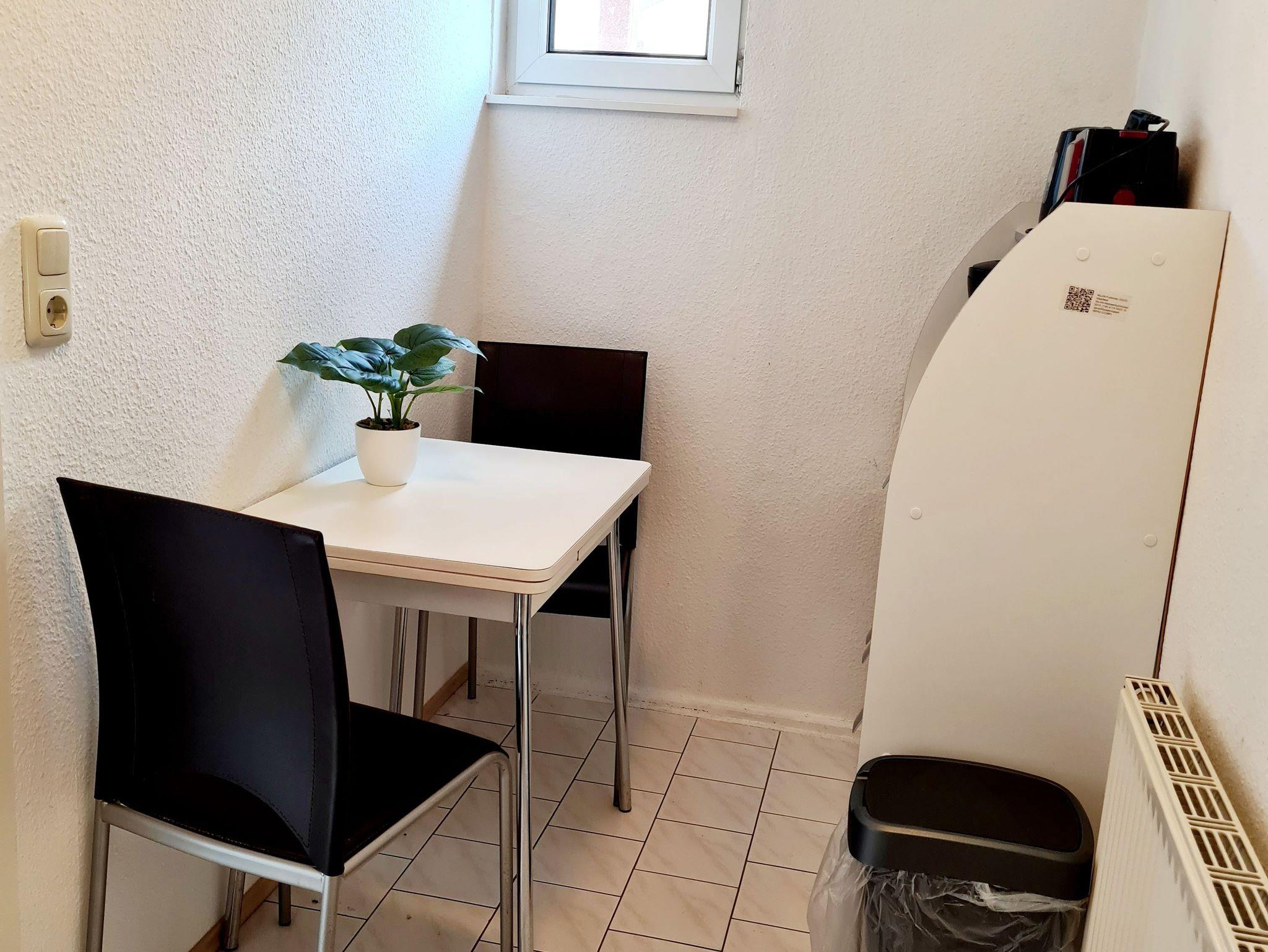 Das Wohnzimmer ist mit einer gemütlichen Sitzecke und einem SAT-TV ausgestattet und ermöglicht dementsprechend das Entspannen in der Wohnung. Das Doppelbett bildet zusammen mit einem Schrank den Schlafbereich. Die kleine Pantry- Küche verfügt über einen 2-Plattenherd, Kaffeemaschine, Wasserkocher und Kühlschrank. Das Badezimmer ist mit einer Dusche, einem WC und einem Bidet ausgestattet. WLAN ist vorhanden. Der kostenfreie Parkplatz befindet sich am Haus.