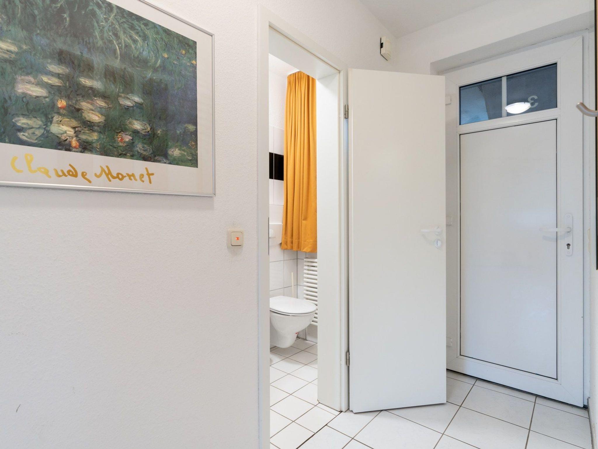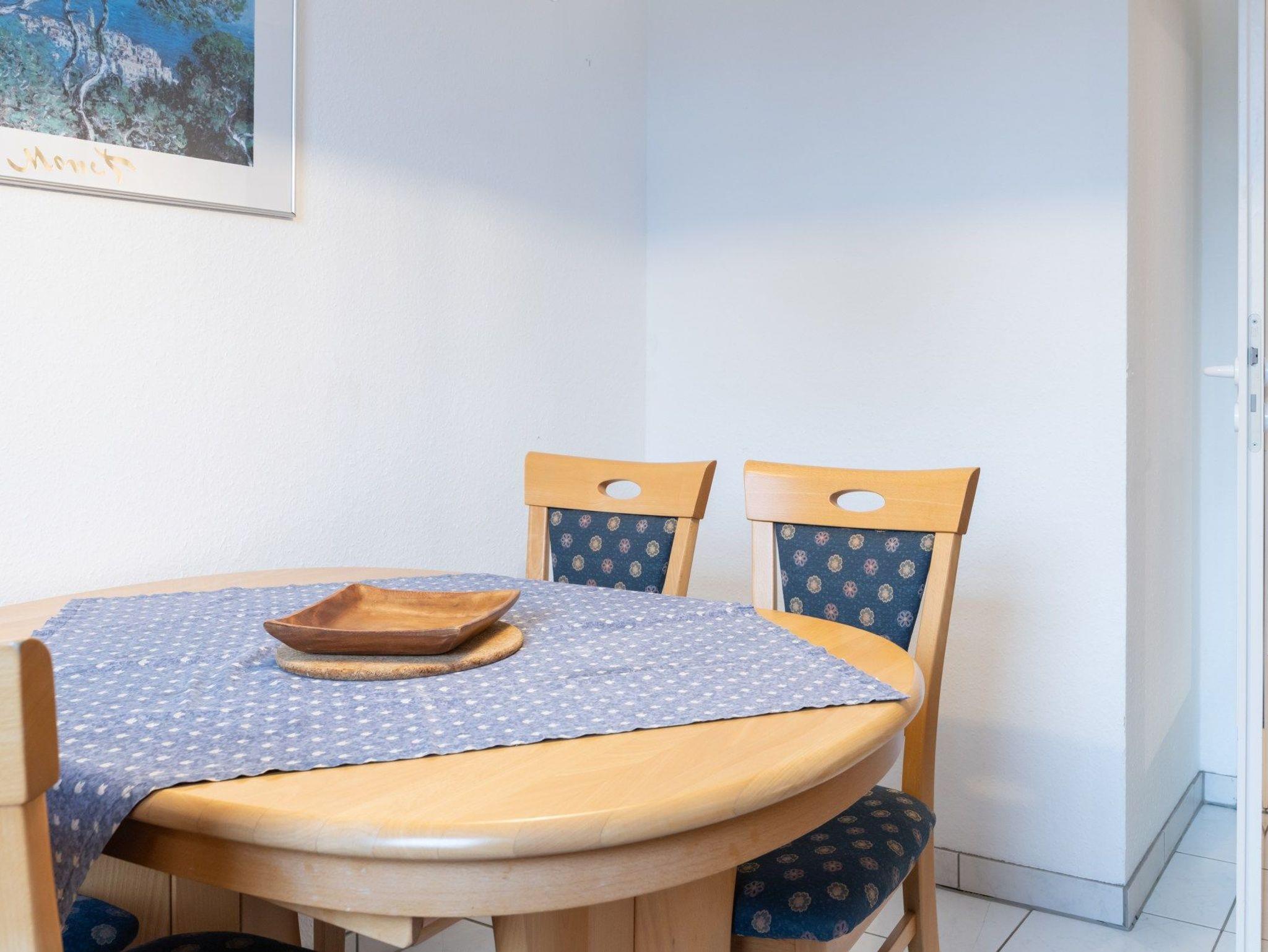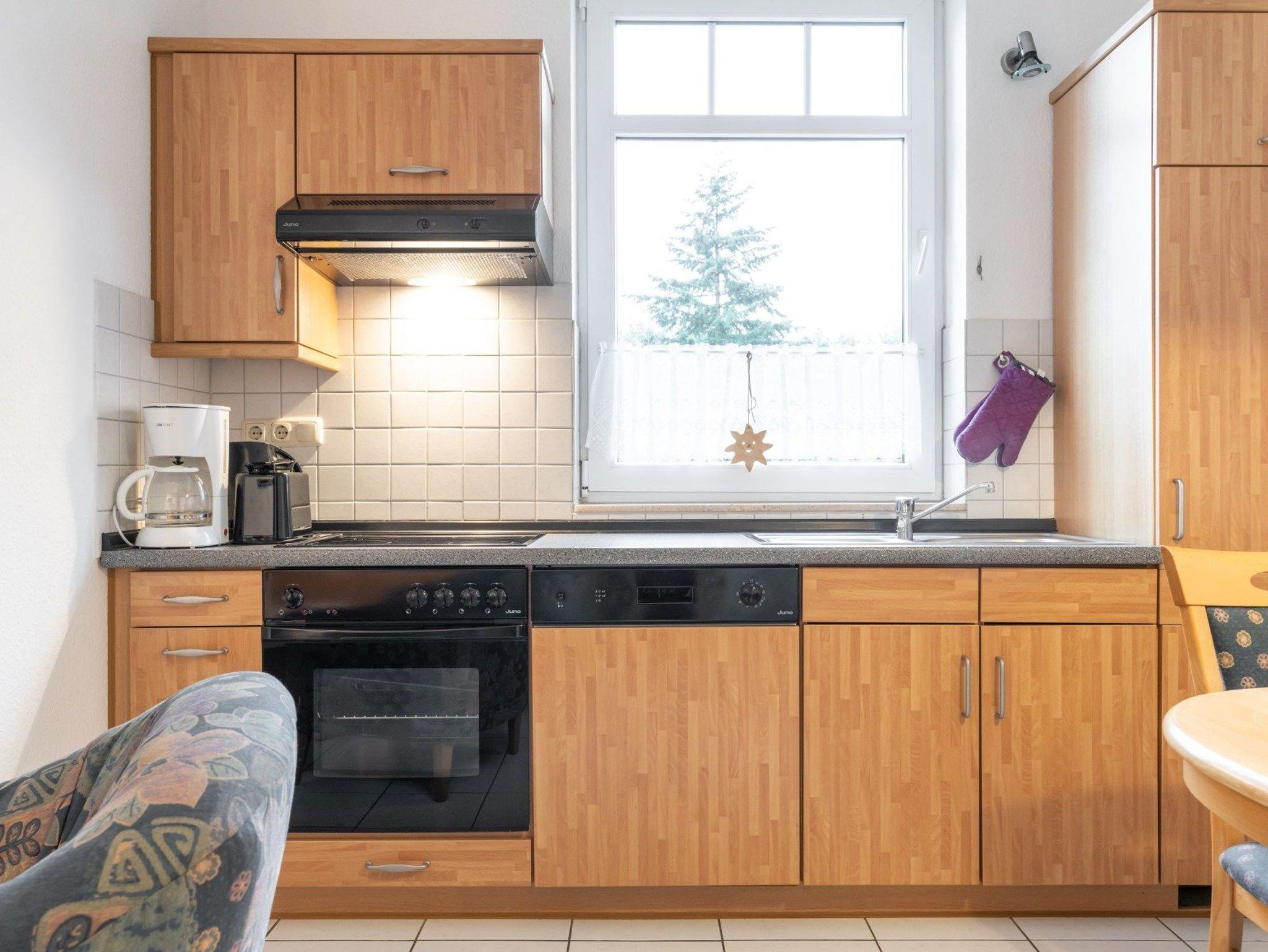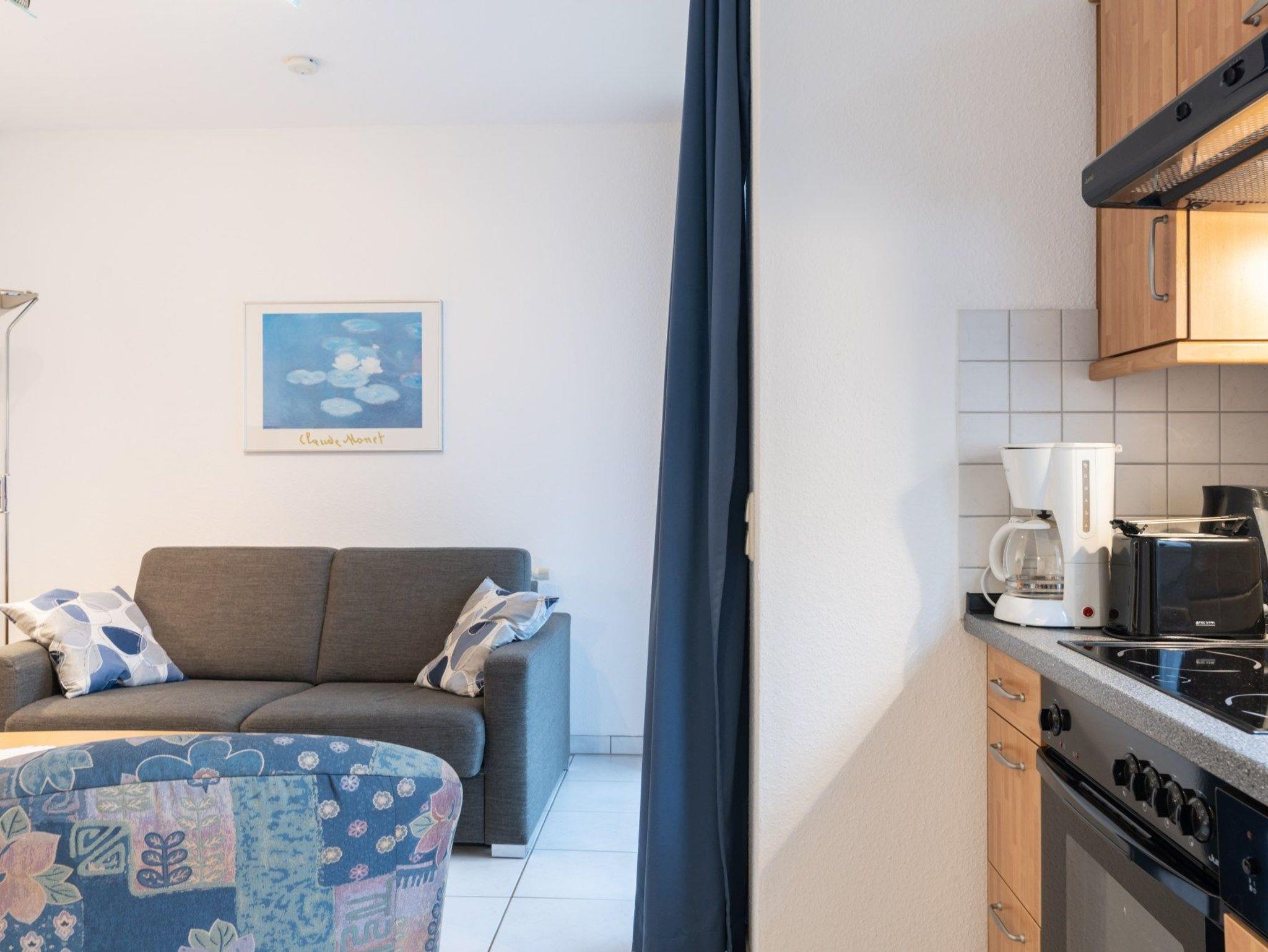 Die hier angrenzende Küchenzeile ist mit einem Kühlschrank mit Gefrierfach, einem Geschirrspüler und einem Backofen mit Cerankochfeld ausgestattet. Eine Kaffeemaschine, ein Toaster und ein Wasserkocher stehen Ihnen hier selbstverständlich zur Verfügung.