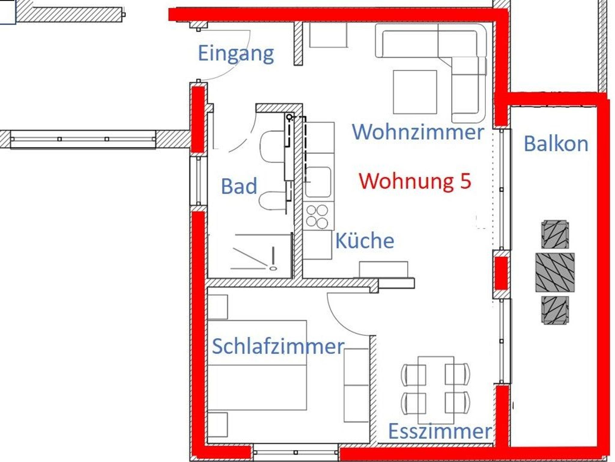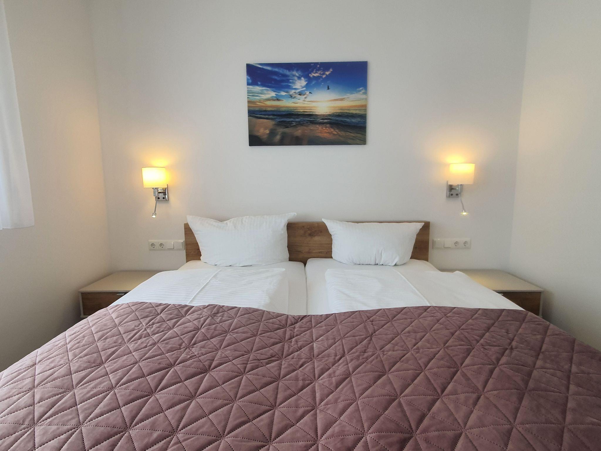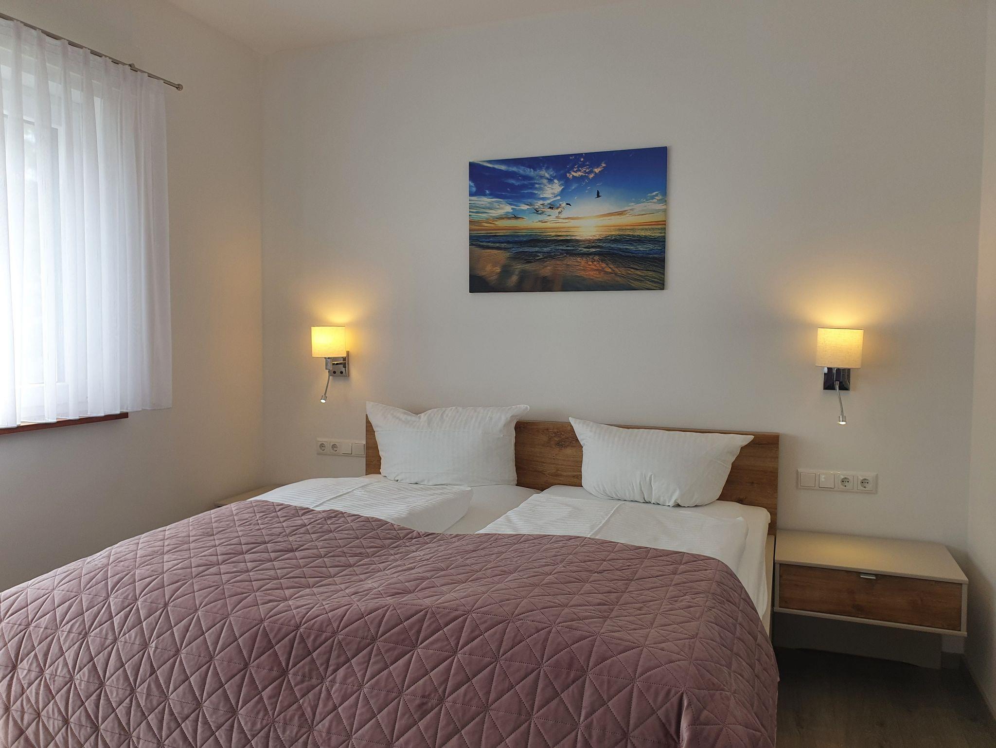 Die Wohnung 5 befindet sich im 1. Obergeschoss und ist über ein innenliegendes Treppenhaus erreichbar. Diese helle, großzügige Wohnung empfehlen wir gerne Urlaubsgästen mit 2 Erwachsenen. Das Schlafzimmer ist mit einem Doppelbett möbliert. Selbstverständlich müssen Sie nicht auf genug Stauraum im Kleiderschrank und beleuchtete Nachttische verzichten. Für Schlafkomfort sorgen verstellbare Lattenroste und hochwertige Federkernmatratzen. In der Wohnung steht Ihnen ein Badezimmer mit ebenerdiger, begehbarer Dusche zur Verfügung.