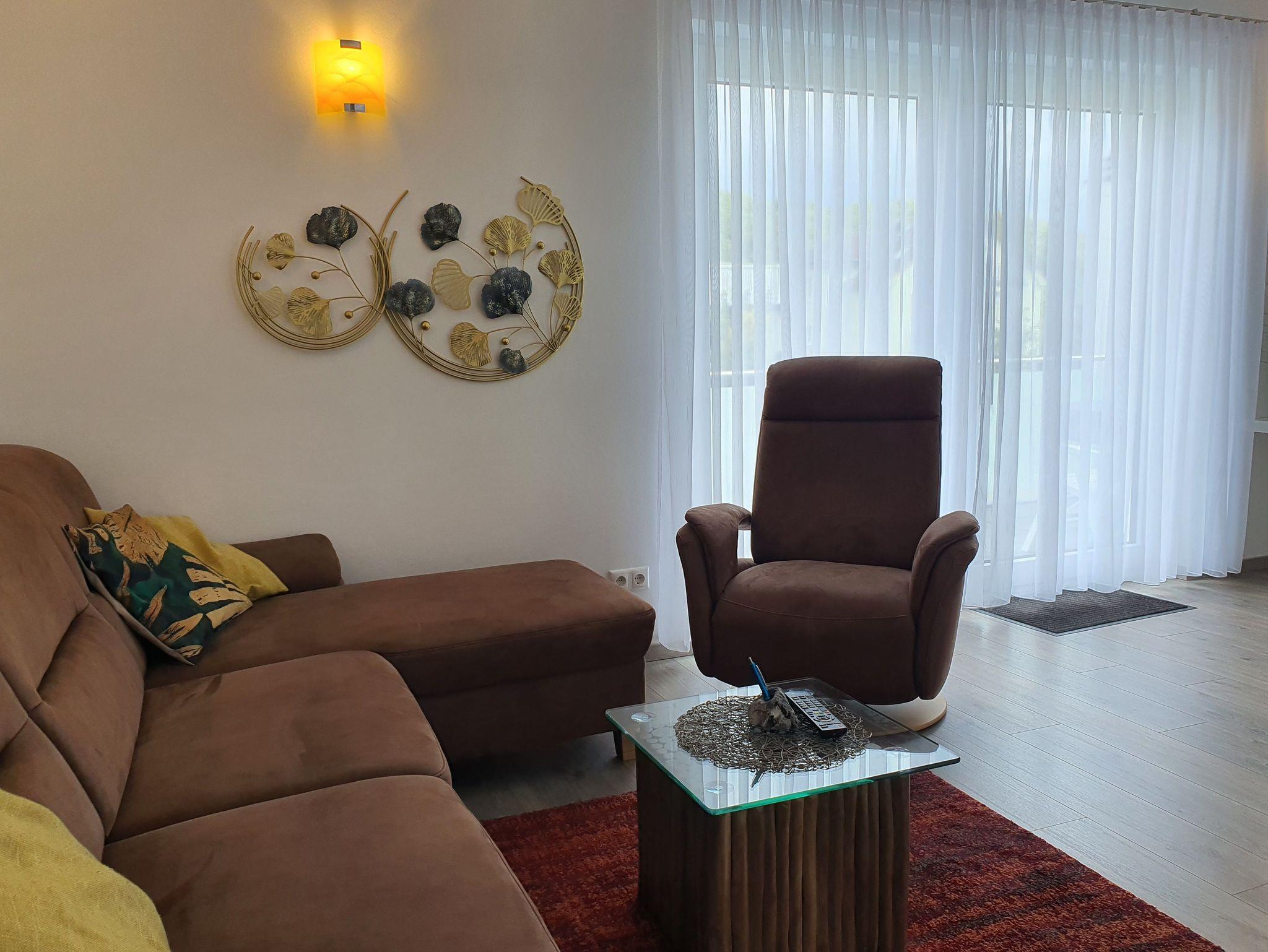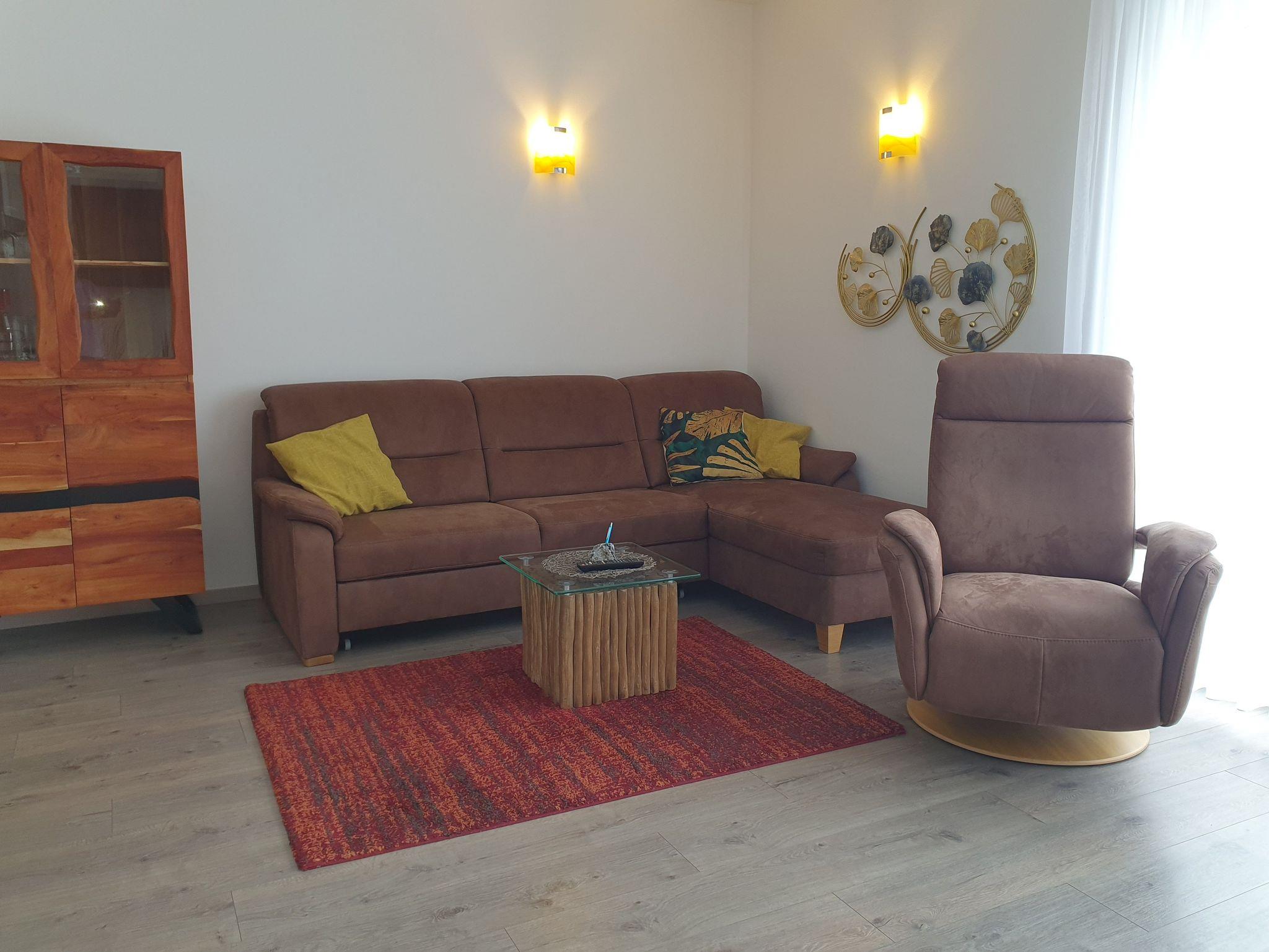 Entspannung finden sie im Wohlfühlbereich der Wohnung. Hier halten wir eine hochwertige und bequeme Polsterecke, einen Relaxsessel und einen Smart TV für sie bereit. Zusätzlich bieten wir Gästen dieser Wohnung einen großen, möblierten Balkon an.