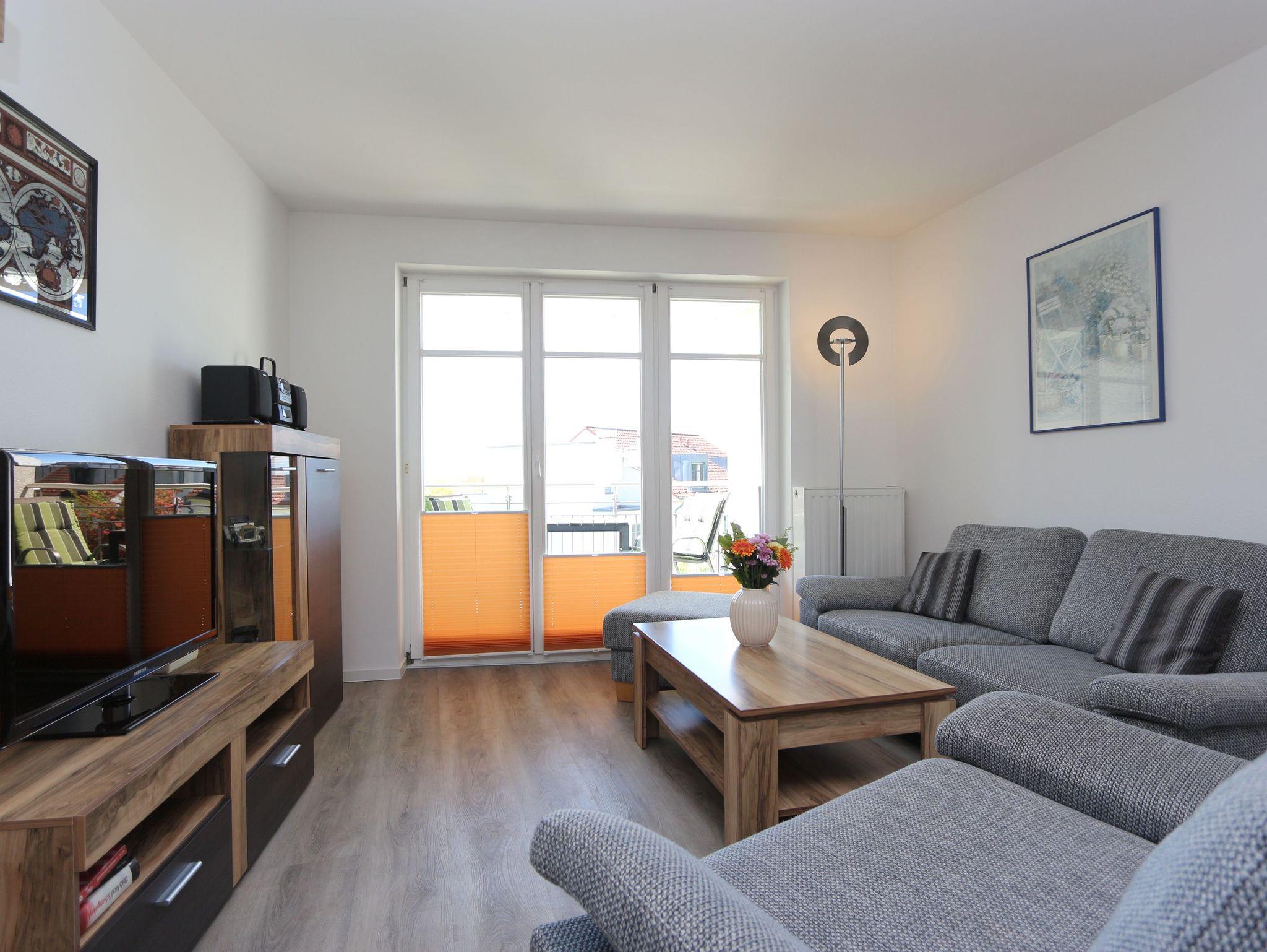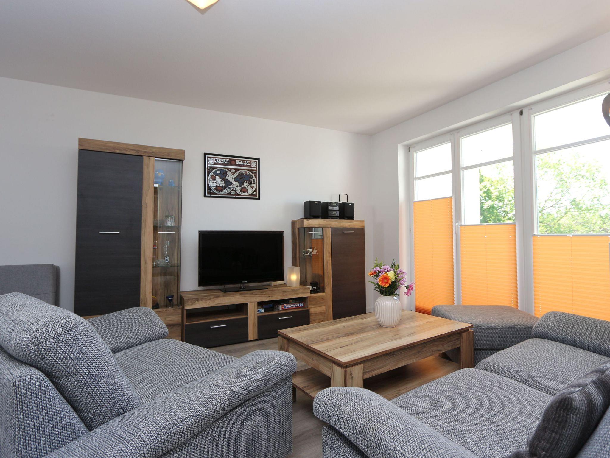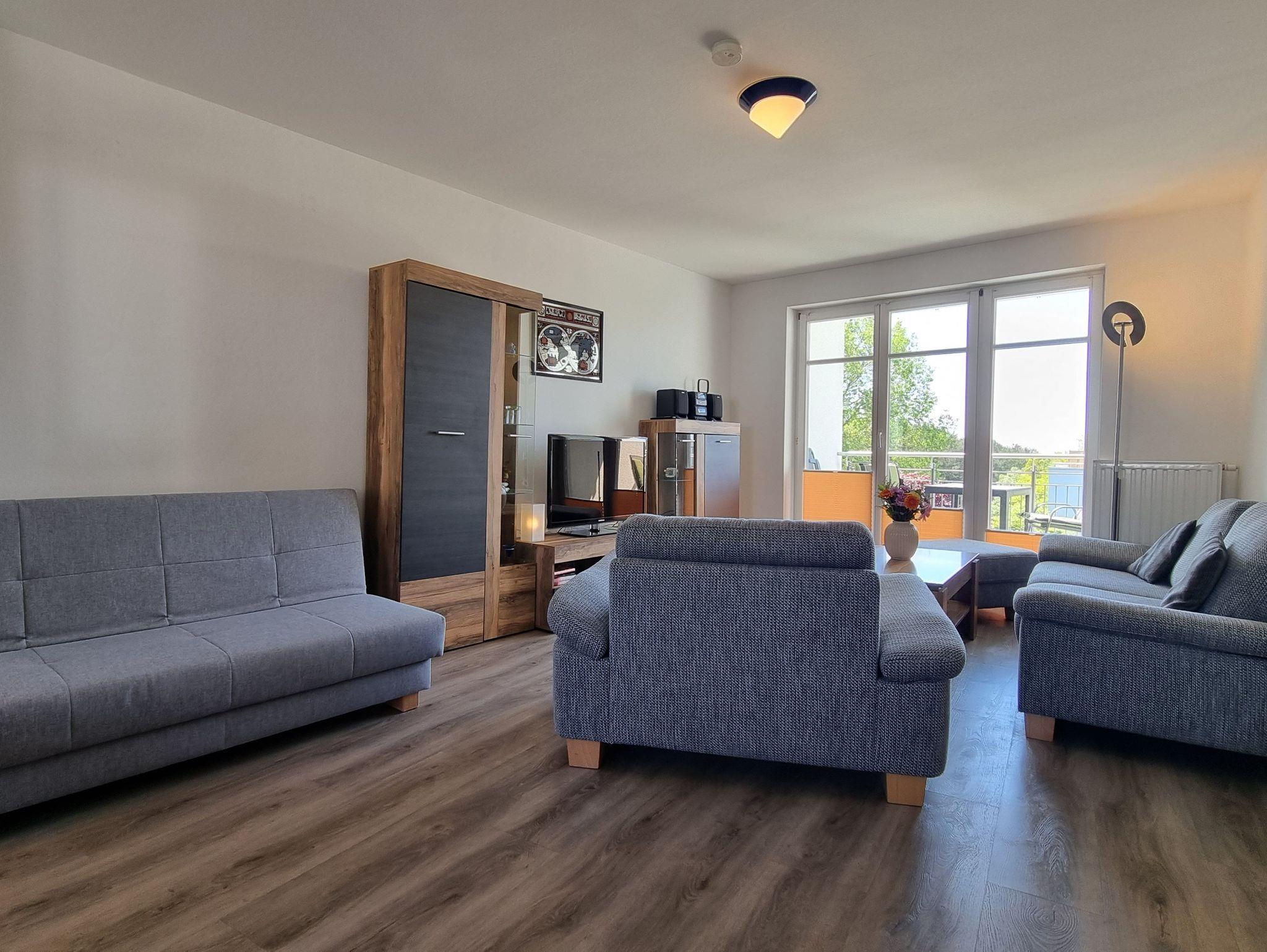 • Das Wohnzimmer wurde Anfang 2016 mit neuen Polstermöbeln ausgestattet. Es steht eine Sitzgruppe aus einem Sofa, einem Sessel und einem Hocker zur Verfügung. Des Weiteren finden Sie im Wohnzimmer ein Schlafsofa (Aufbettung für die 3. und 4. Person) sowie einen Flachbildfernseher (Sat-TV) und eine CD/DVD-Anlage, Vom Wohnzimmer gelangen Sie auf den schönen Balkon mit Blick über die Landschaft.