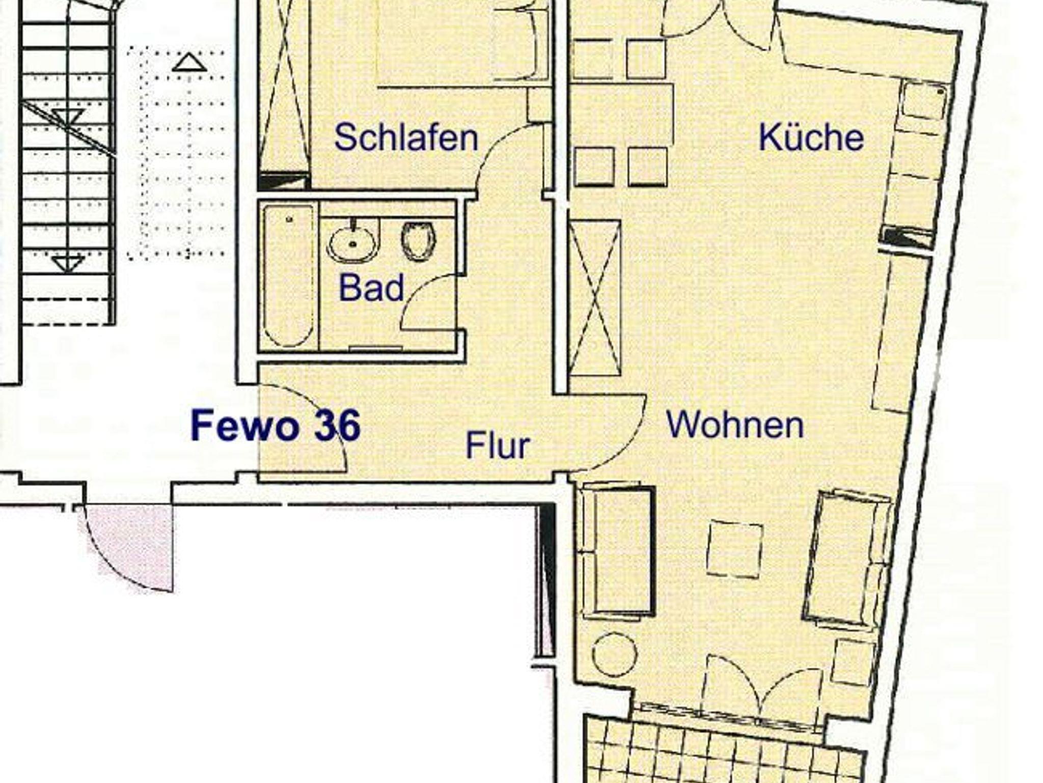 Ferienwohnung (Nr. 36) für bis zu 4 Personen (ca. 55 m²) im 1.OG mit Wohn- und Esszimmer mit offener Küche, 1 Schlafzimmer, 1 Bad und 1 Balkon.
