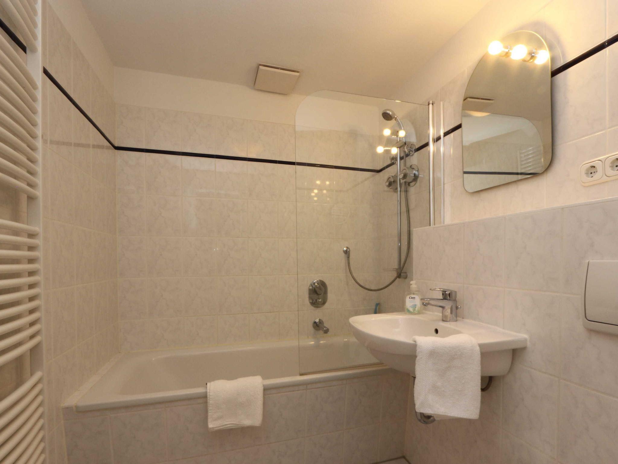 • Bad mit Badewanne und Duschabtrennung, kleine tragbare Waschmaschine und Handtuchtrockenheizkörper.