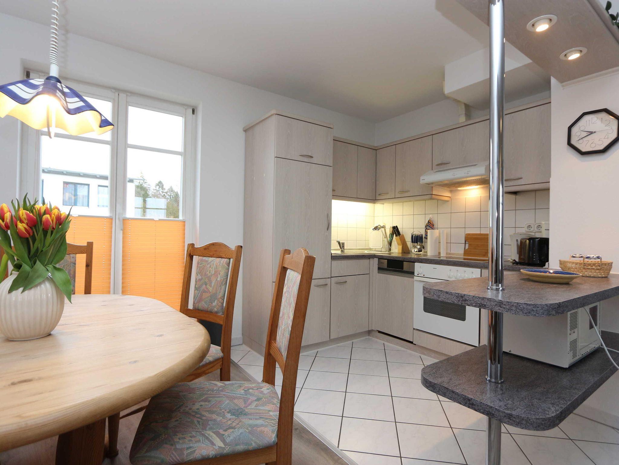 • Die zum Wohnzimmer offene Einbauküche ist mit allem Notwendigen (Herd, Mikrowelle, Eierkocher, Toaster, Spülmaschine, Wasserkocher, Kühlschrank mit Gefrierfach) und einem Essplatz ausgestattet.