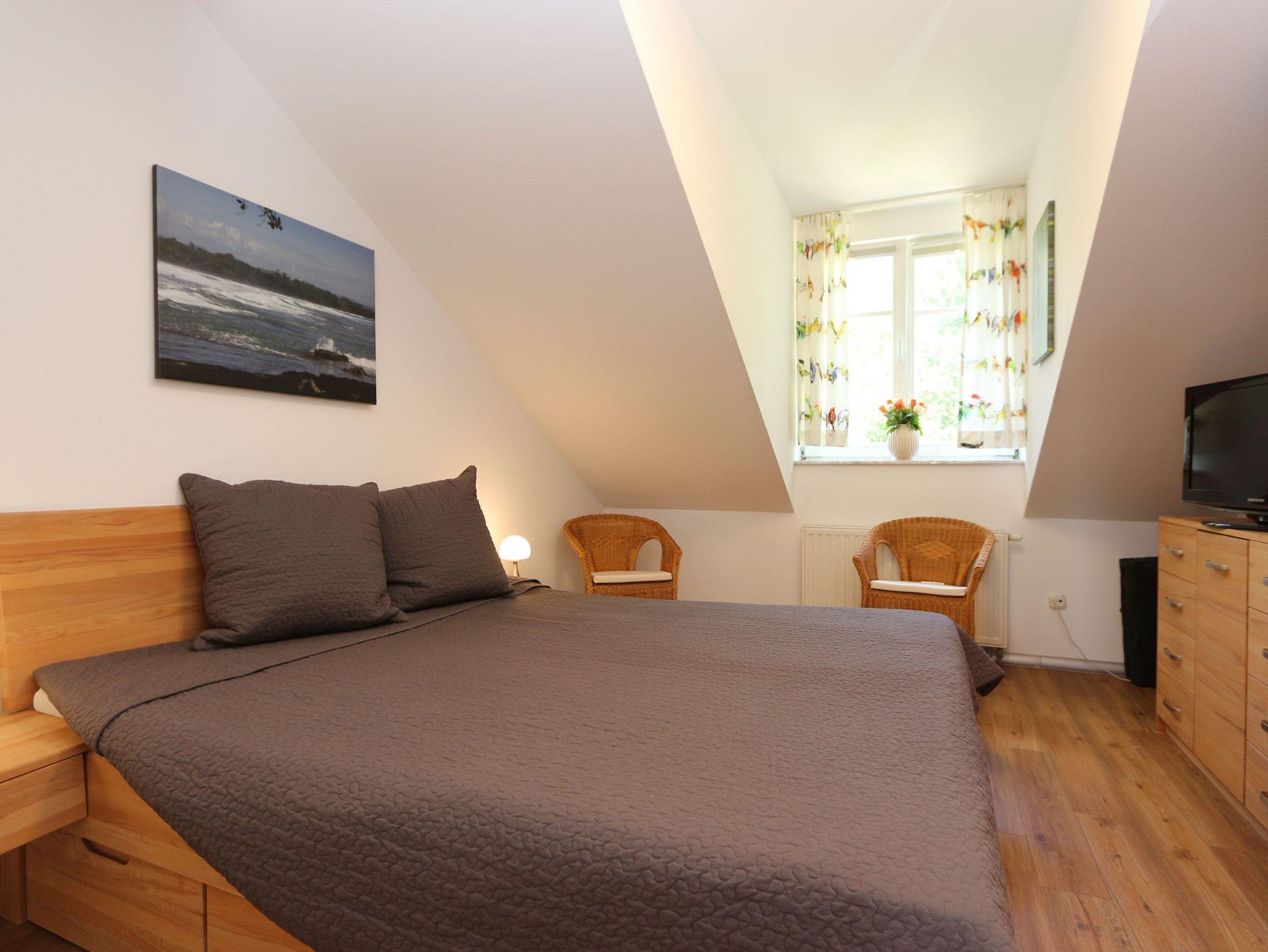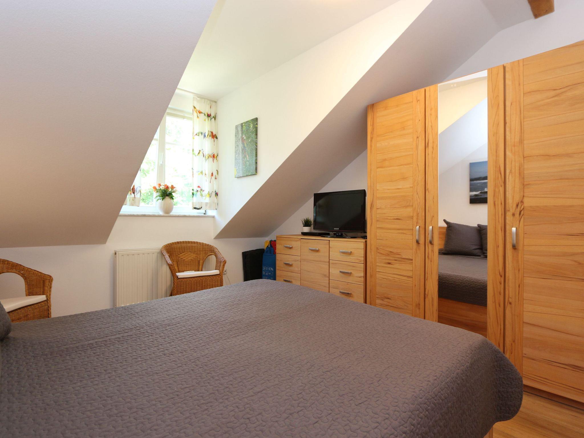 • Schlafzimmer mit exklusivem Schubladenbett (ca. 160 x 200 cm) mit verstellbaren Lattenrosten und Qualitaetsmatrazen, grosser Kleiderschrank mit Spiegel und geraeumiger Kommode (alles aus Kernbuche), TV und DVD-Player.