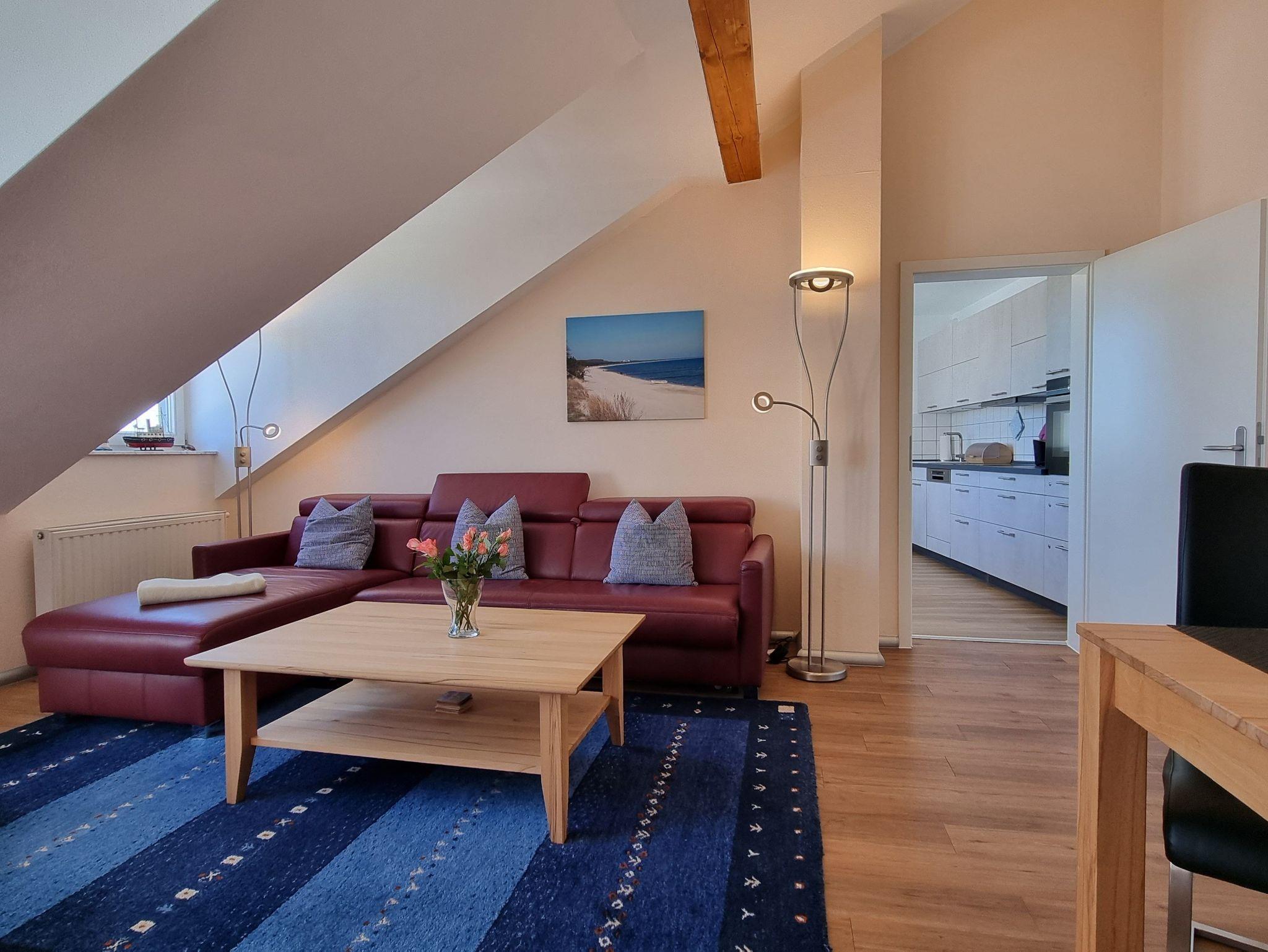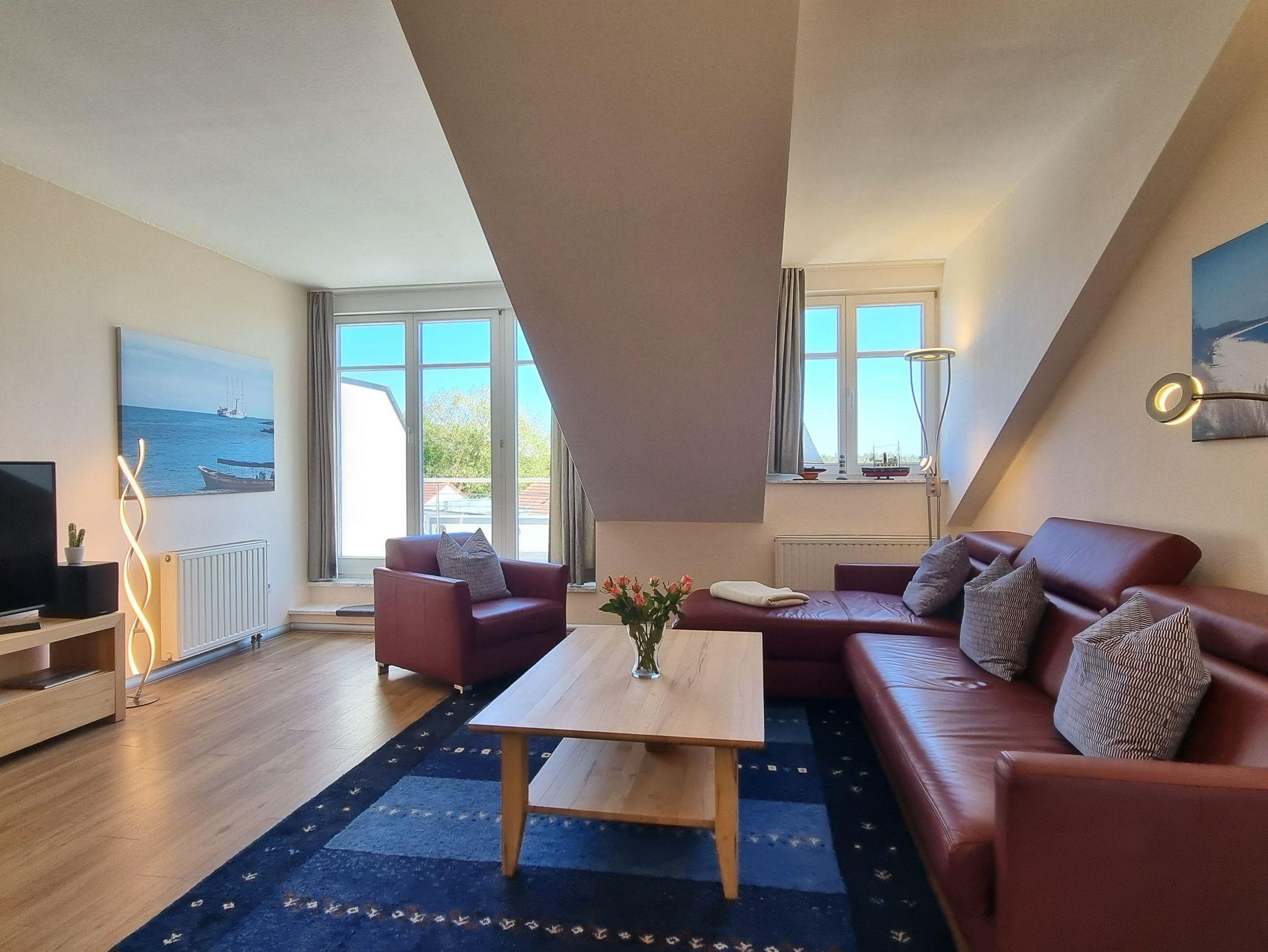 • Helles Wohnzimmer mit Zugang zu einer sonnigen Dachterrasse von welcher man einen freien Ausblick auch auf das Achterwasser hat, einem bequemen und gemütlichen und breiten Sofa mit Longchair in Echtleder mit verstellbaren Kopfstützen und einem zugehörigem Leder- Sessel-