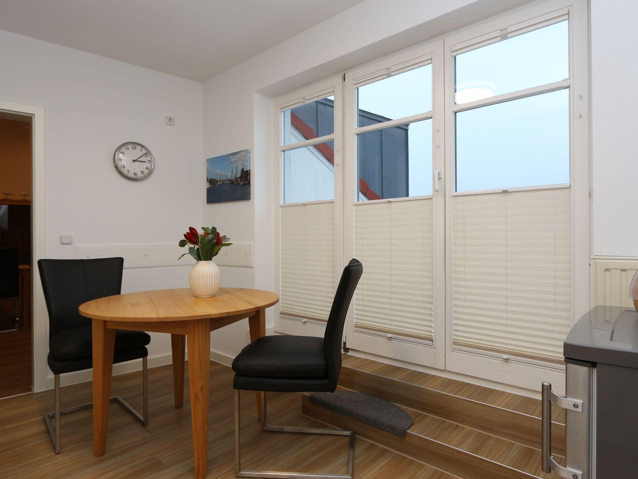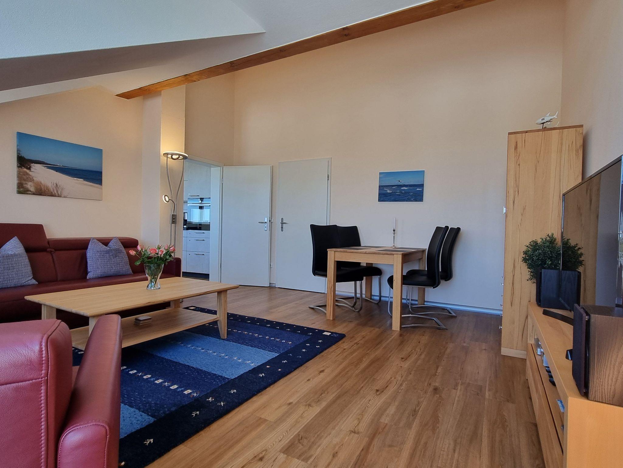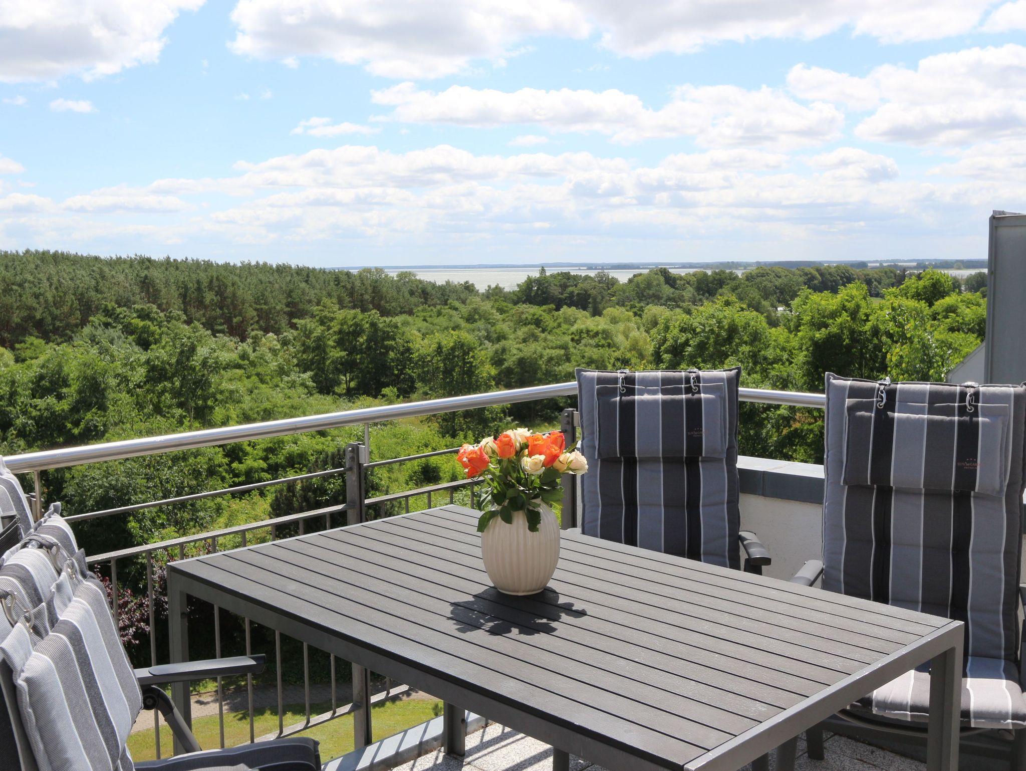 • Diese Wohnung verfügt über Wohn- und Esszimmer, Schlafzimmer, Küche, Bad und 2 Süd-Dachterrassen. Bodentiefe Fenster und Balkontüren zu den 2 Dachterrassen gewähren vom Wohnzimmer und der Küche einen wunderbare Panoramablicke über die Insel und das Achterwasser.