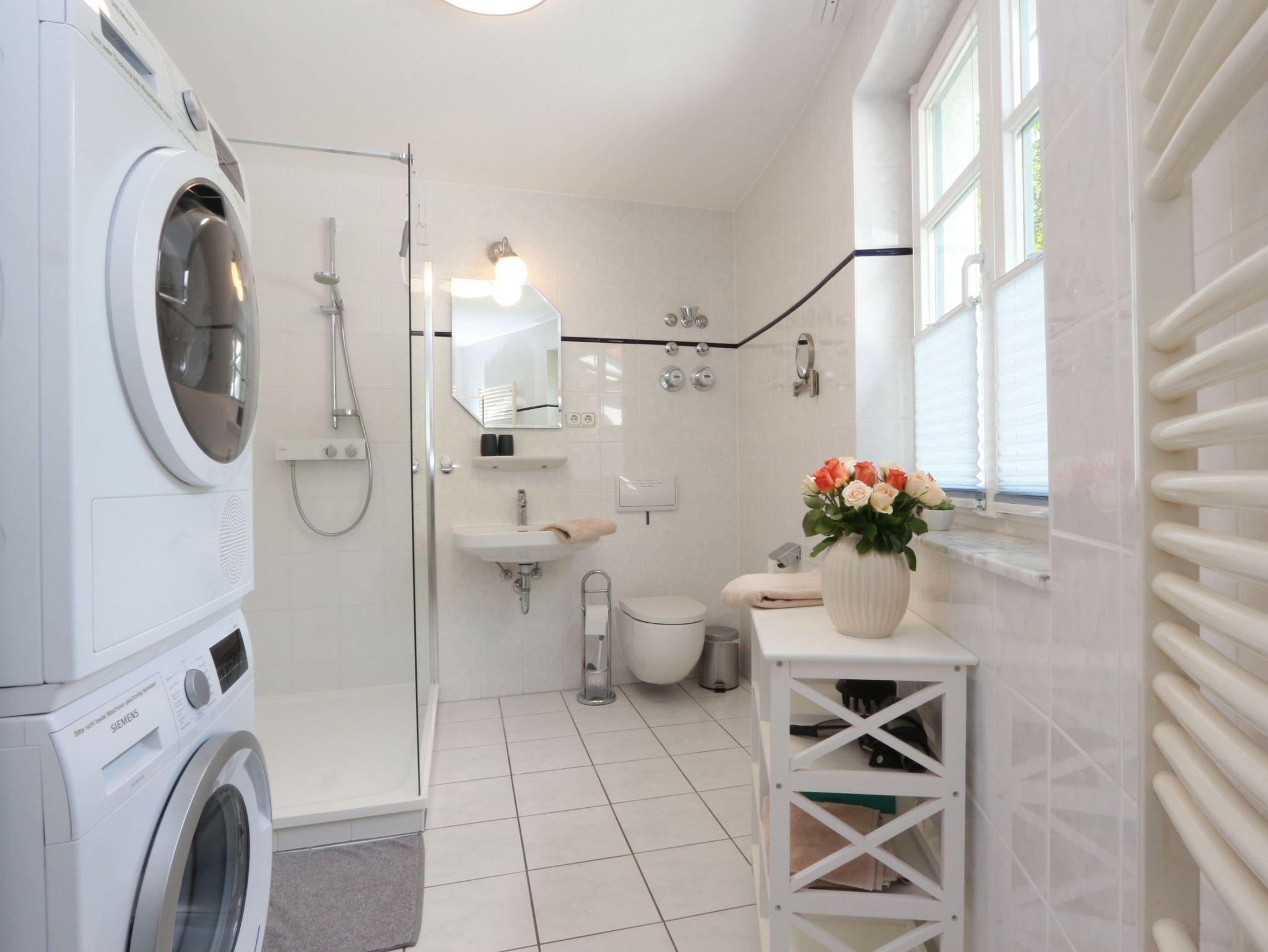 • Bad mit großzügiger Dusche (Tiefeinstieg), Waschmaschine, Wärmepumpen-Wäschetrockner und Handtuchtrockenheizkörper.