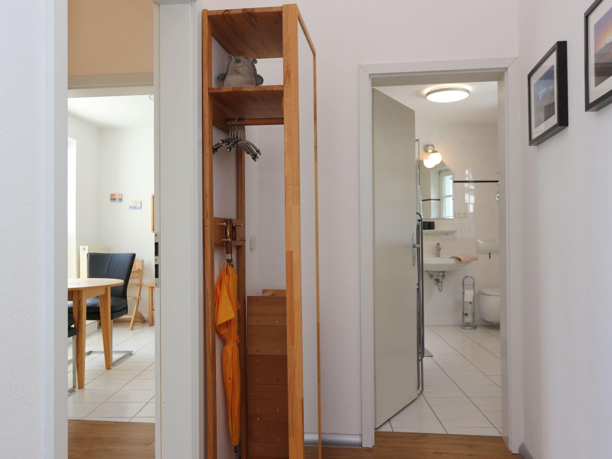 • im Flur eine Garderobe mit Spiegel, ein Schuhregal und ein Hocker;