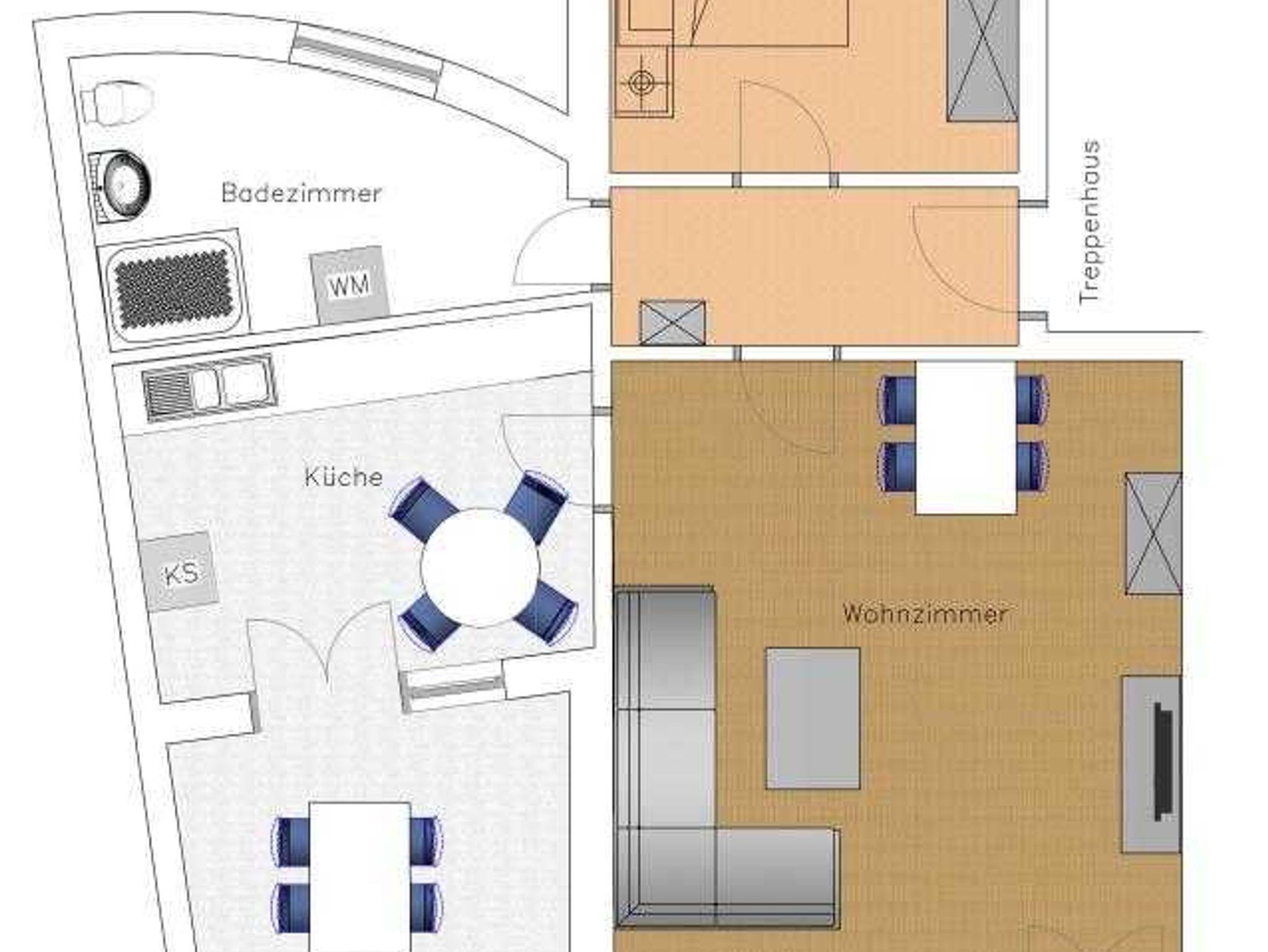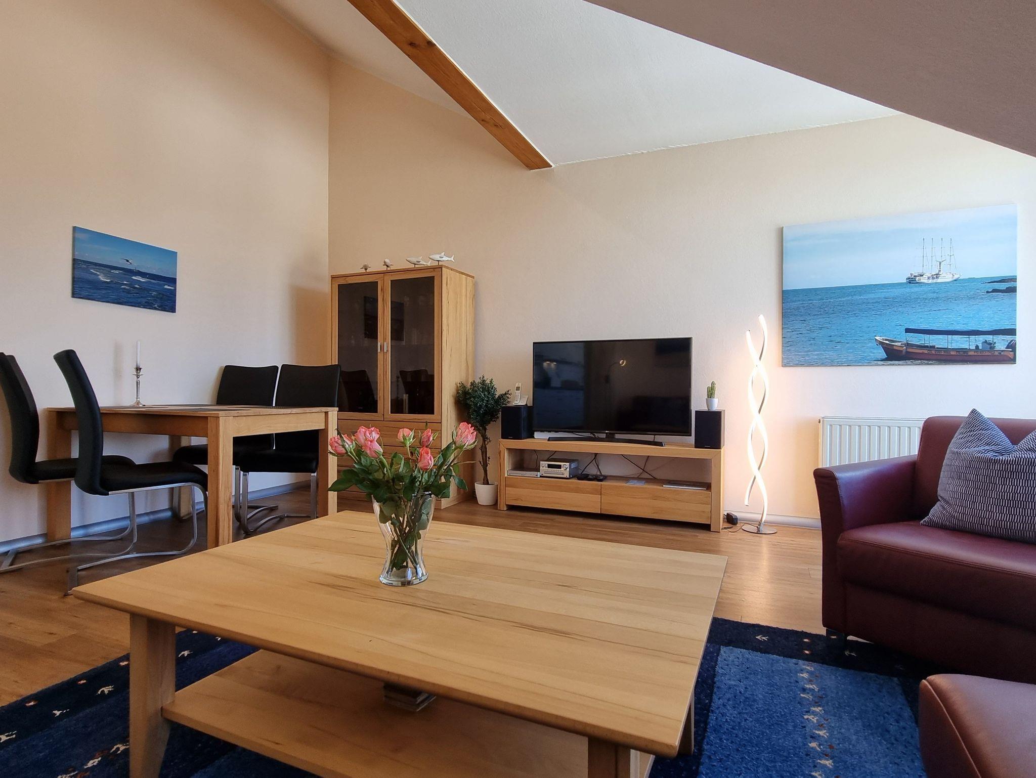Vitrine, und Couchtisch und TV-Tisch in Kernbuche (Vollholz), einem 49 Zoll Flachbildfernseher mit CI-Schacht und USB und HDMI-Anschluss, Sat-TV-Anschluss, CD/DVD-Player, Telefon, kostenloses Highspeed W-LAN über Glasfaser (bei Ausfall kein Anspruch auf Regress), einem Esstisch (Kernbuche) mit 4 Stühlen,