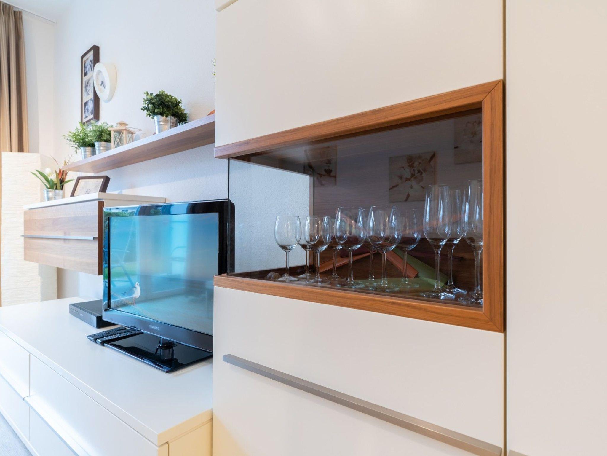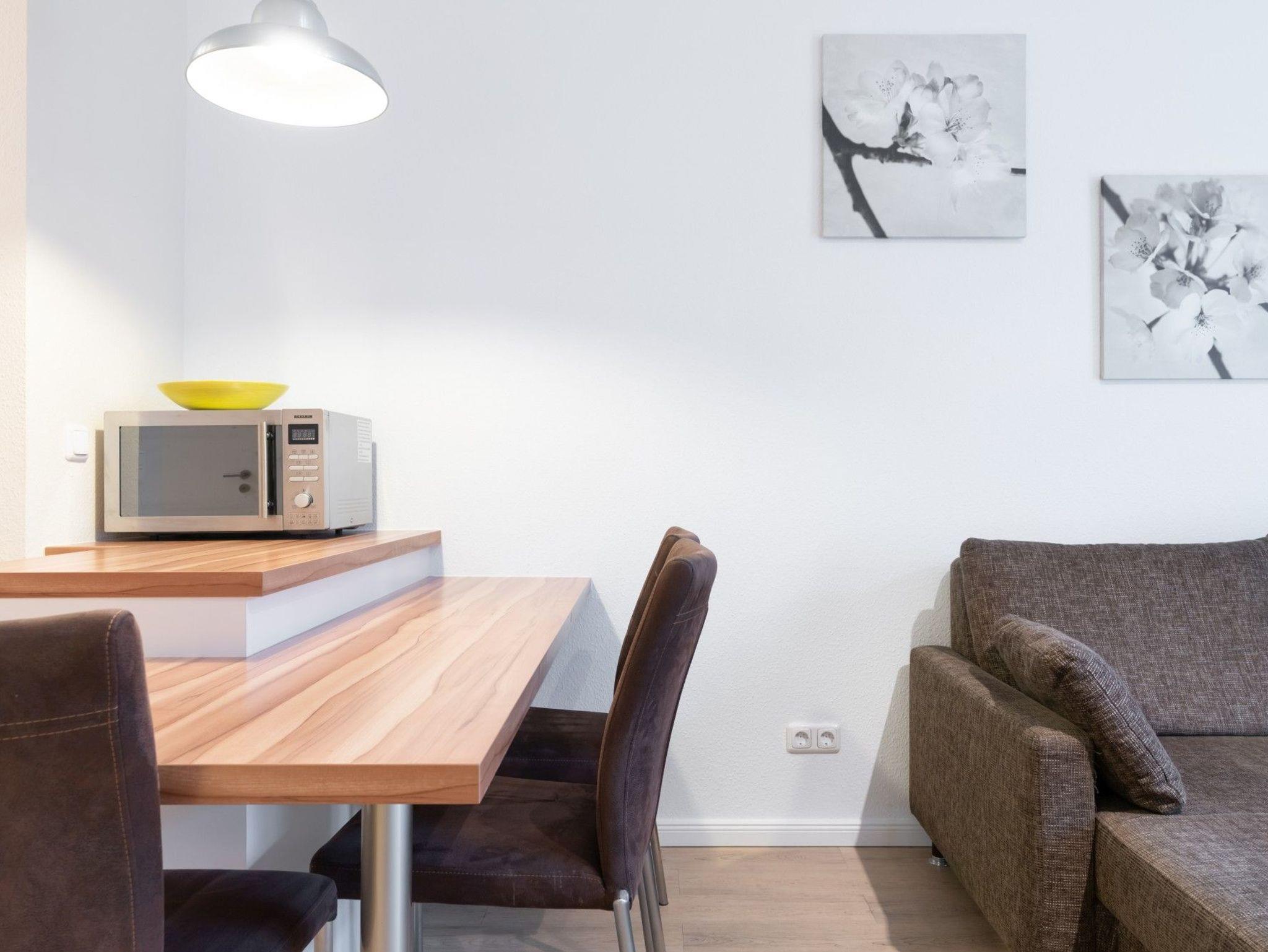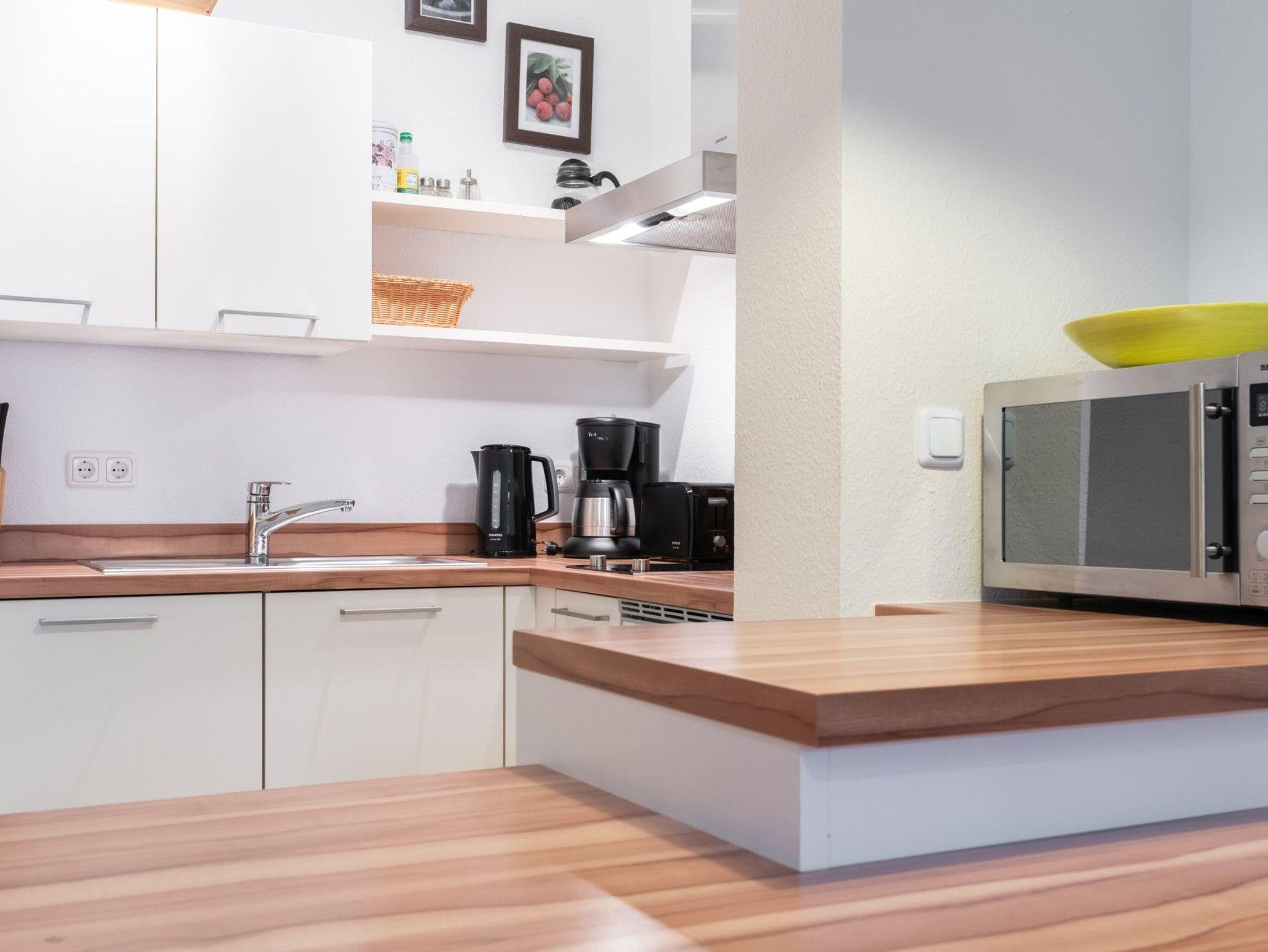 Die hier angrenzende Küchenzeile ist mit einem Kühlschrank mit Gefrierfach, einem Geschirrspüler, einer Mikrowelle mit Backofenfunktion und einem Cerankochfeld ausgestattet. Eine Kaffeemaschine, ein Toaster und ein Wasserkocher stehen Ihnen hier selbstverständlich zur Verfügung.