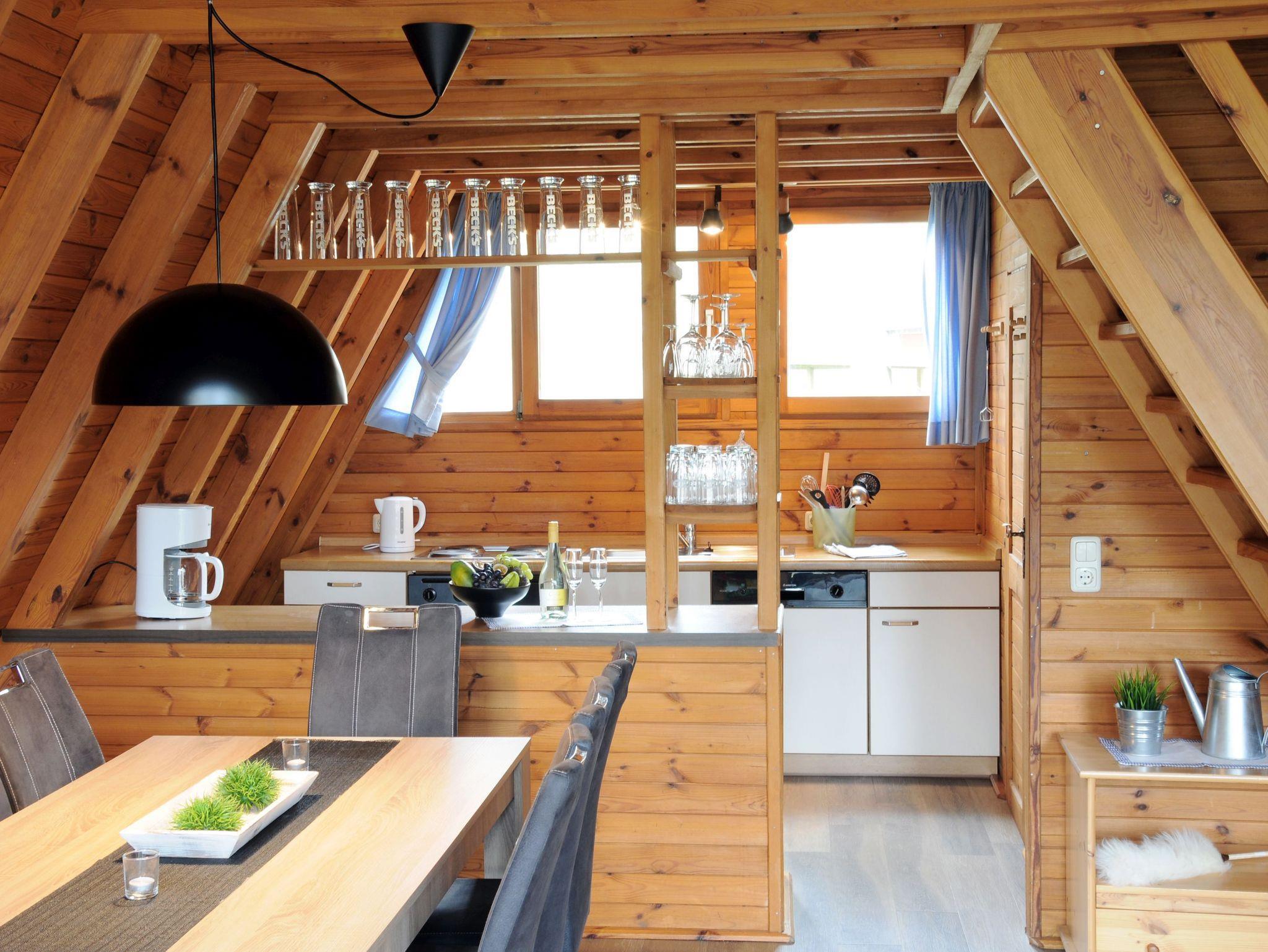 Rustikale Finnhütte mit großzügigem Wohn-/Esszimmer mit offener Küche und Terrassenzugang.