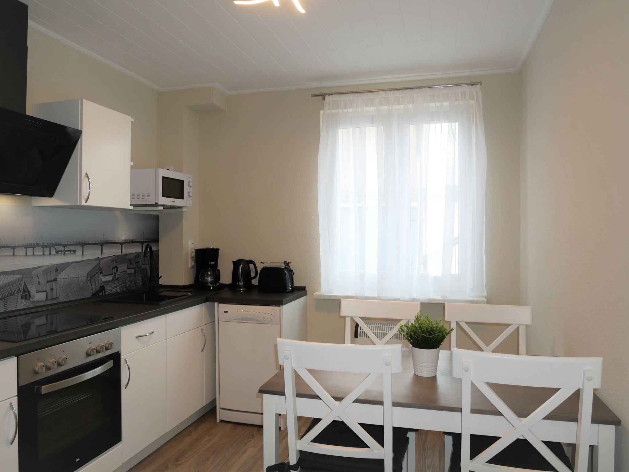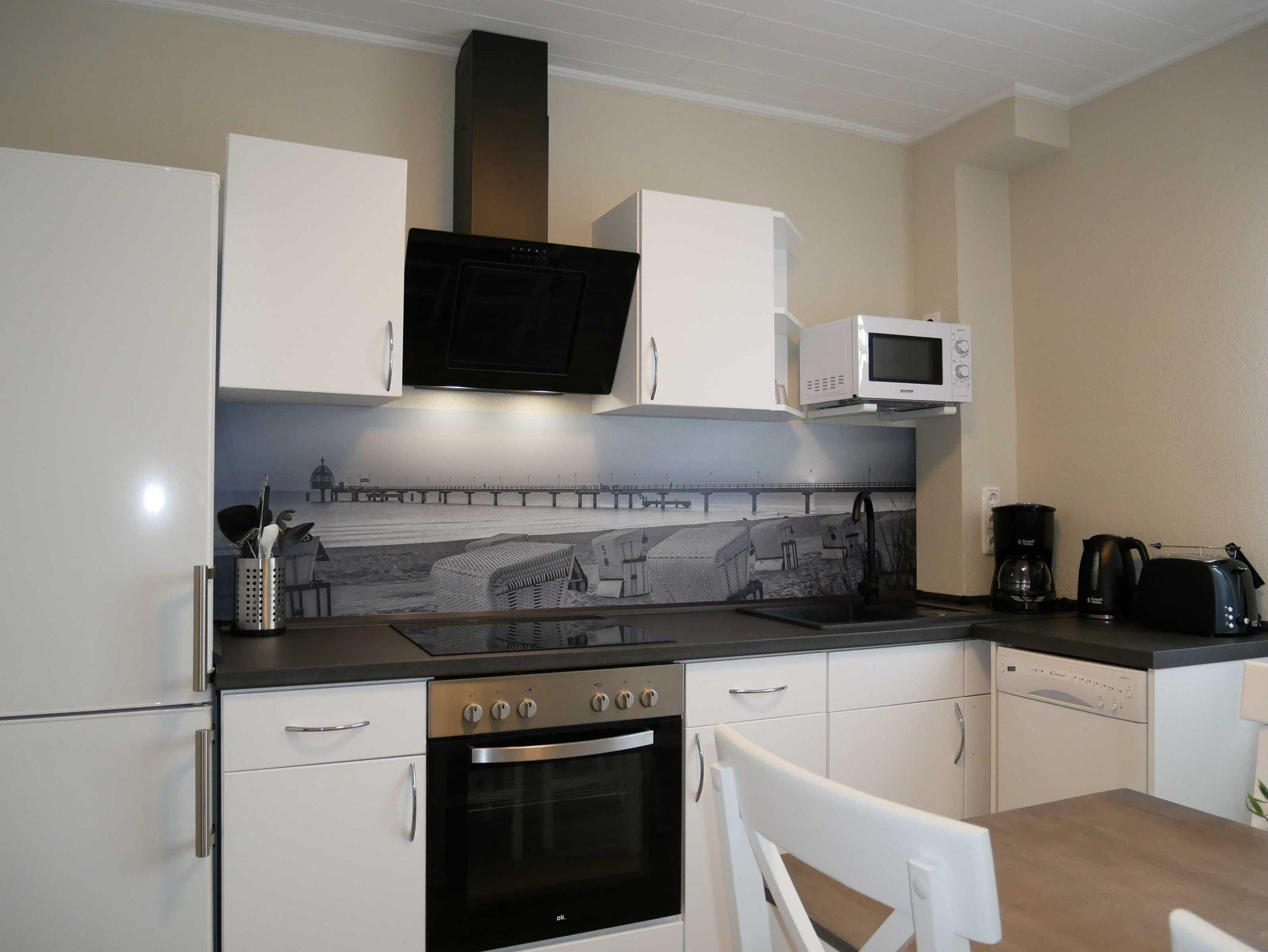 Die Küche bietet die Möglichkeit mit einem Herd (4 Kochplatten), dem Backofen und der Dunstabzugshaube ausgiebig zu kochen oder zu backen. Die Küche verfügt außerdem über einen Toaster, Kaffeemaschine, Wasserkocher, Kühlschrank mit Gefrierfach, Mikrowelle und einen Geschirrspüler.