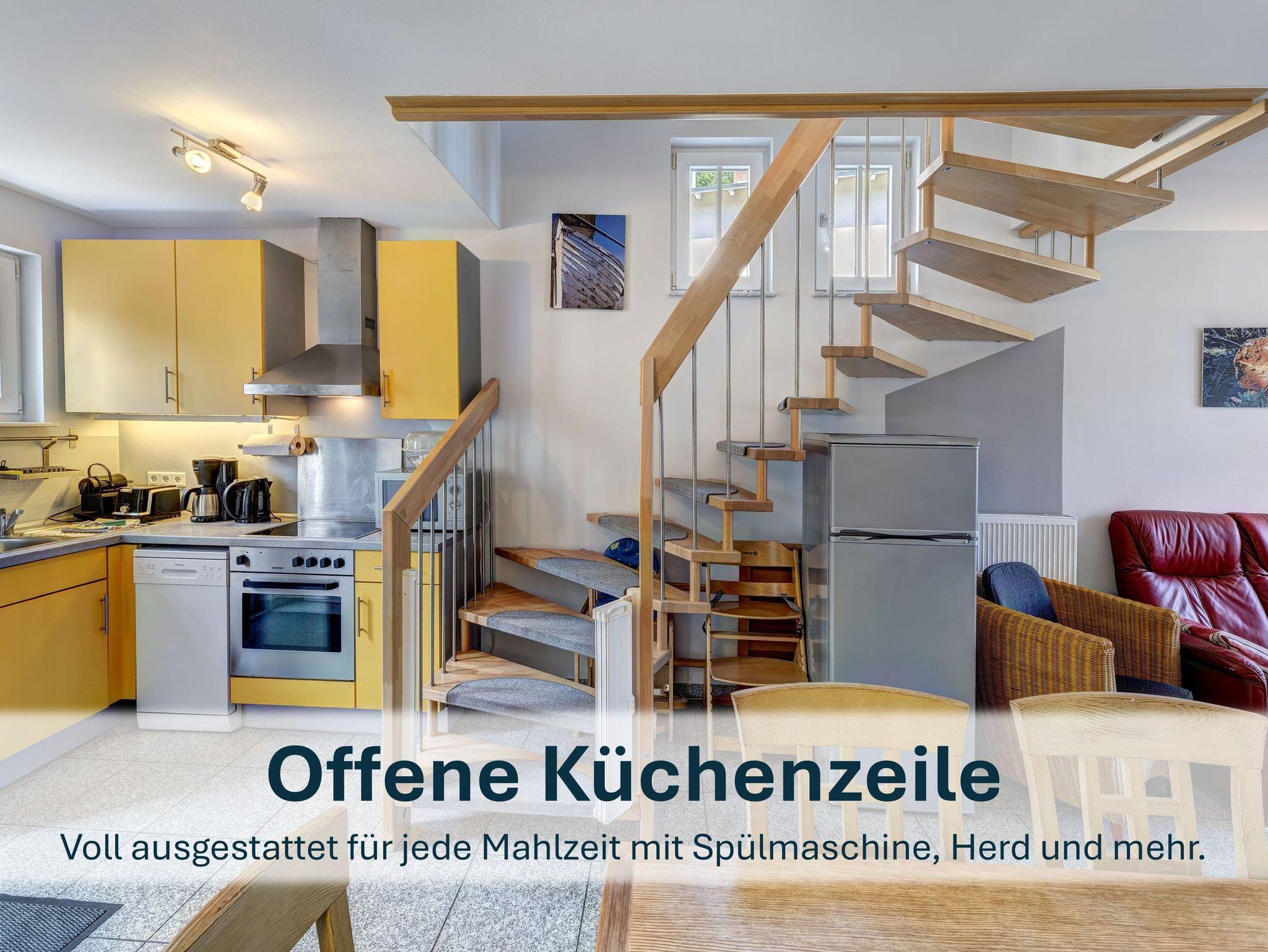 ? Offene, voll ausgestattete Küche (u.a. mit Spülmaschine, Mikrowelle, Kühl-Gefrierkombi, Kaffeemaschine),