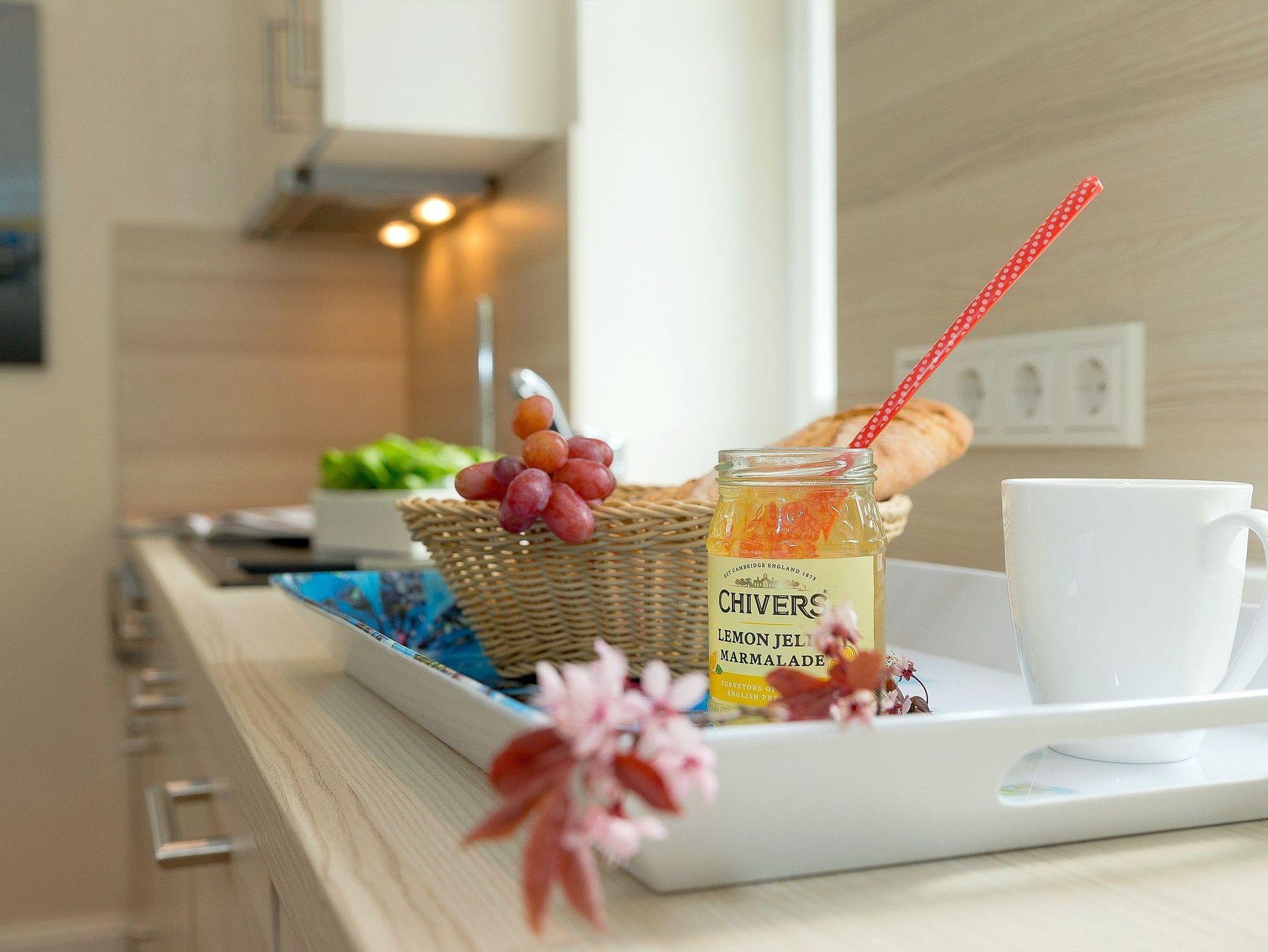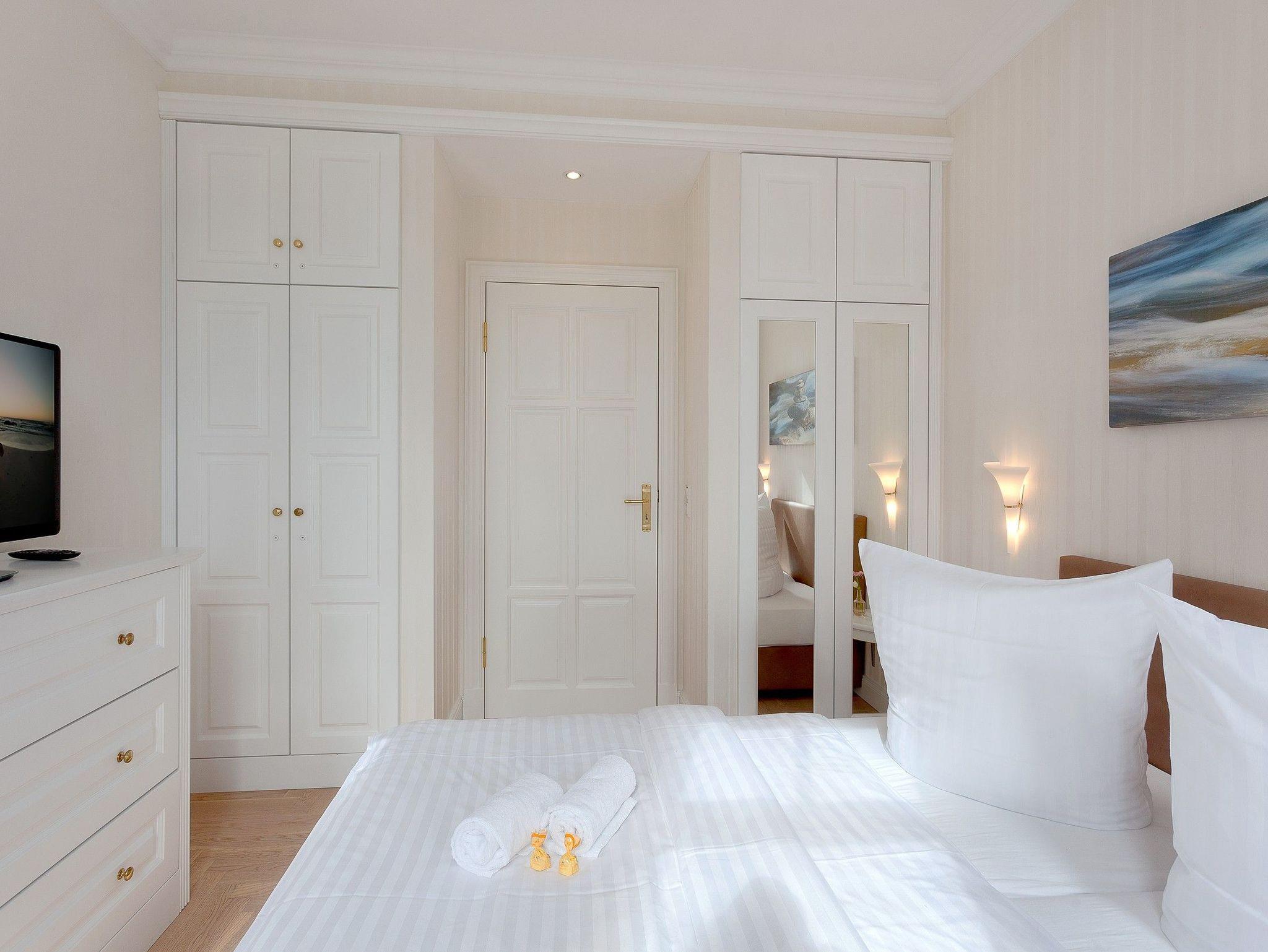Die moderne, komplett ausgestattete Küche mit Backofen, Kühlschrank mit Gefrierfach, Geschirrspüler, Wasserkocher, Toaster und Kaffeemaschine ist harmonisch in den Wohnbereich integriert und bietet alles, was Familien für komfortable Urlaubstage benötigen. Das Appartement verfügt über zwei gleichwertige Schlafzimmer, jeweils mit einem Doppelbett (180 x 200 cm) und einem eigenen Flat-TV. Ein Schlafzimmer bietet direkten Zugang zum Südost-Balkon. Für Familien mit kleinen Kindern ist die zusätzliche Aufbettung im Babyreisebett (bis ca. 3 Jahre) möglich.