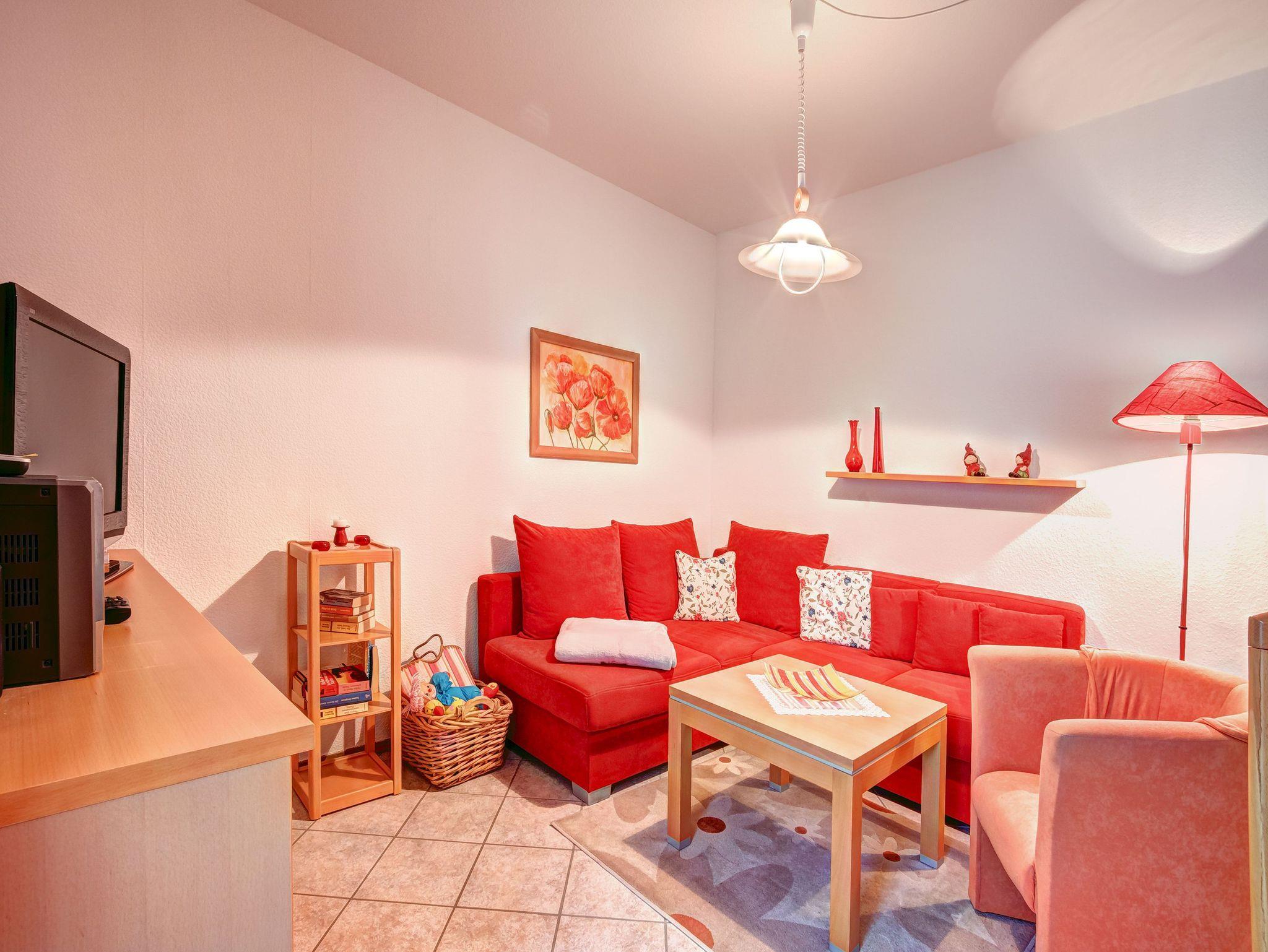 Die Wohnung verfügt über ein gemütliches Schlafzimmer, ausgestattet mit einem komfortablen Doppelbett und zwei Fenstern. Das lichtdurchflutete Wohnzimmer bietet eine großzügige Sitzecke, die zu entspannten Stunden und geselligem Beisammensein einlädt. Die großen Fenster lassen die frische Ostseeluft hereinströmen, während dezente Dekoelemente an die Nähe zum Strand erinnern. Für zusätzlichen Komfort sorgt der Flachbildfernseher.