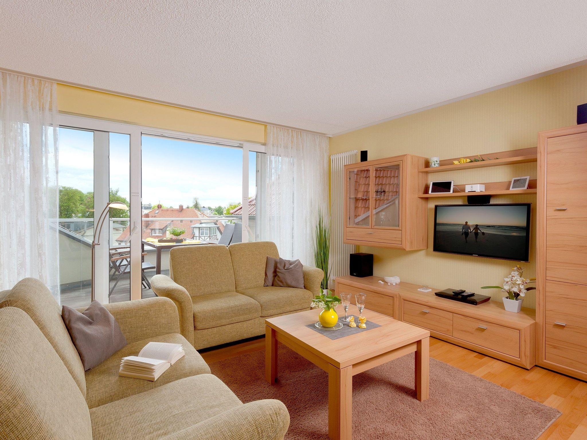 Vom Wohnzimmer ist auch der Zugang zum großzügigen Balkon mit Südwestlage möglich. Technisch lässt das Wohnzimmer mit 40 Zoll 3D-LED-TV, 5.1 Blueray Heimkinoanlage sowie WLAN-Verbindung keine Wünsche offen.