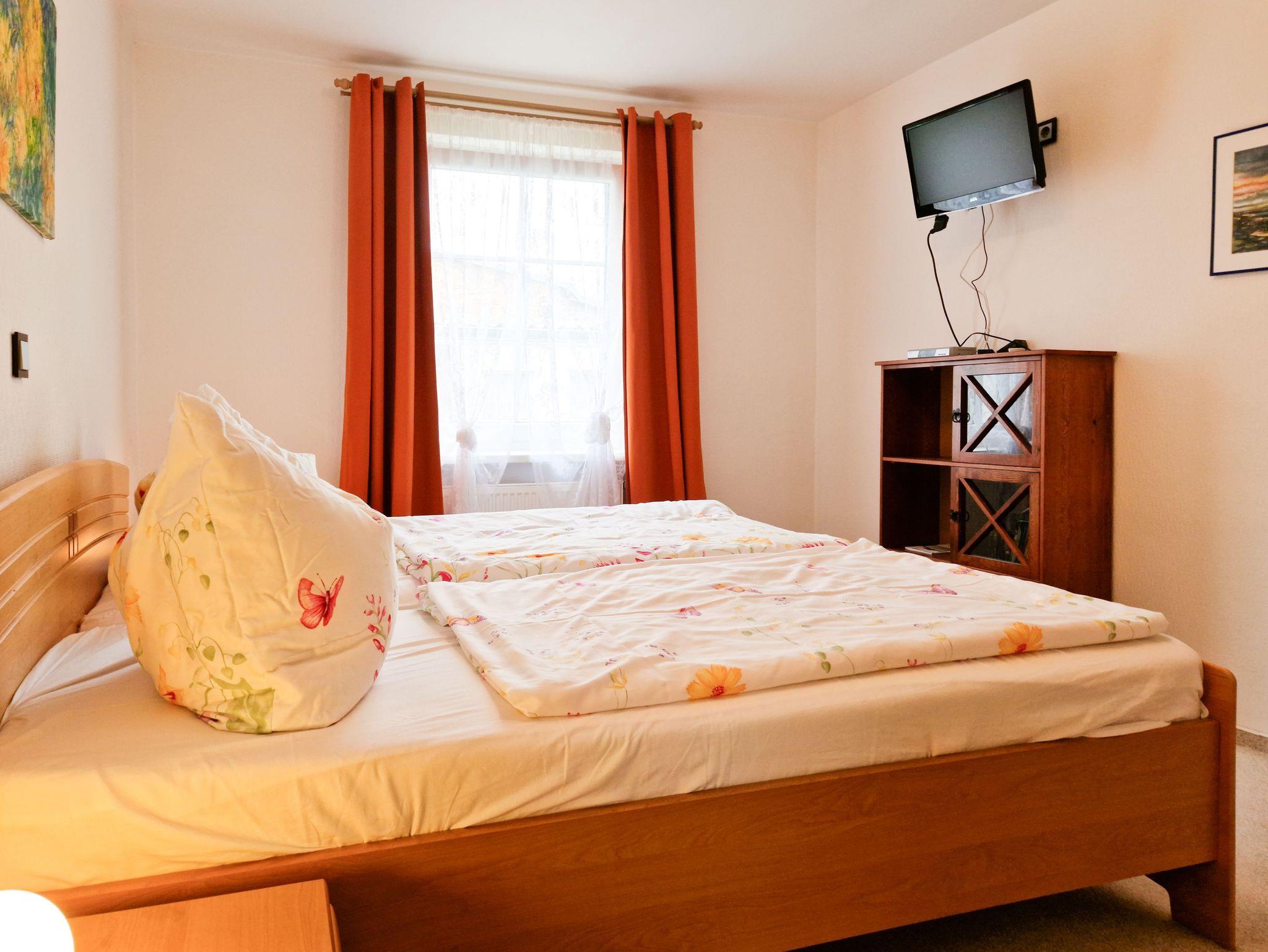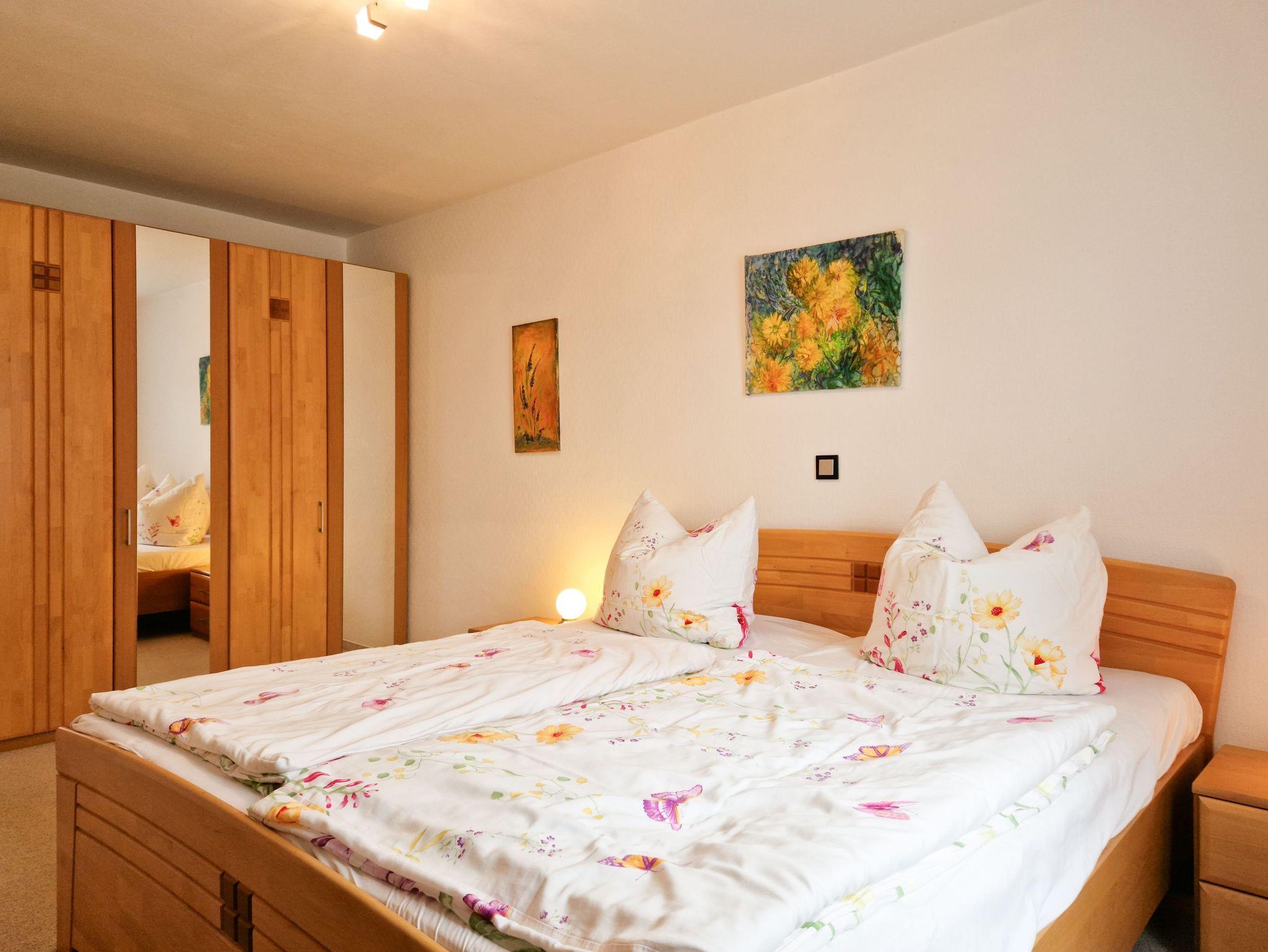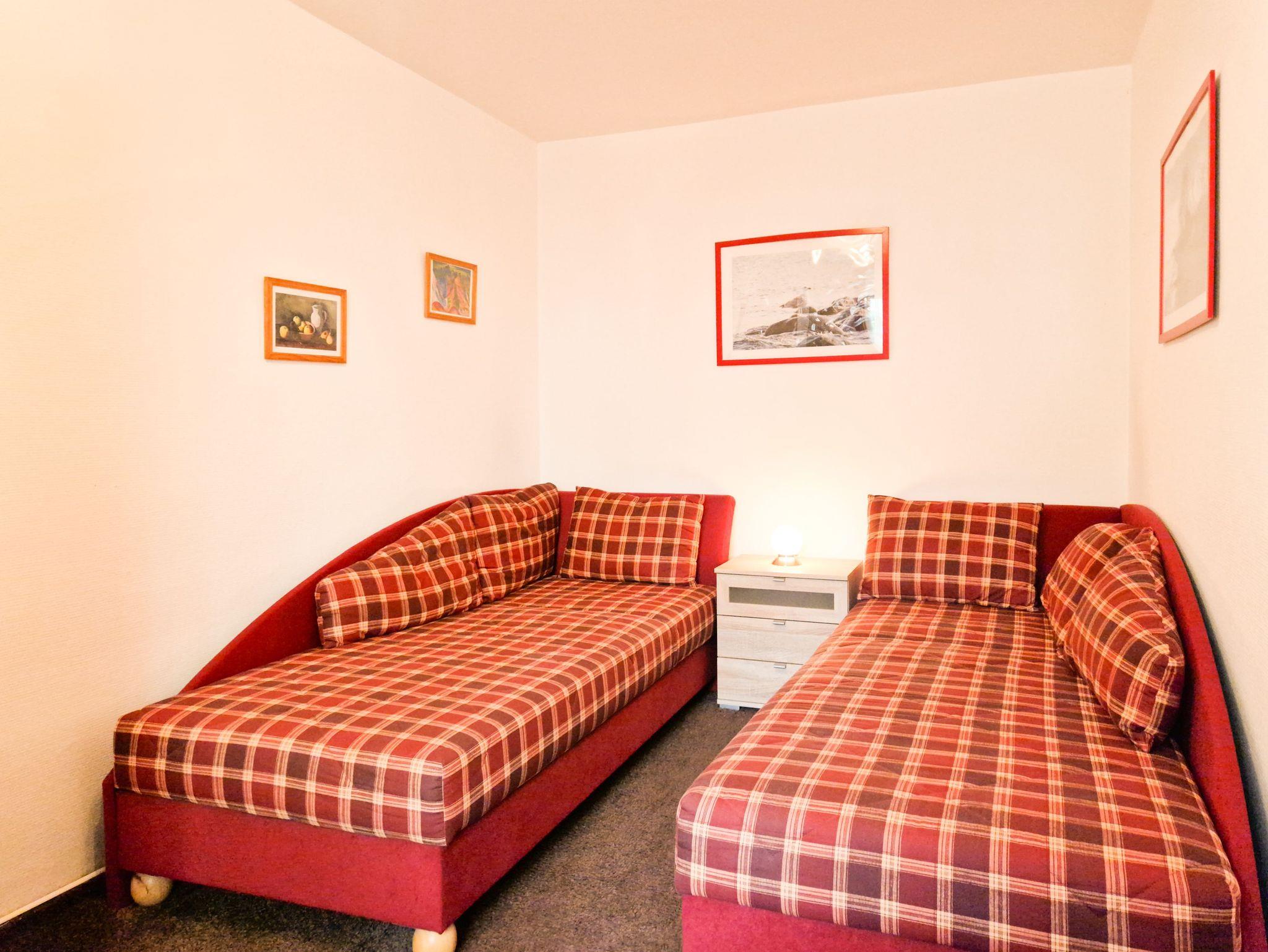 Die Wohnung bietet zwei liebevoll eingerichtete Schlafzimmer: eines mit einem bequemen Doppelbett und das andere mit zwei gemütlichen Einzelbetten - perfekt für Freunde oder Familienmitglieder, die gemeinsam entspannen möchten.