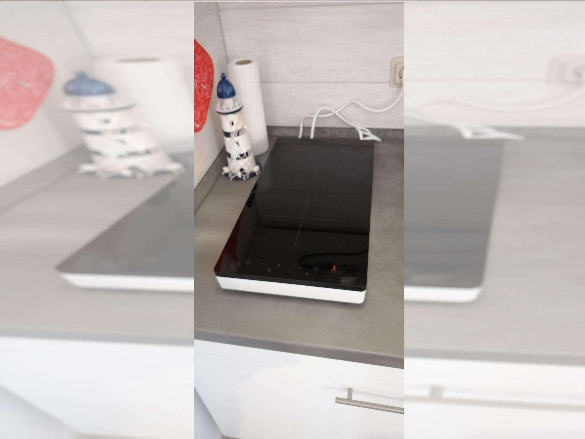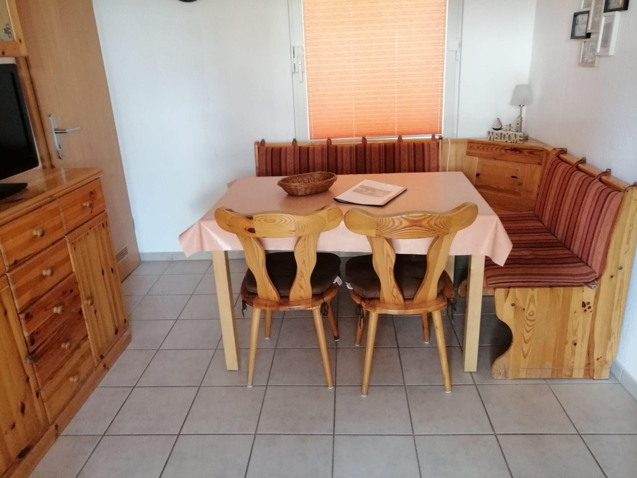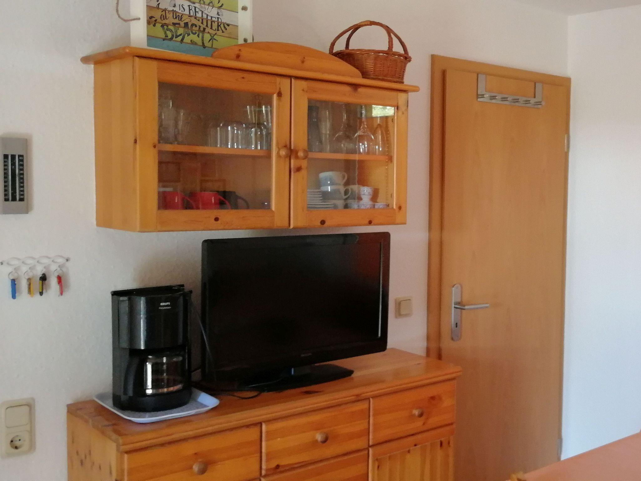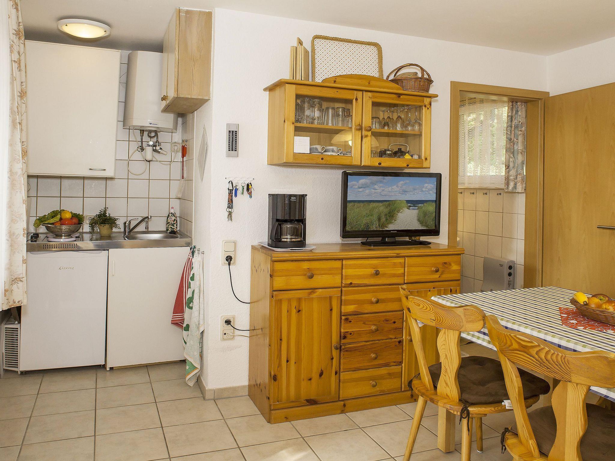 Wohnraum mit Essecke und kleiner Küchenzeile mit Herd, Kühlschrank, Spüle und Anrichte sowie Kabel-TV, Radio und Kaffeemaschine