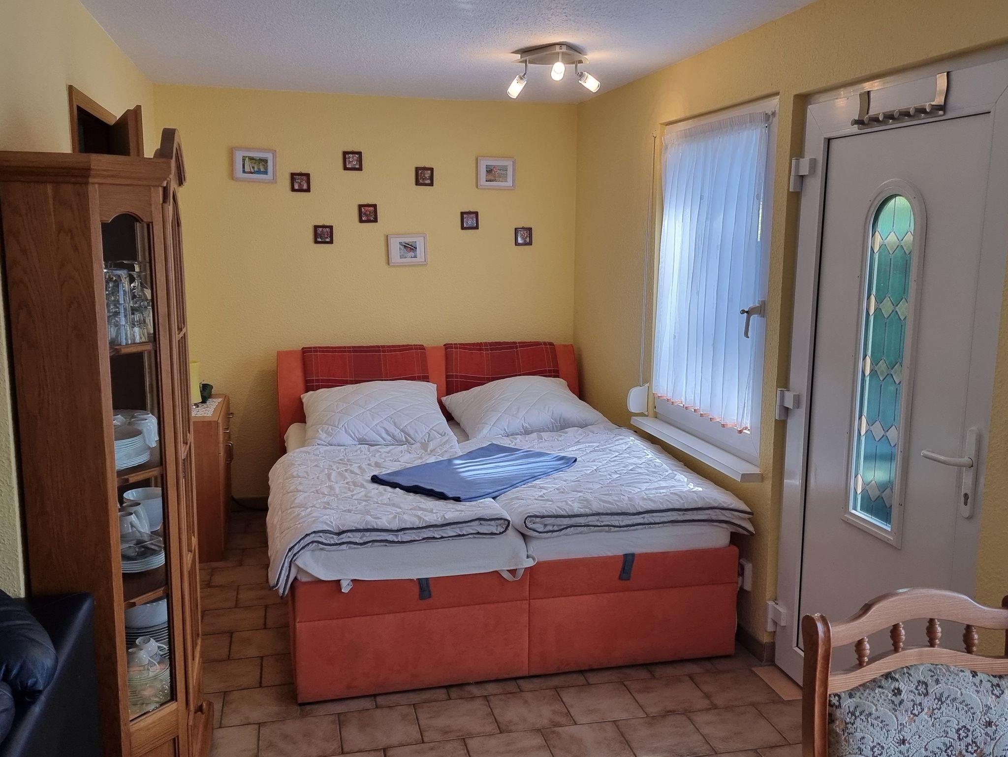Geräumiger Bungalow mit einem Wohnraum (1,60 x 2 m Bett), einem Schlafzimmer (1,40 x 2 m Bett), eine im Wohnraum integrierte Kochnische mit Miniküche, Mixer und Padmaschine-Senseo, Dusche/WC mit Fön und eine möblierte Terrasse mit Grillmöglichkeit. Auf der Terrasse können Sie auf der Hollywoodschaukel die Seele baumeln lassen. Kabel-TV, DVD/CD, Radio sowie WLAN vorhanden.