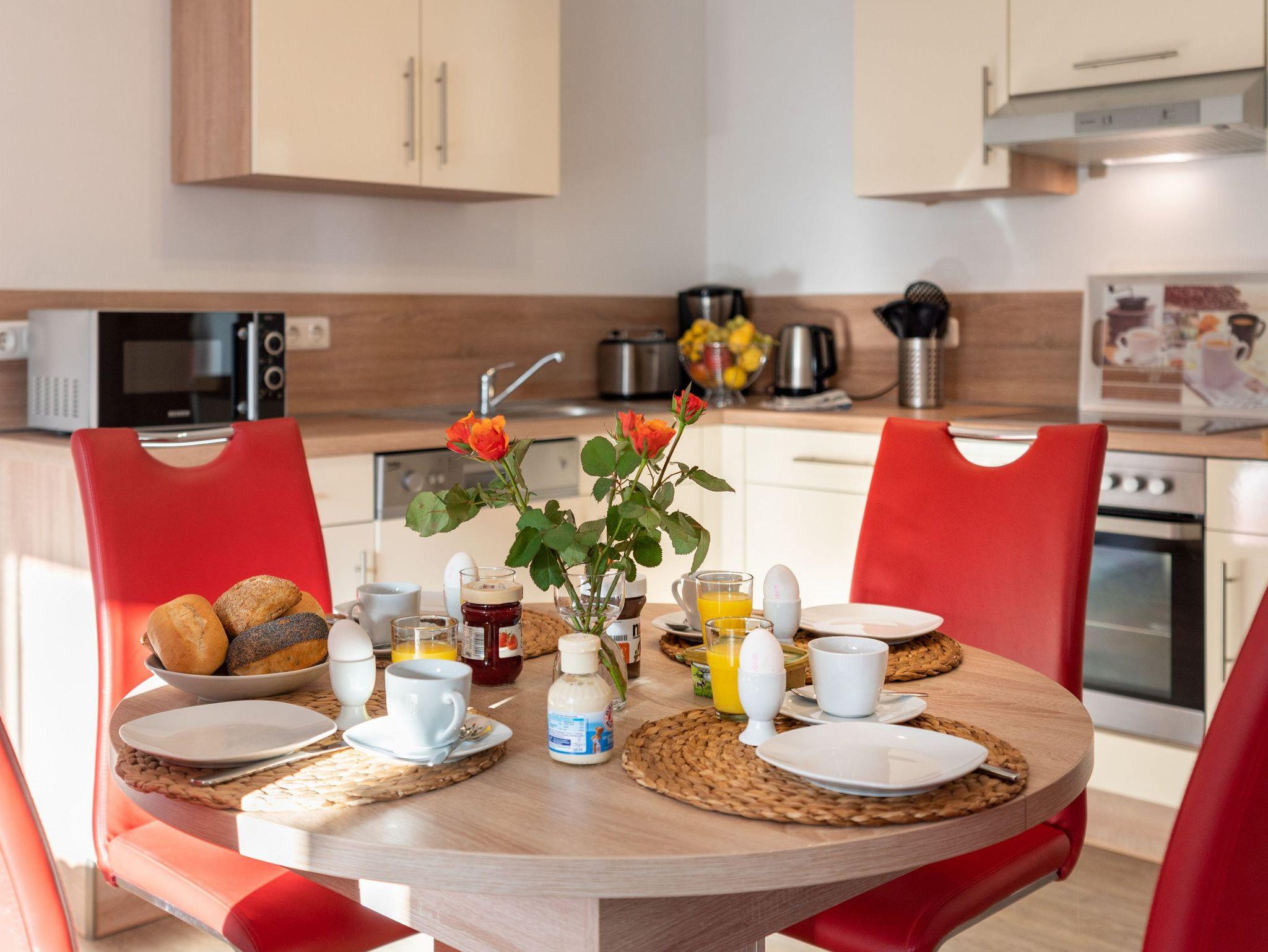 Die Küchenzeile mit Essecke für 4 Personen lässt keine Wünsche offen: Kühlschrank mit Gefrierfach, Ceran-Kochfeld, Backofen, Mikrowelle, Geschirrspülmaschine, Kaffeemaschine, Toaster und Wasserkocher, u.v.m.