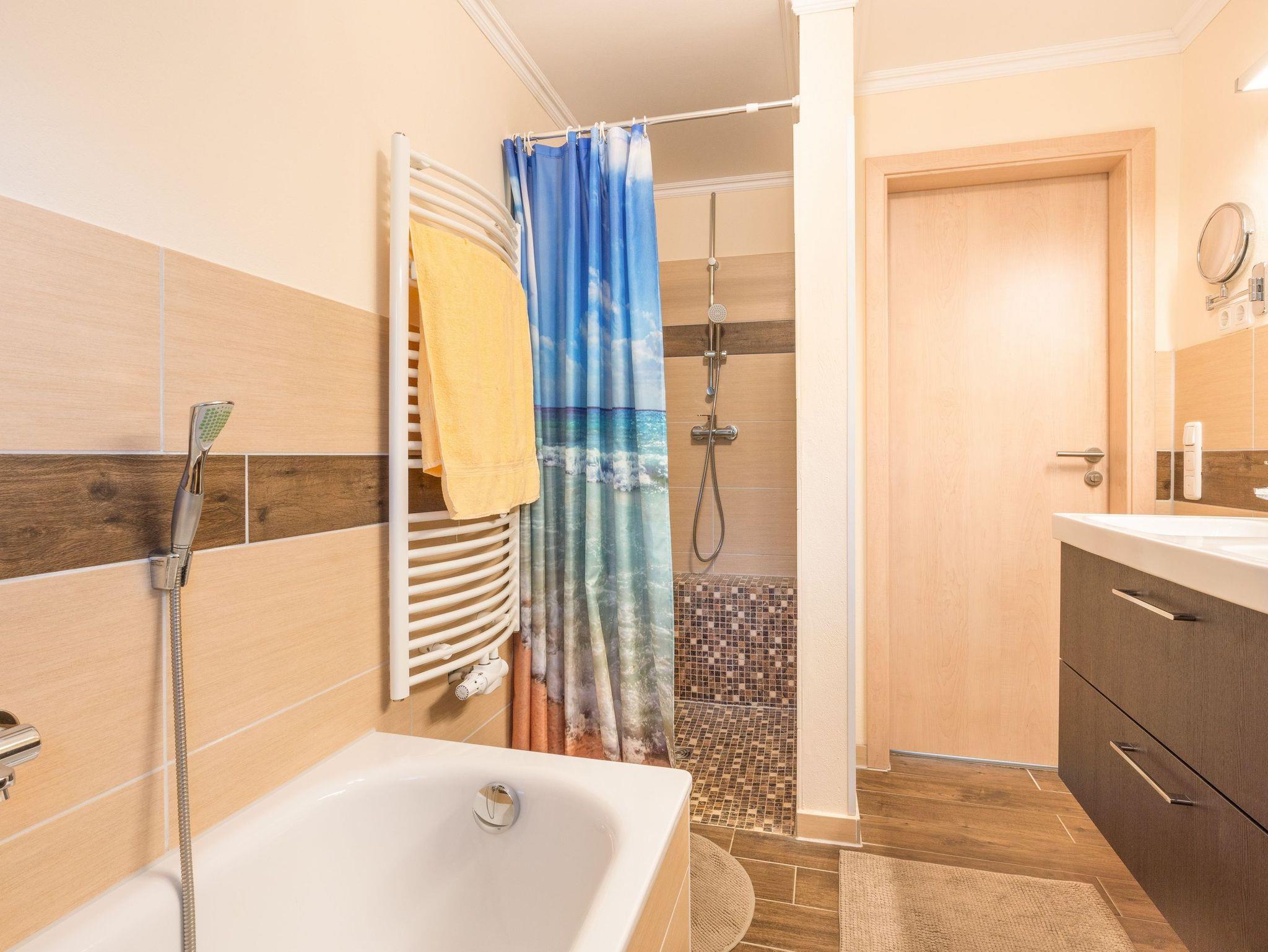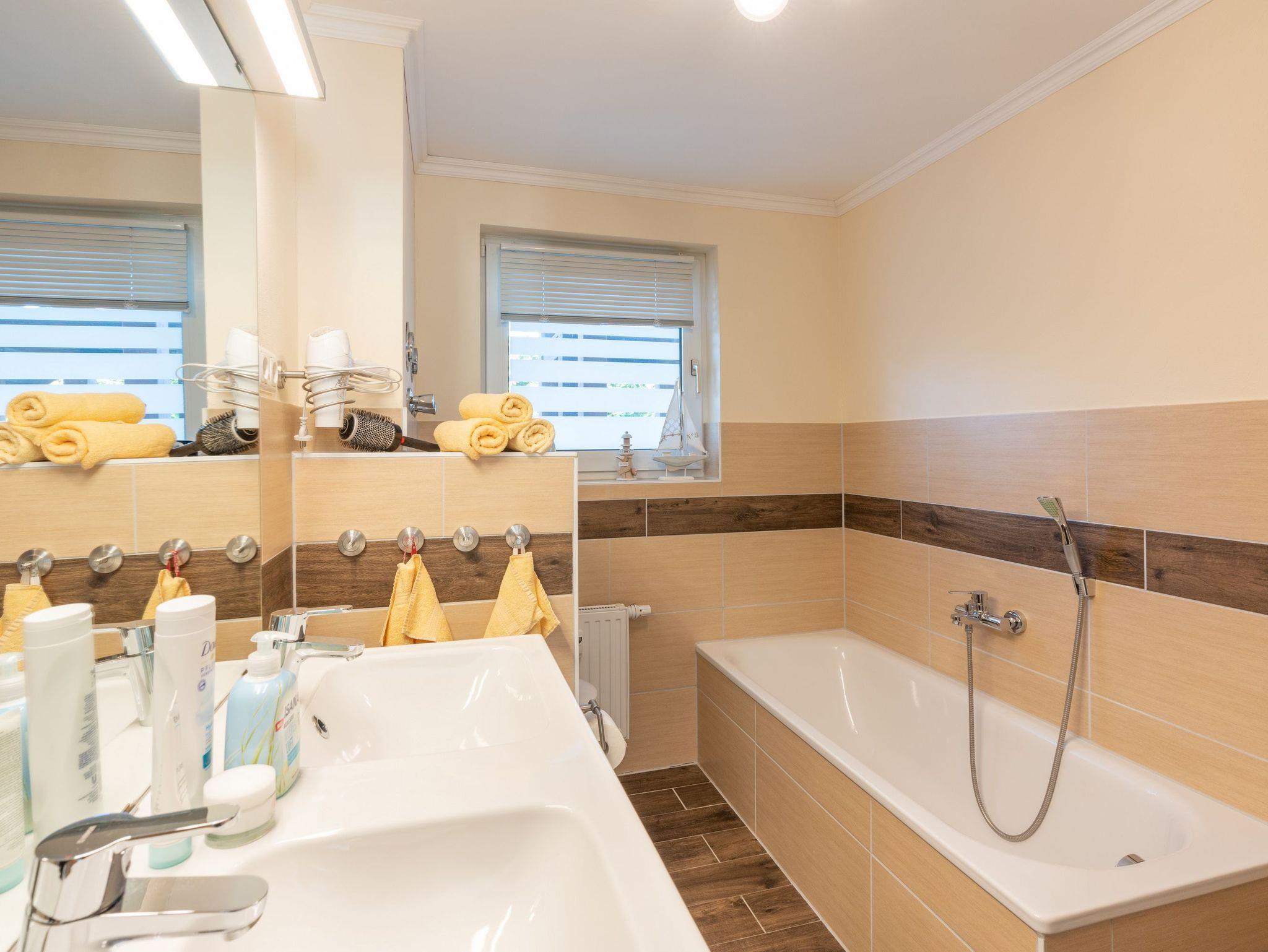 Damit Sie Ihre wohlverdiente Urlaubszeit bereits am Anreisetag in vollen Zügen genießen können, haben wir das Bett für Sie und das für Ihre lieben Mitreisenden bereits bezogen und ein Duschtuch sowie ein kleines Handtuch bereitgelegt. Das Bad unterstreicht die Annehmlichkeiten dieses Appartements ? mit Dusche und Badewanne sowie einem Doppelwaschtisch und einem Haartrockner.