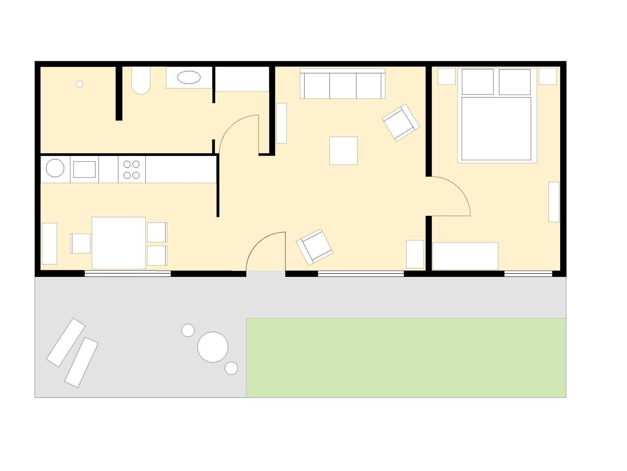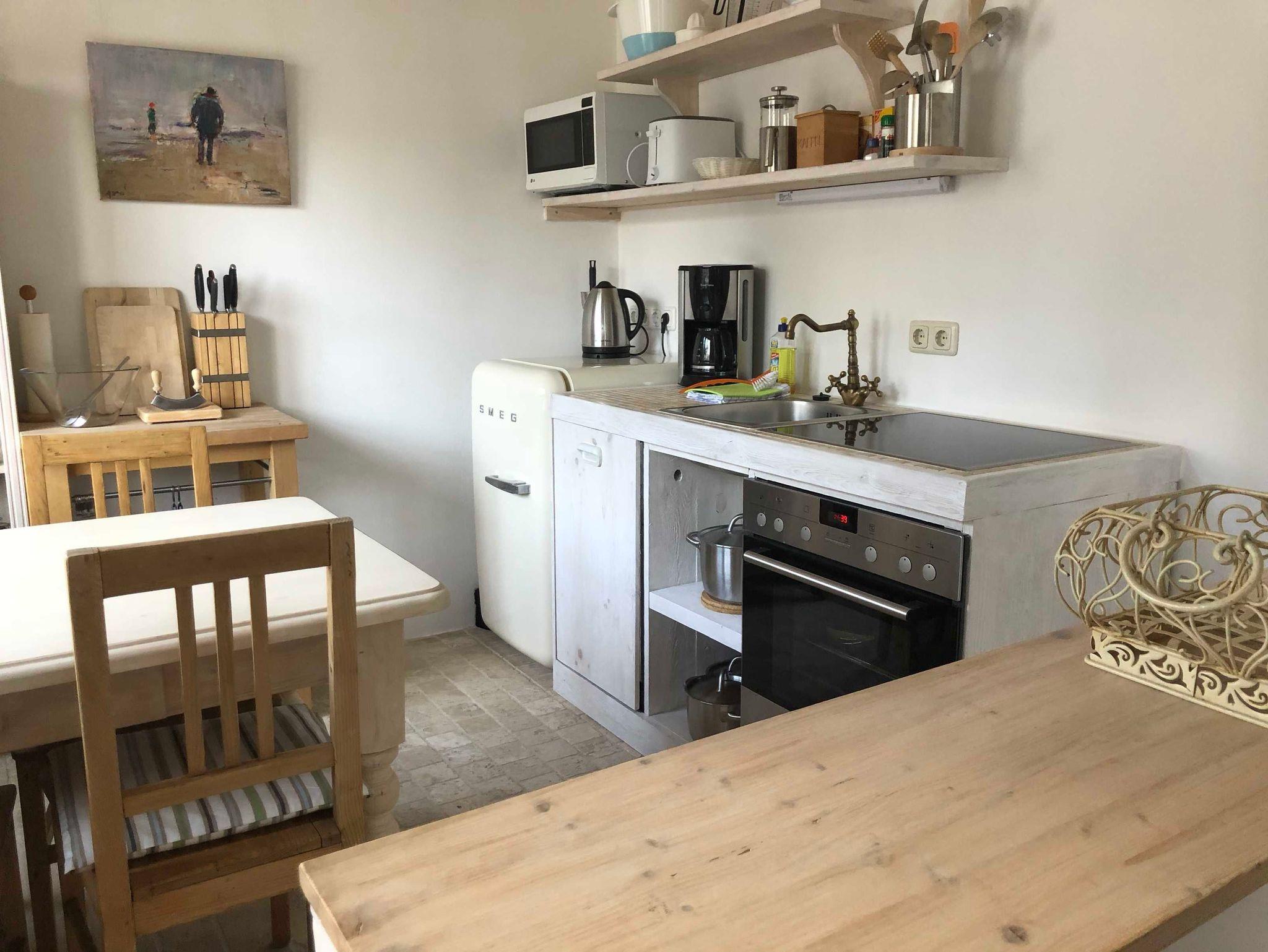 Der 2-Raum-Bungalow (ca. 41m²) verfügt über ein separates Schlafzimmer mit Doppelbett und Kleiderschrank, einen Wohnbereich mit Kaminofen, Tagesbett, Flat-TV mit DVD-Player und einen Essbereich. Die Küchenzeile ist ausgestattet mit einem Kühlschrank, Gefrierfach, Backofen, Geschirrspülmaschine, Toaster, Kochfeld, Kochutensilien, Wasserkocher, Kaffemaschine und einem ital. Espressokocher. Das Bad verfügt über eine offene Dusche, Regenbrause, Fön und Handtuchtrockner. Eine möblierte Terrasse mit mediterraner Bepflanzung gehört zu diesem Appartement.