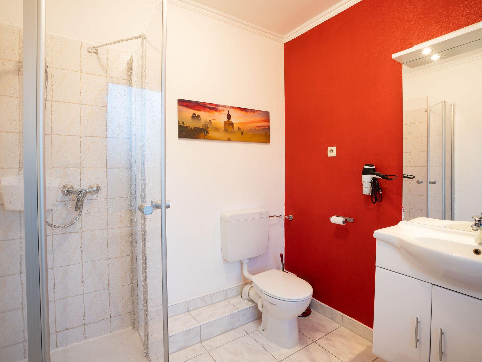Das Badezimmer, welches sich ebenfalls im Erdgeschoss befindet, ist mit Dusche, WC und einem Haartrockner ausgestattet. Über eine freie Treppe erreichen Sie das Wohnzimmer, welches mit Sofa und FlatTV ein idealer Ort für gemütliche Stunden zu zweit ist. Ein zweiter Essbereich im Obergeschoss komplettiert den Urlaubskomfort. Das vom Wohnbereich abgehende Schlafzimmer lädt mit einem gemütlichen Doppelbett (180 x 200cm/ getrennte Matratzen) und einem Schrank zum Verstauen Ihrer Habseligkeiten zum Träumen ein.