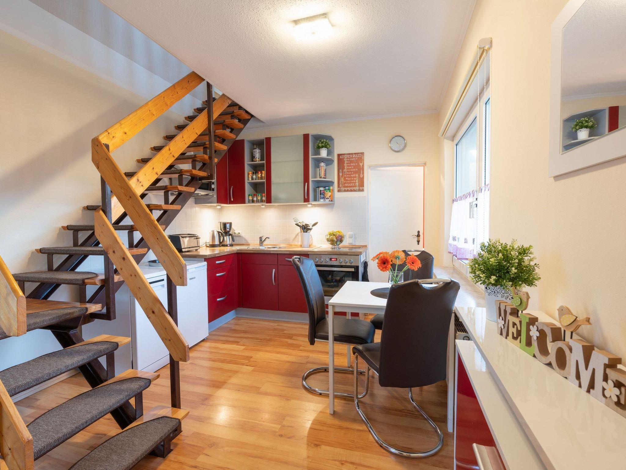 Das stilvoll eingerichetete Maisonette-Appartement empfängt bis zu zwei Gäste im Erdgeschoss mit einer gut ausgestatteten Küchenzeile mit Ceranfeld und Backofen, Kühlschrank mit Gefrierfach, Geschirrspüler, Mikrowelle, Wasserkocher, Toaster, Kaffeemaschine sowie Essplatz für zwei Personen.