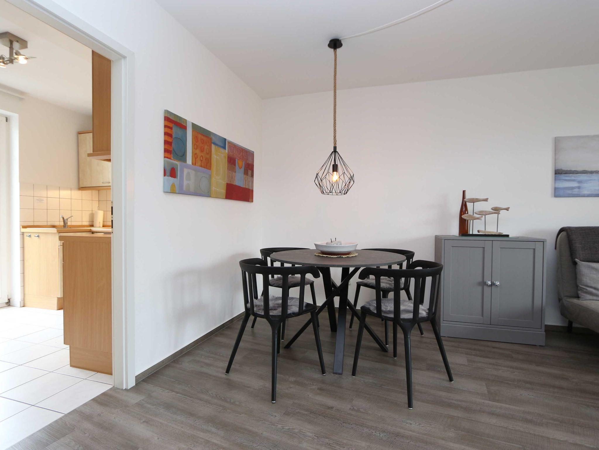 • Im Wohnzimmer befindet sich eine Sitzecke mit einem Schlafsofa und zwei Sesseln zusammen mit einem Flachbildfernseher und einem Internetradio. Der Esstisch bietet Platz für 4 Personen.
