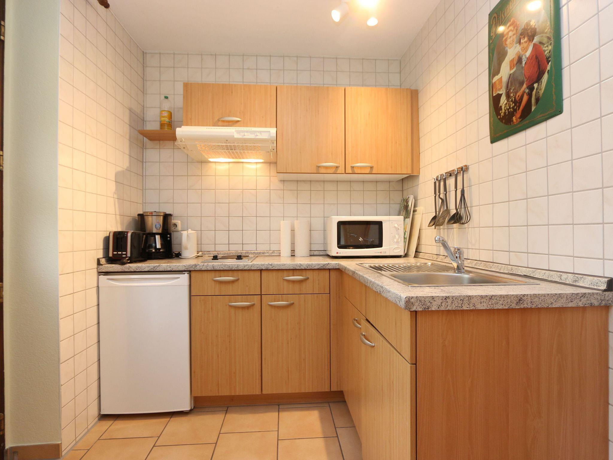 • offene kleine Küche mit Kühlschrank, 2-Platten-Kochplatten, Mikrowelle, Kaffemaschine, Wasserkocher, Spüle,