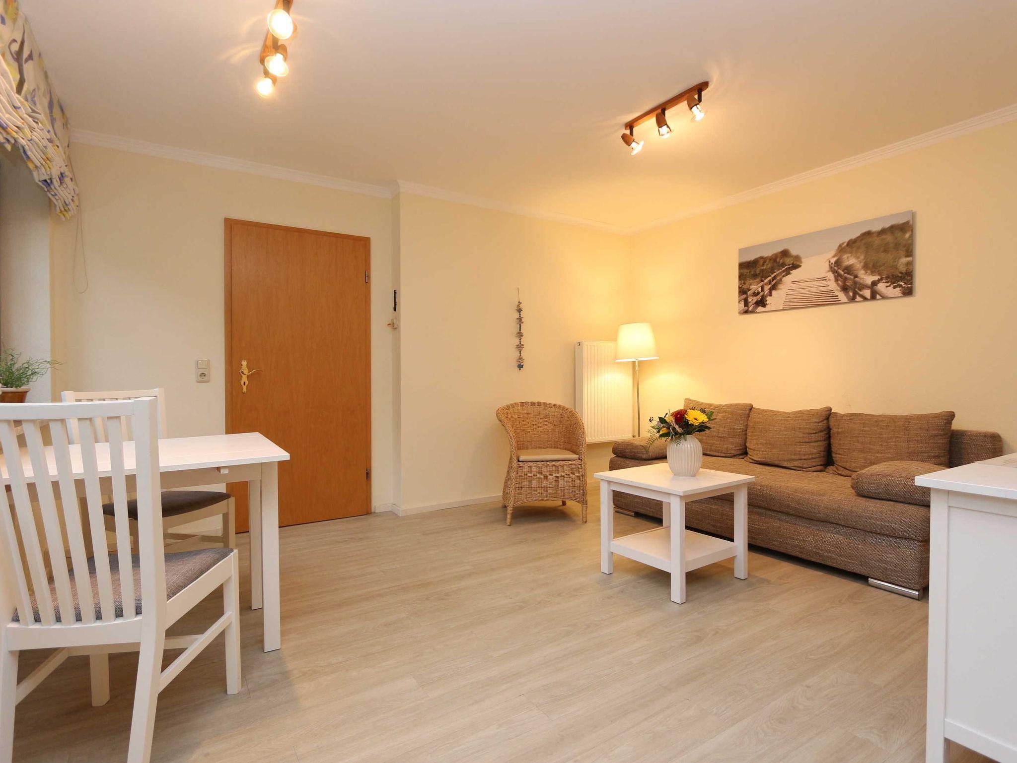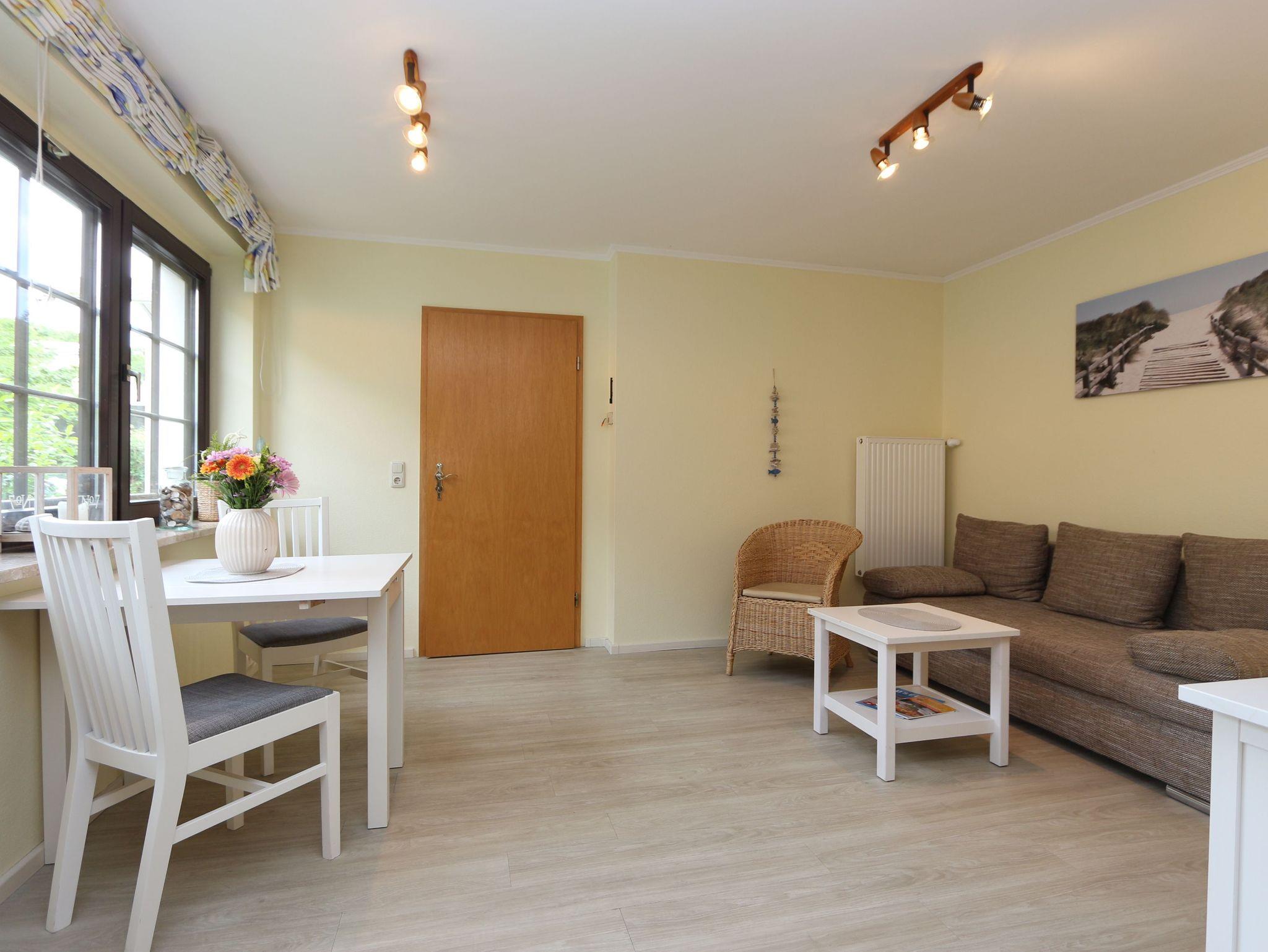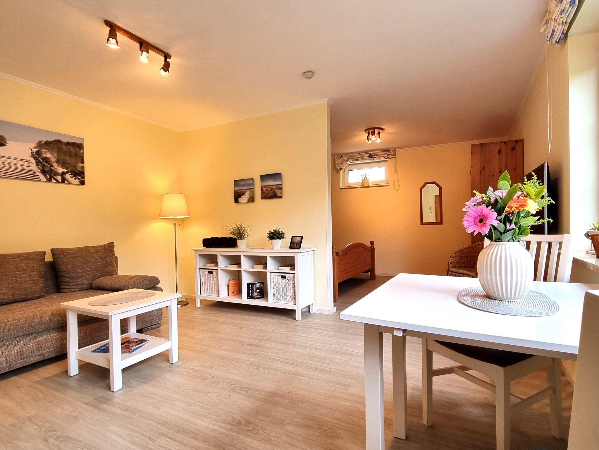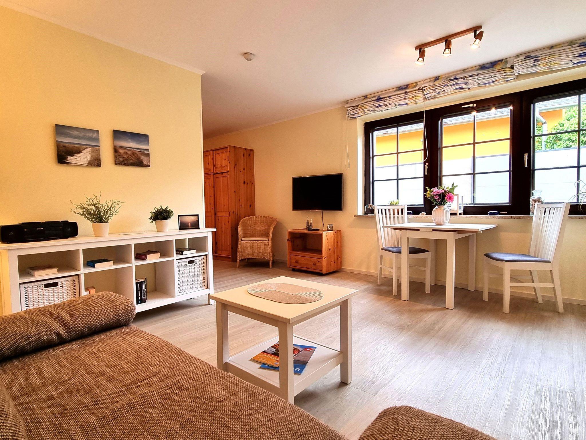• Wohnbereich mit Sofa, Couchtisch, Anrichte, Flachbildfernseher, Esstisch mit 2 Stühlen,